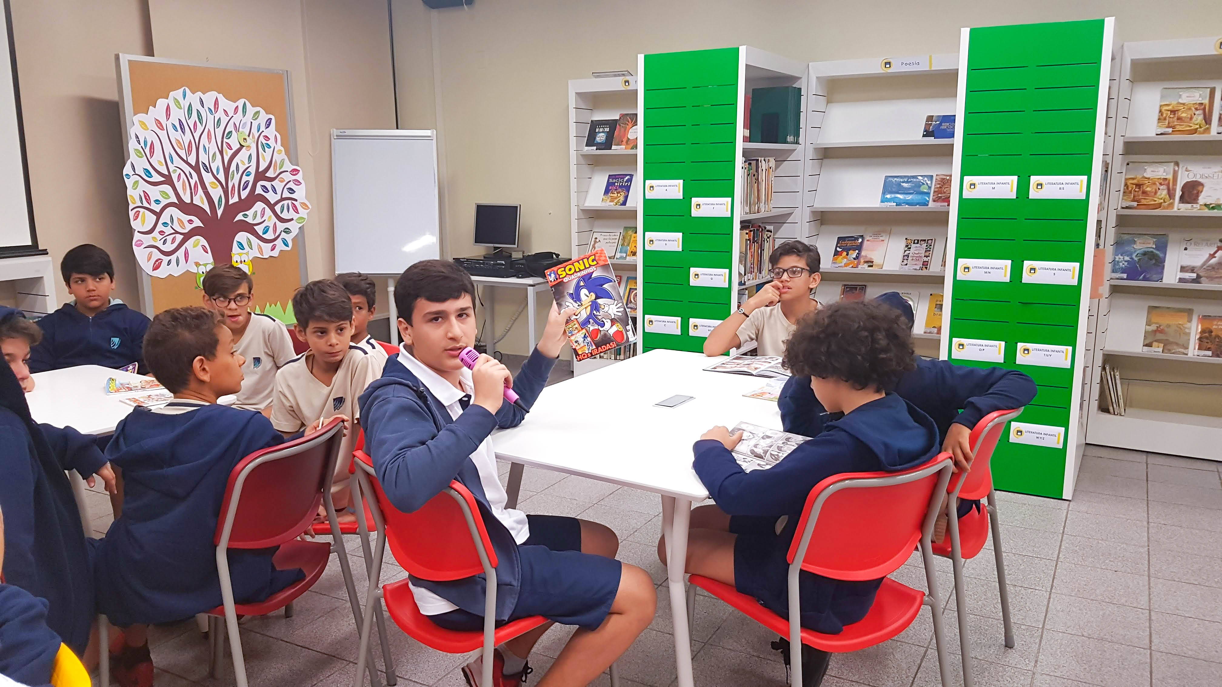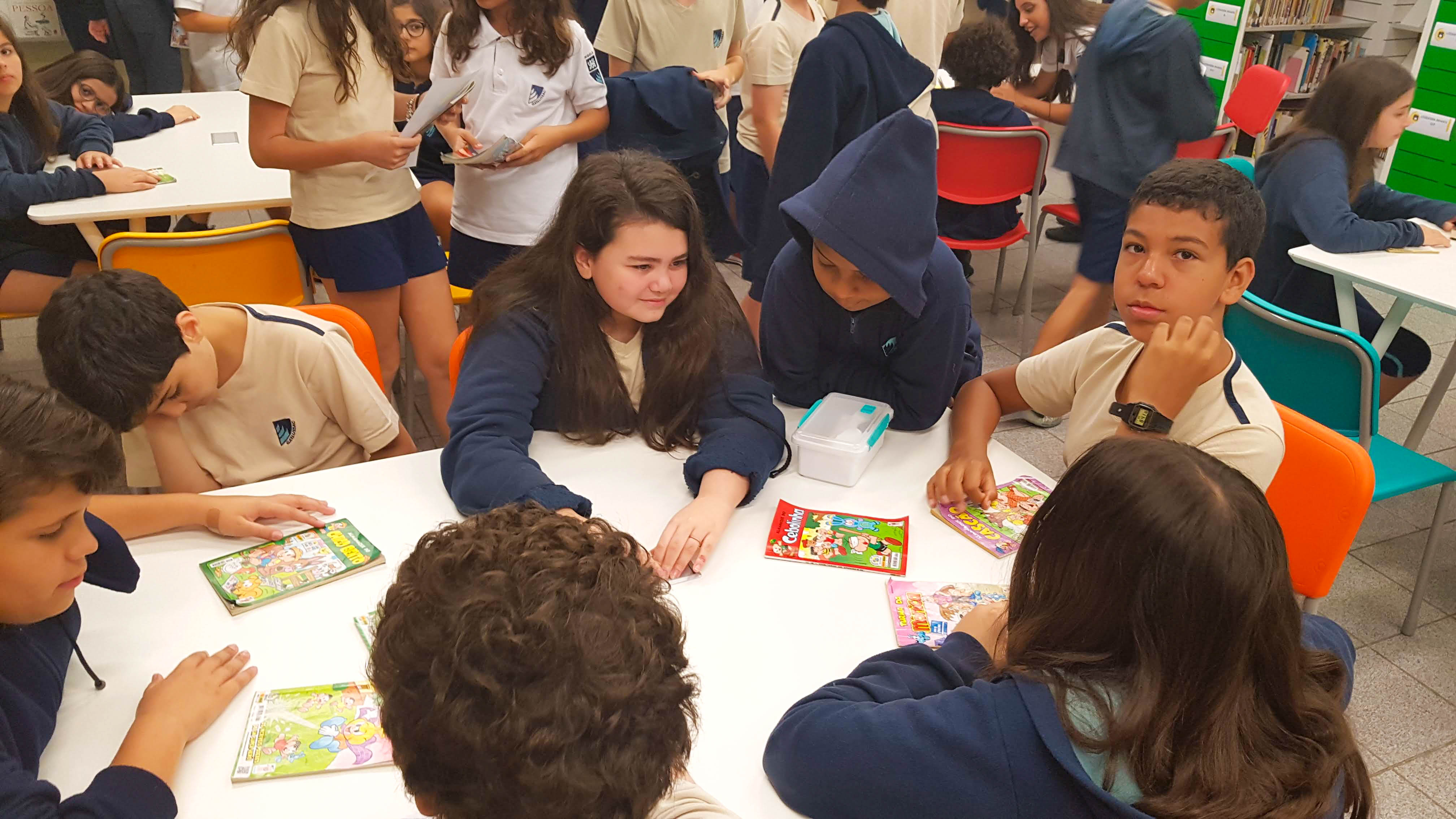 No ensino de Artes, as onomatopeias entraram em ação. Cores, formas geométricas e letras garrafais era ilustradas nas construções da Pop Art em críticas sobre o consumo exacerbado. Além da montagem das histórias e das onomatopeias, os alunos participaram de um troca-troca de HQs. Na biblioteca, junto aos professores Gustavo Abreu e Glaucia Mourão, as histórias que marcaram os alunos na infância foram trocadas com os colegas para que eles também pudessem viajar pelas páginas.