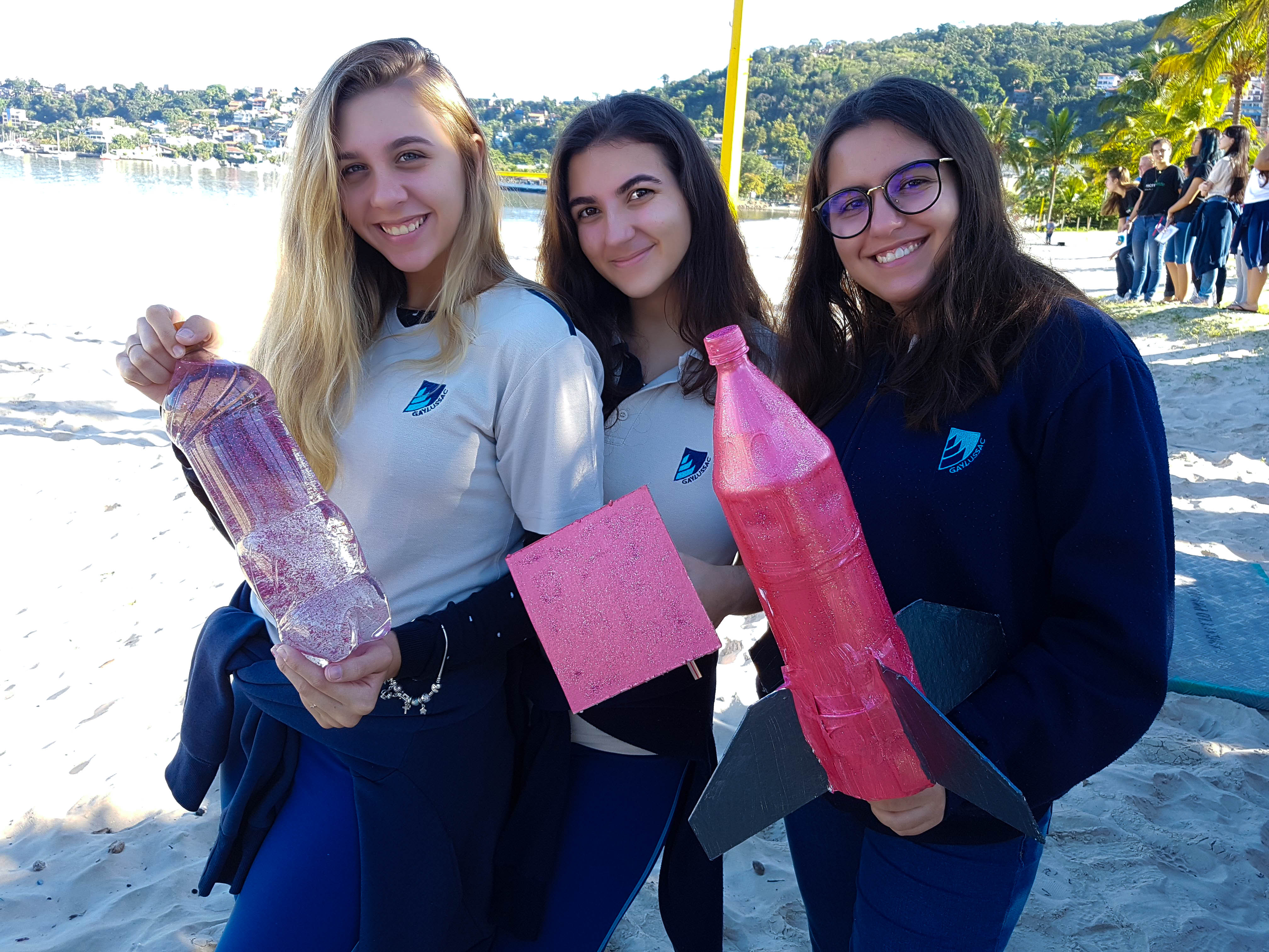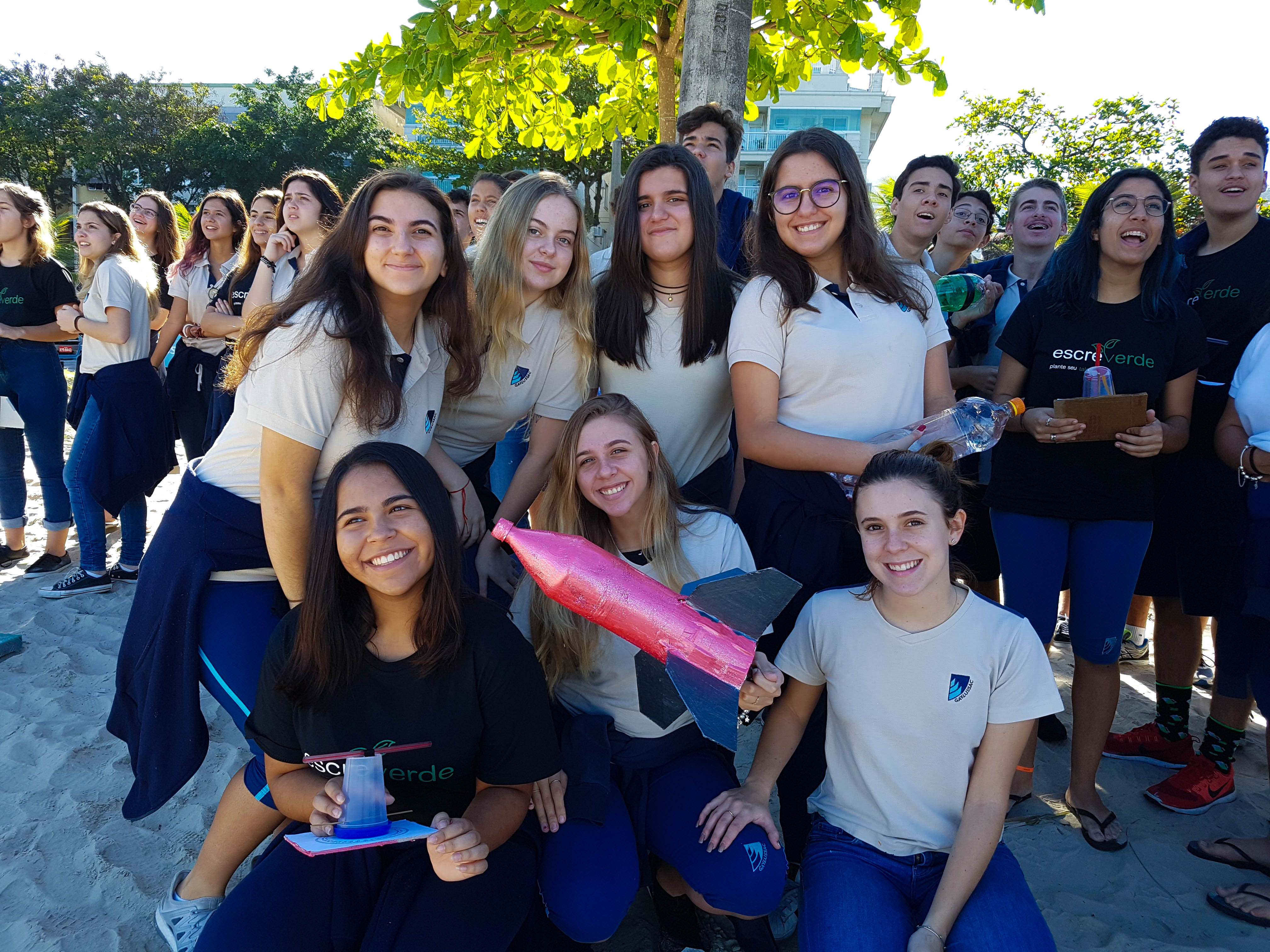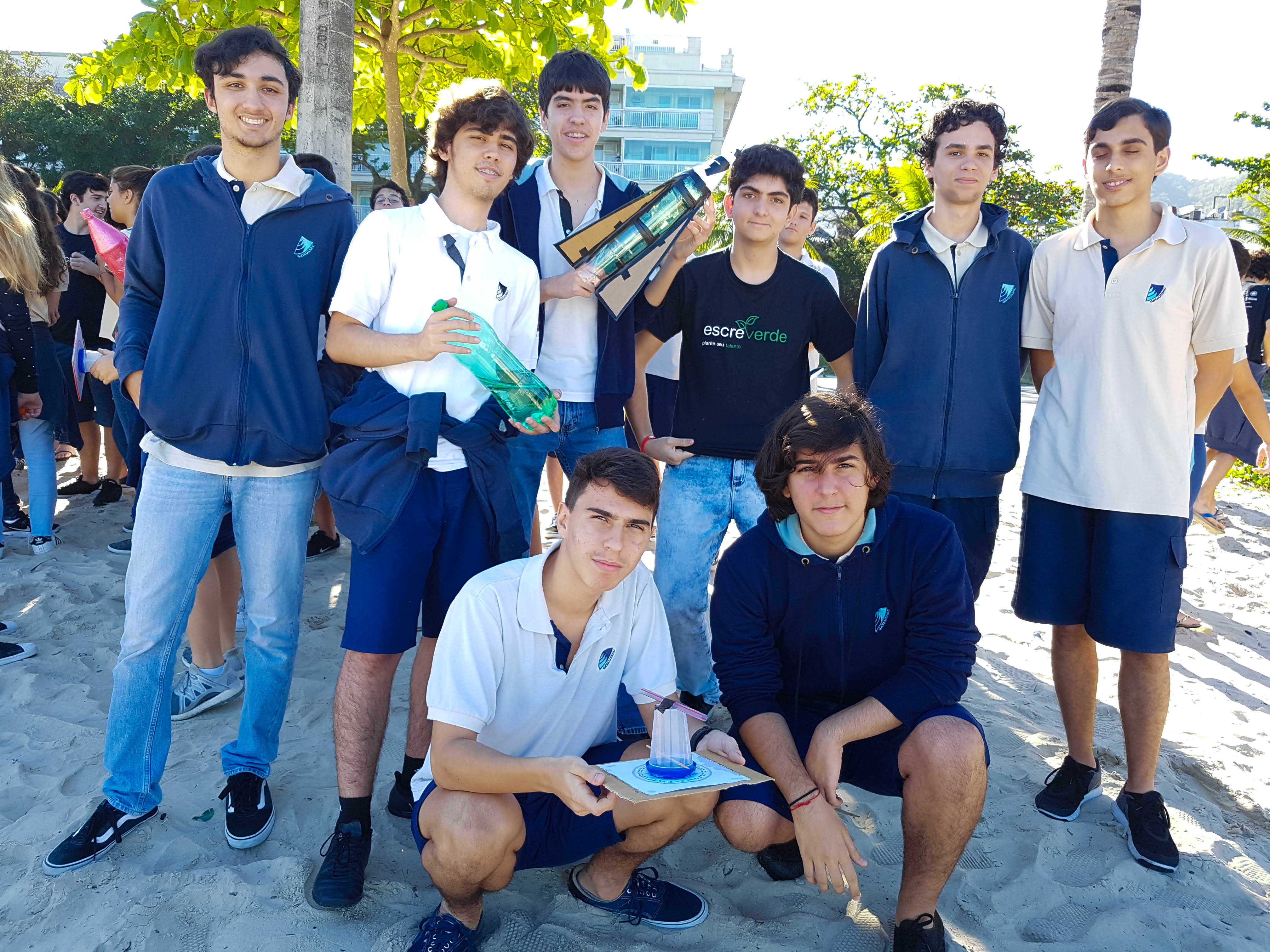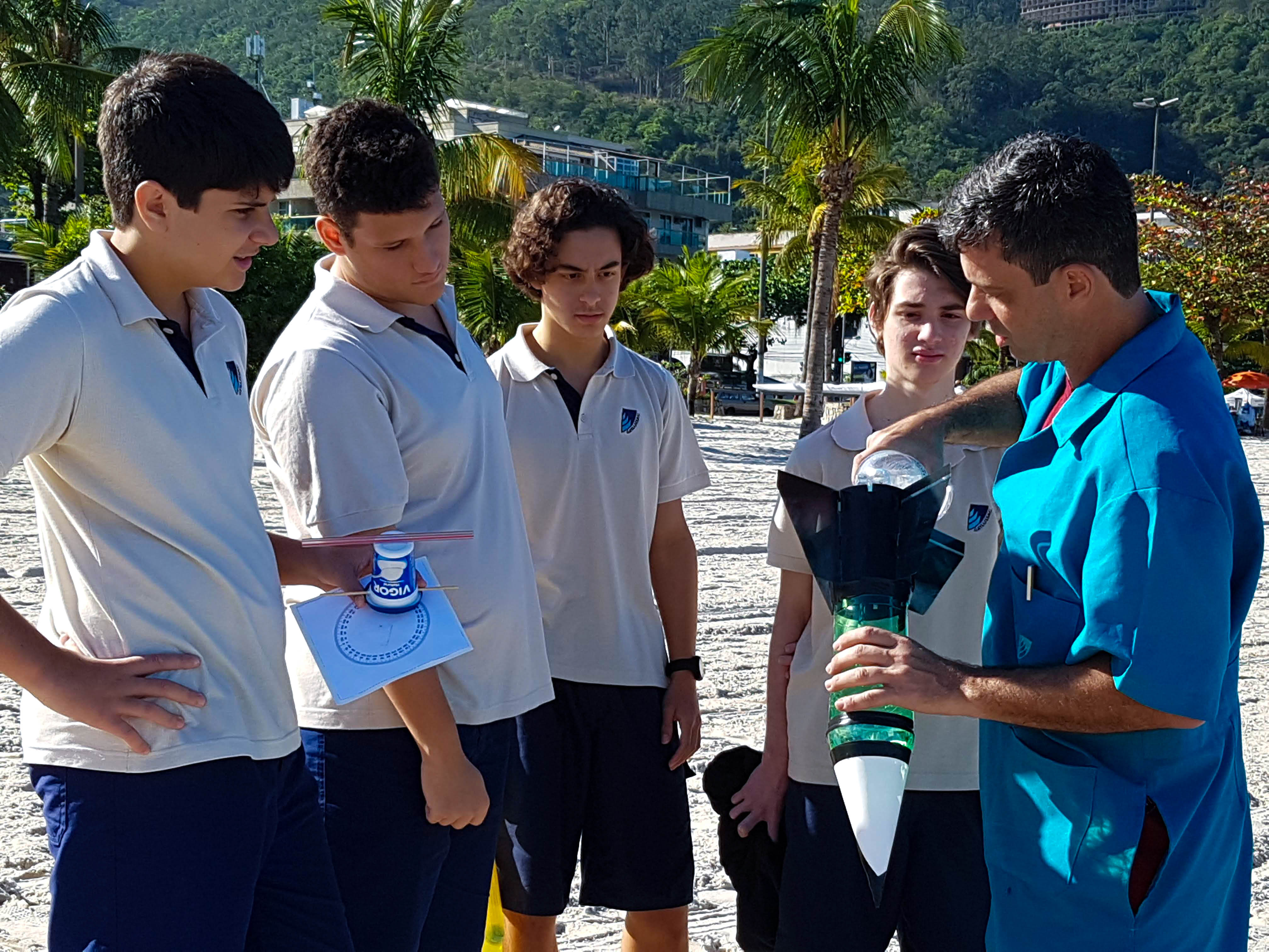 Muito aprendizado e experiência é o que compõe a interdisciplinaridade entre as matérias de Física e Matemática, na construção e lançamento de um foguete, em agosto, na praia de São Francisco. Os alunos da Segunda Série do Ensino Médio participaram do lançamento e levaram um mês para construir a nave, que foi feita com garrafa PET. Nessa experiência, os alunos foram divididos em 4 grupos por turma e foram acompanhados pelos professores Ricardo Viz, de Matemática, e Sandro Monteiro e Renata Cordeiro, de Física.