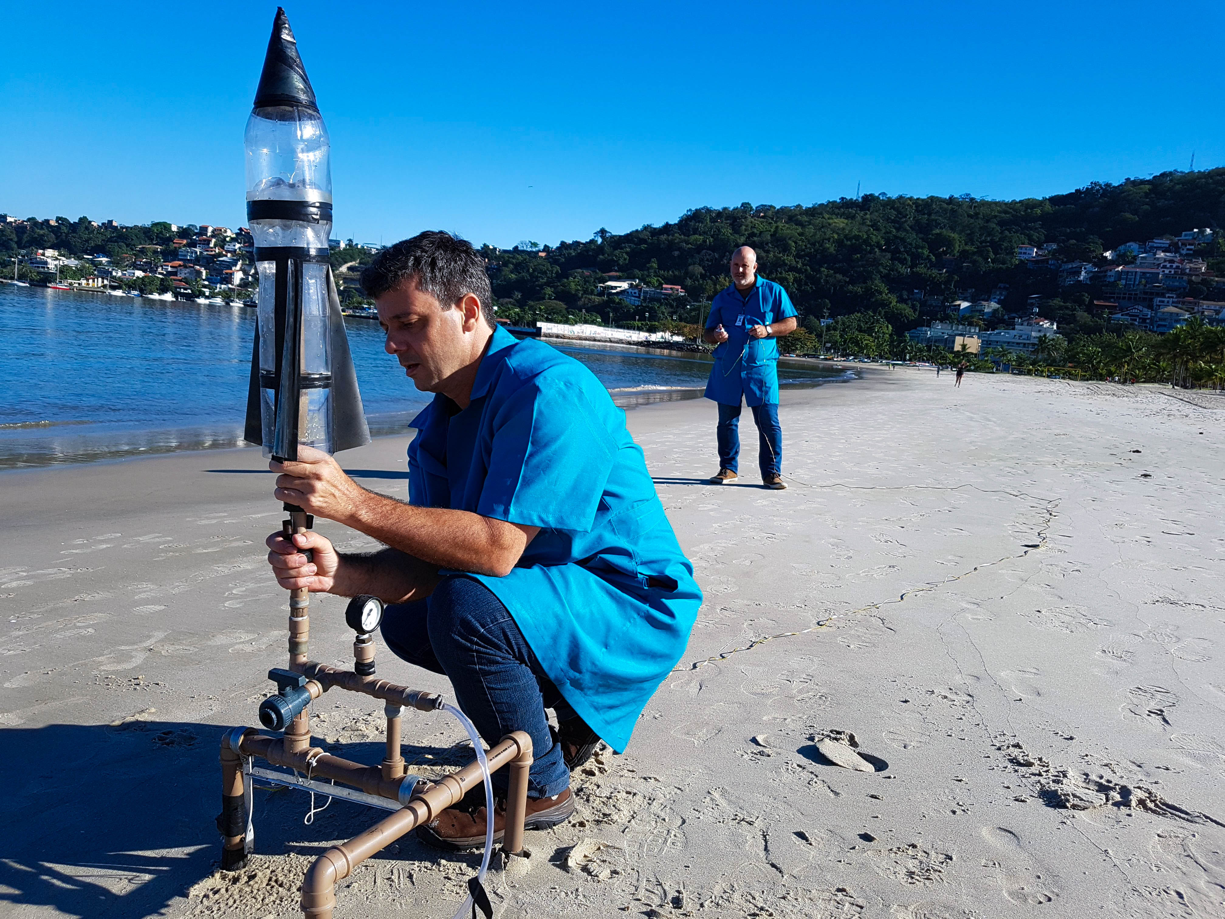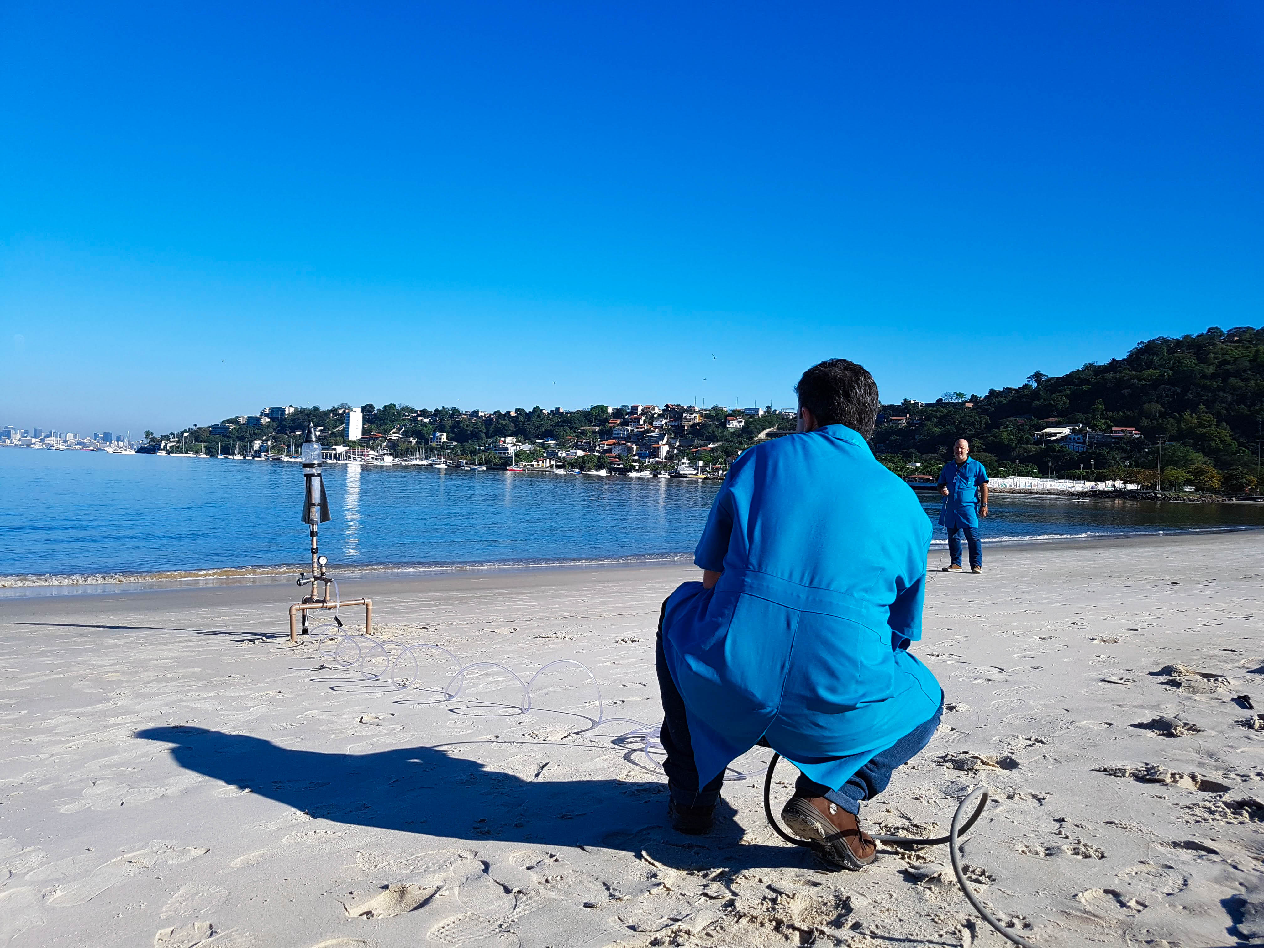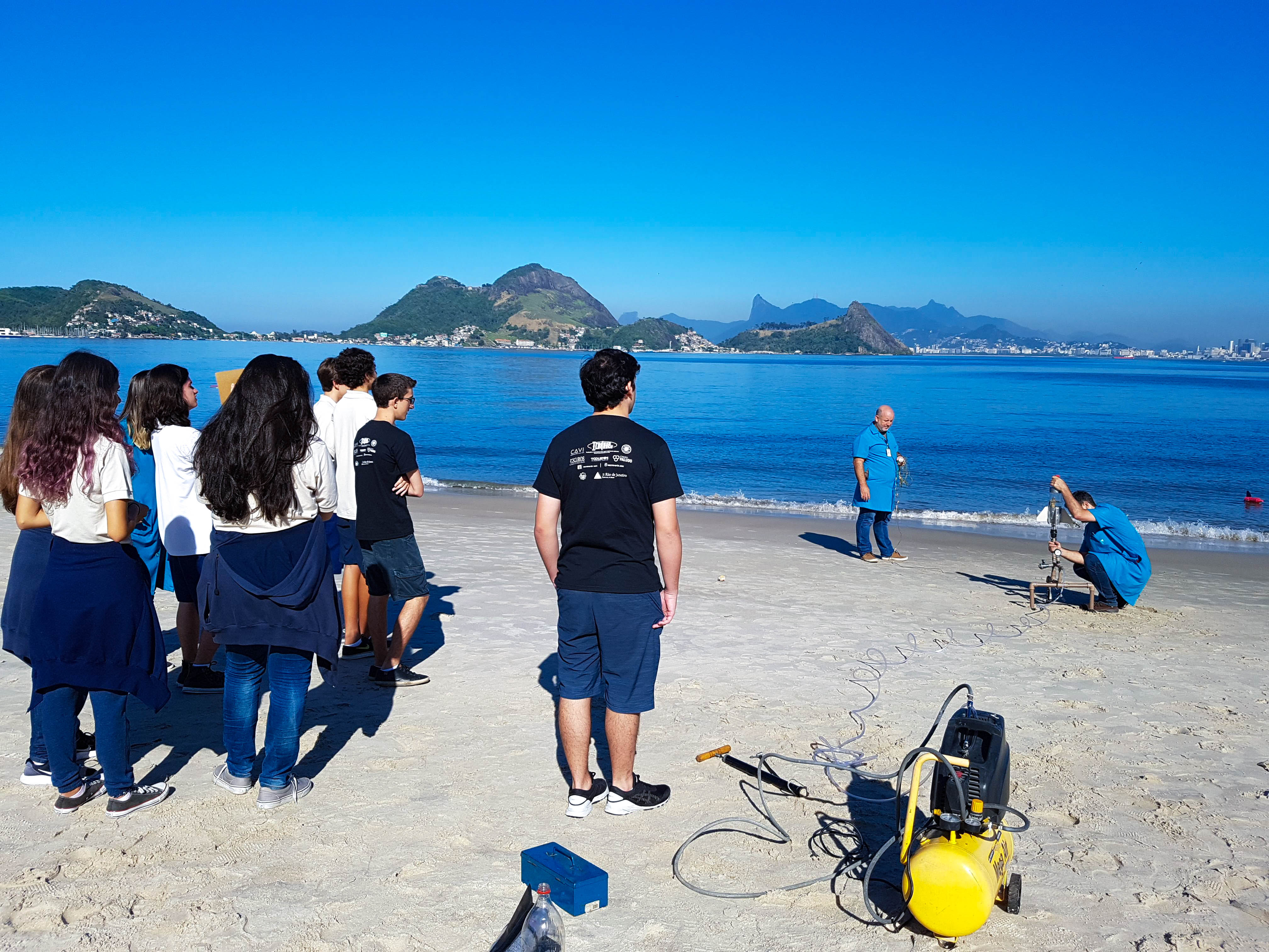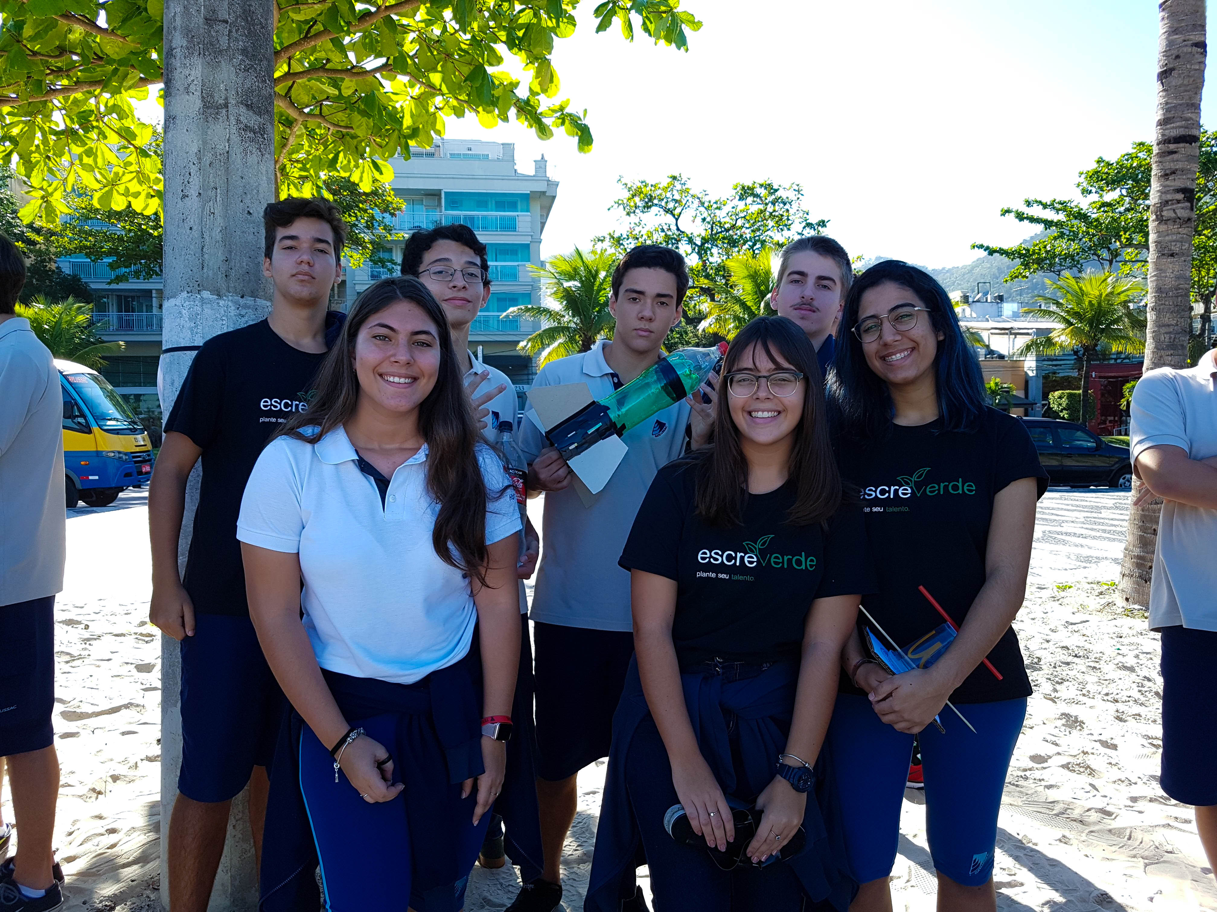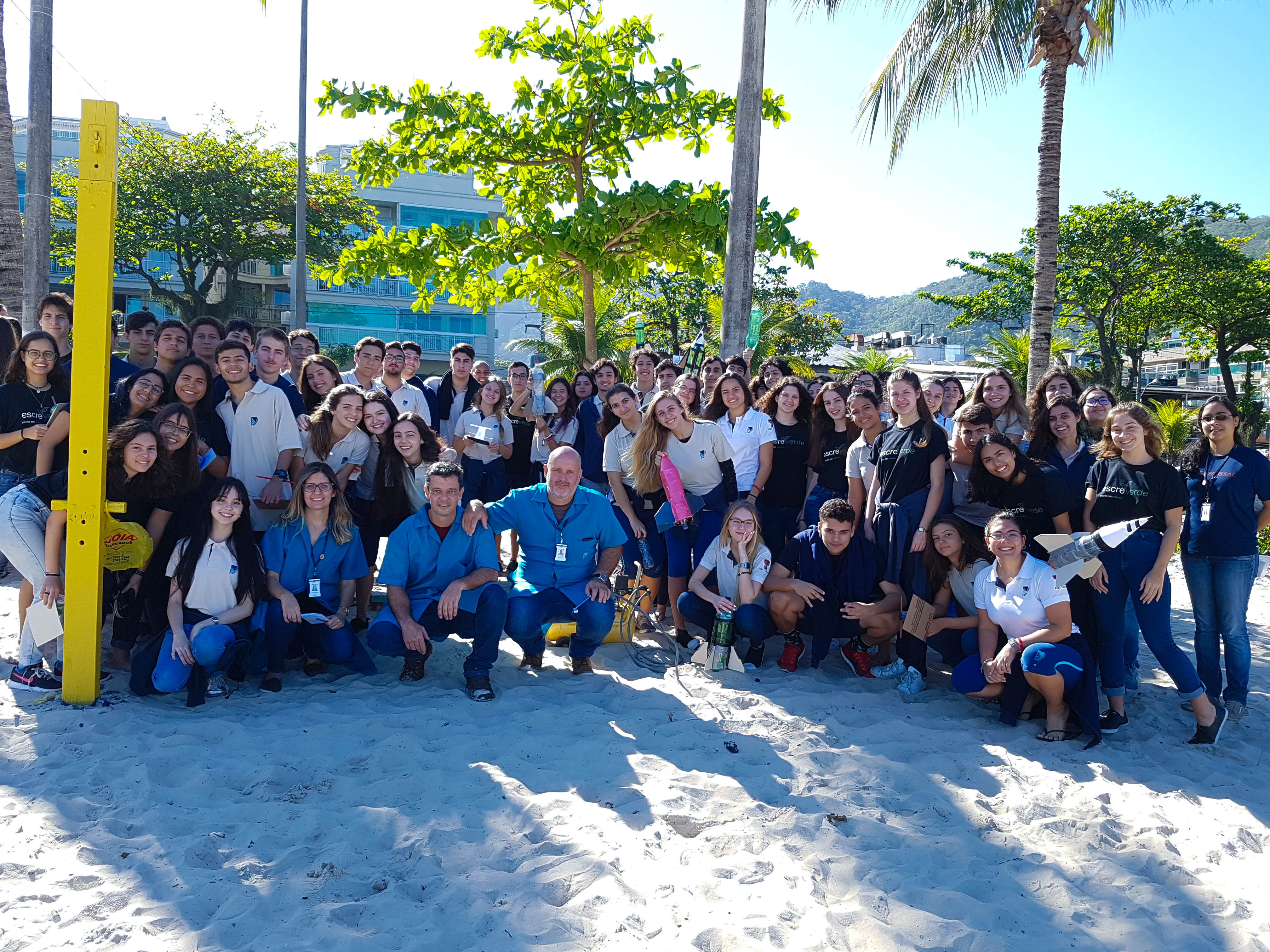 Muito aprendizado e experiência é o que compõe a interdisciplinaridade entre as matérias de Física e Matemática, na construção e lançamento de um foguete, em agosto, na praia de São Francisco. Os alunos da Segunda Série do Ensino Médio participaram do lançamento e levaram um mês para construir a nave, que foi feita com garrafa PET. Nessa experiência, os alunos foram divididos em 4 grupos por turma e foram acompanhados pelos professores Ricardo Viz, de Matemática, e Sandro Monteiro e Renata Cordeiro, de Física.