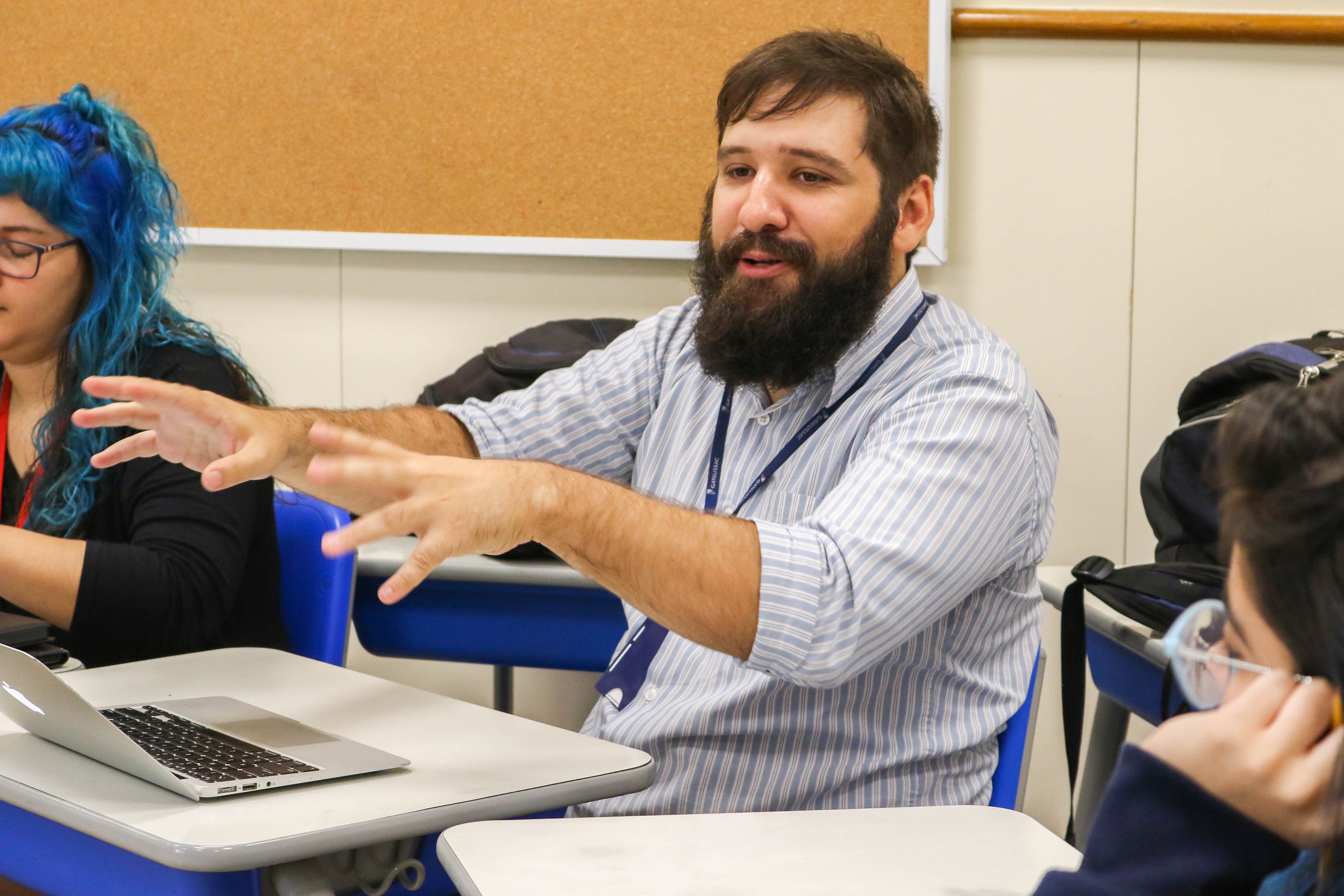 “Todo pensamento e toda palavra que eu escrever serão só meus e de meus muitos personagens”. A frase do professor Danilo Crespo, de Inglês, marcou a tarde dos alunos em uma Oficina de Sarau e Poesia. Trabalhando o tema “Eu sou o outro”, o encontro levou os alunos a escreverem coisas que ainda não haviam pensado enquanto compartilhavam suas ideias e sentimentos. O professor explica: “Acima de tudo um texto precisa ter coragem e sinceridade. Uma poesia rimada não é necessariamente bonita. Uma poesia é para dizer algo necessário. Se escreve primeiro para si, depois para o outro”.