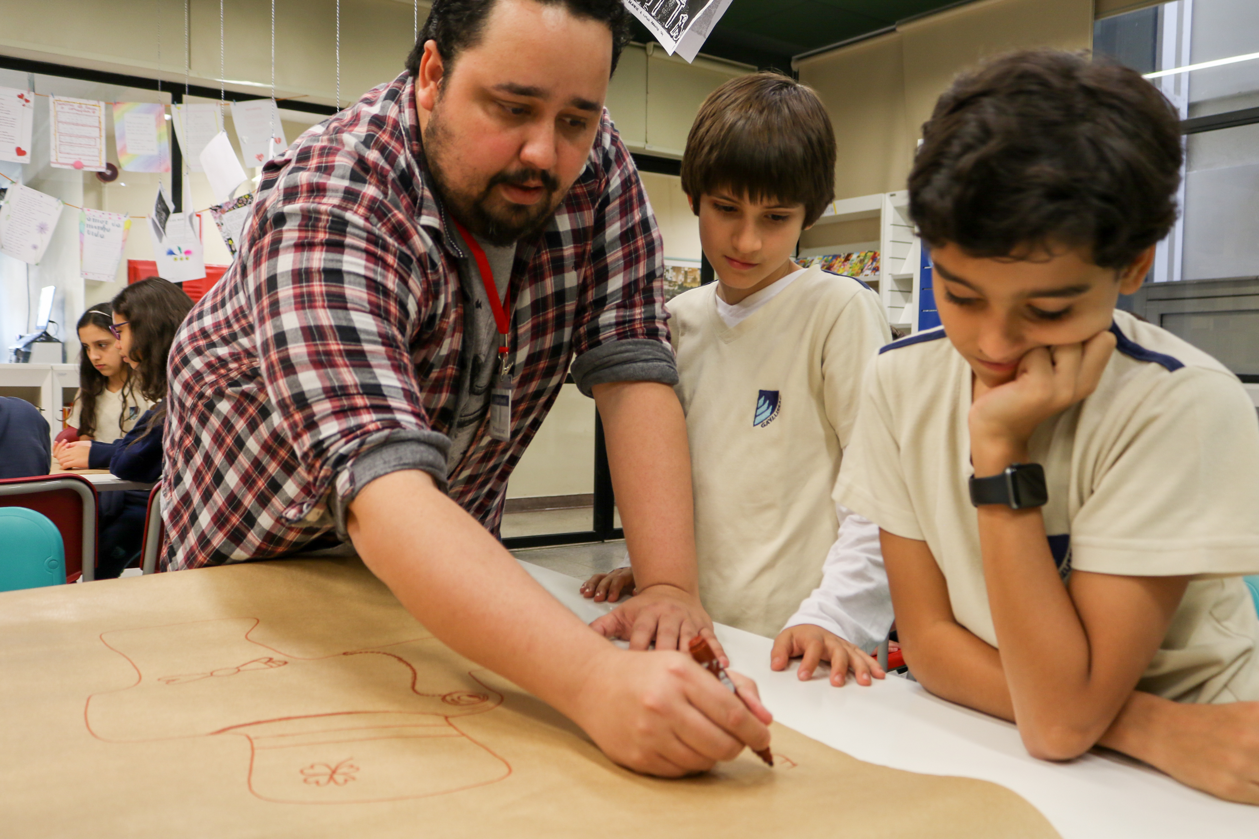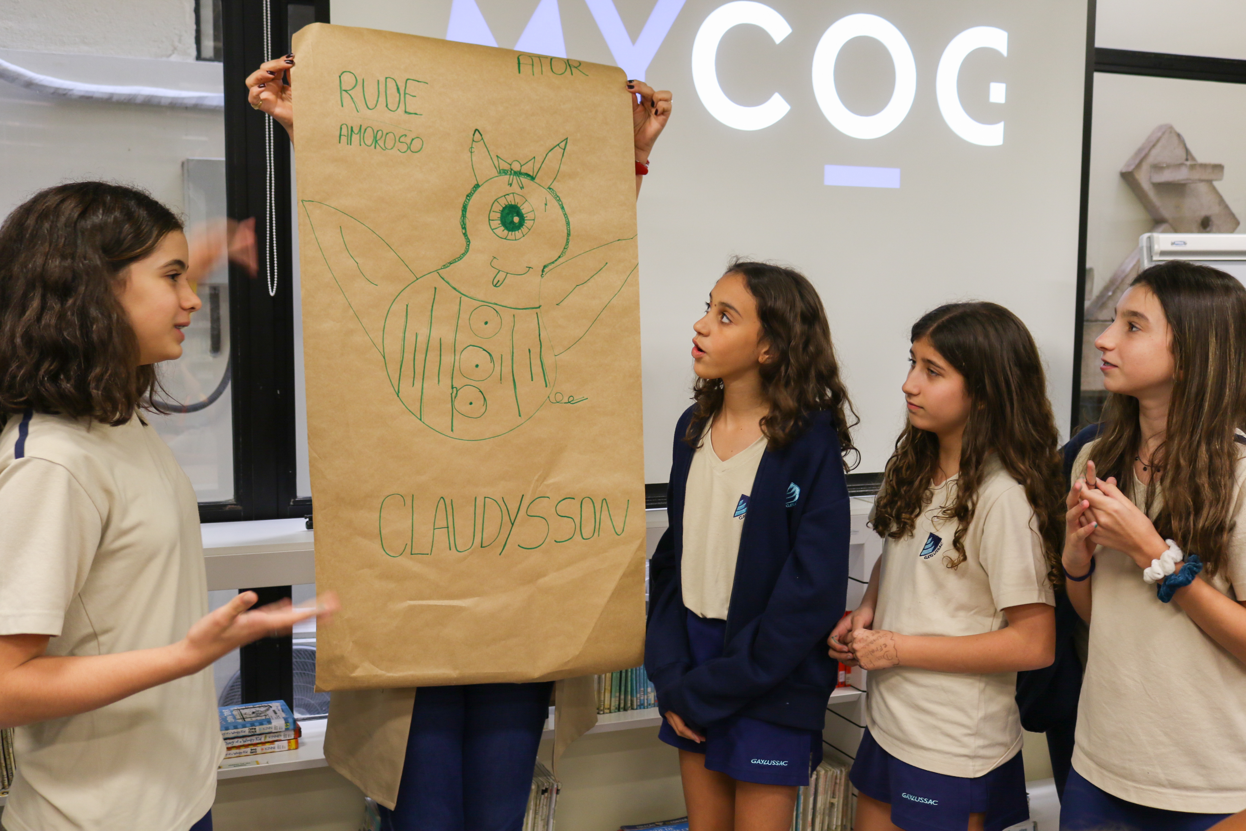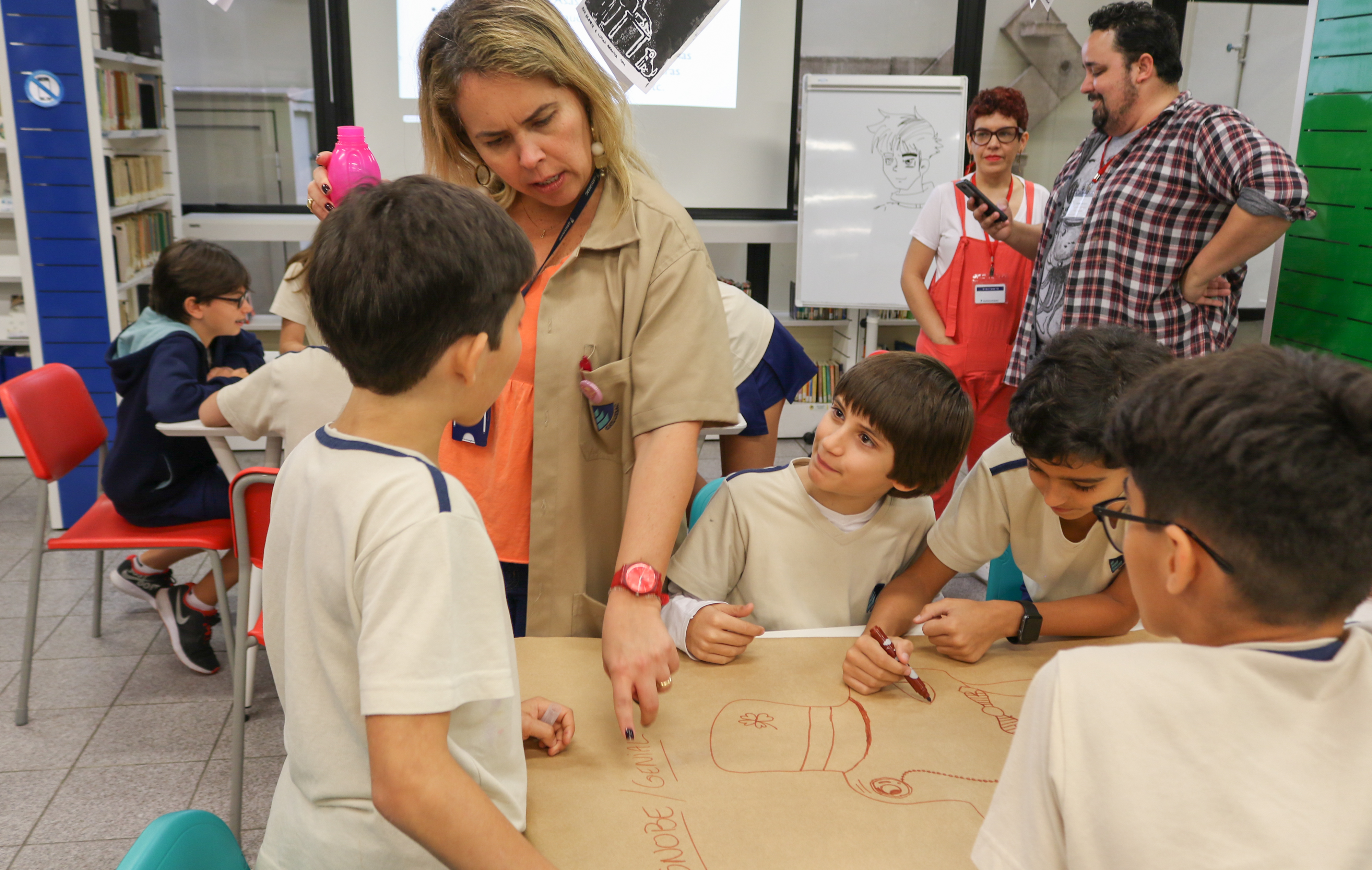 “Alguma coisa acontece quando contamos histórias através de imagens”. A frase de Clara Gomes, cartunista e criadora da tirinha Bichinhos de Jardim, foi o que embalou os alunos do 6º ano do Ensino Fundamental, em agosto, na Oficina de Quadrinhos que criou Mc Gaguinha, Arlindo Clayson da Silva Clovis e o Superamendoim. Do roteiro à finalização, a oficina levou aos alunos à história do cartum e os processos de criação de uma HQ. Com as dicas e de maneira coletiva, os alunos construíram o seu próprio personagem, cada um escolhendo uma característica física e subjetiva, criando uma forma única.