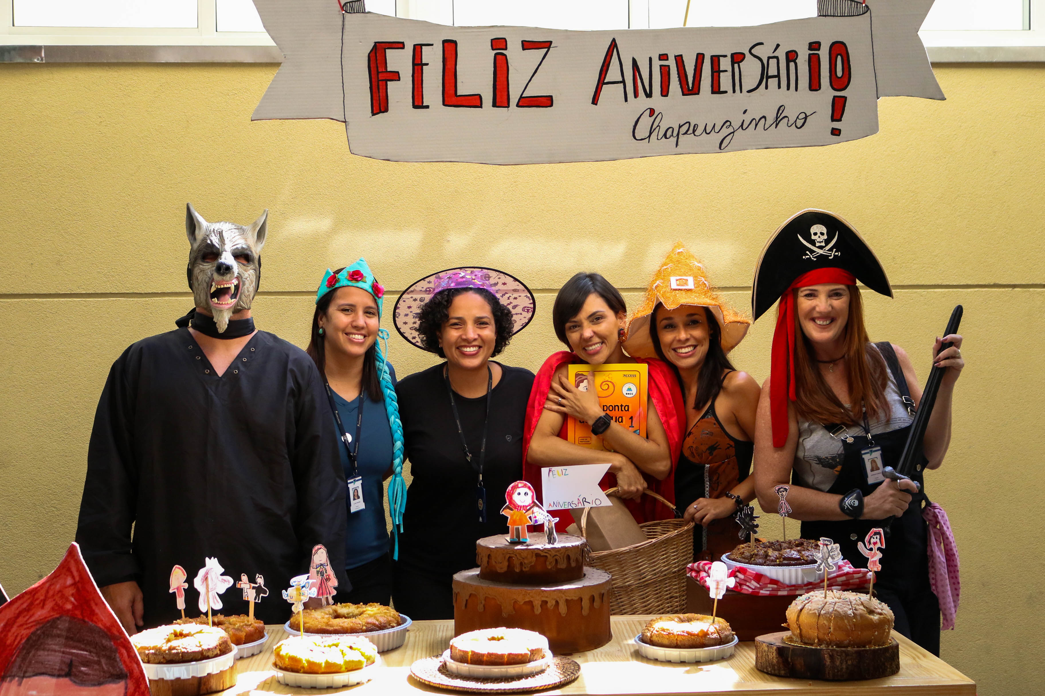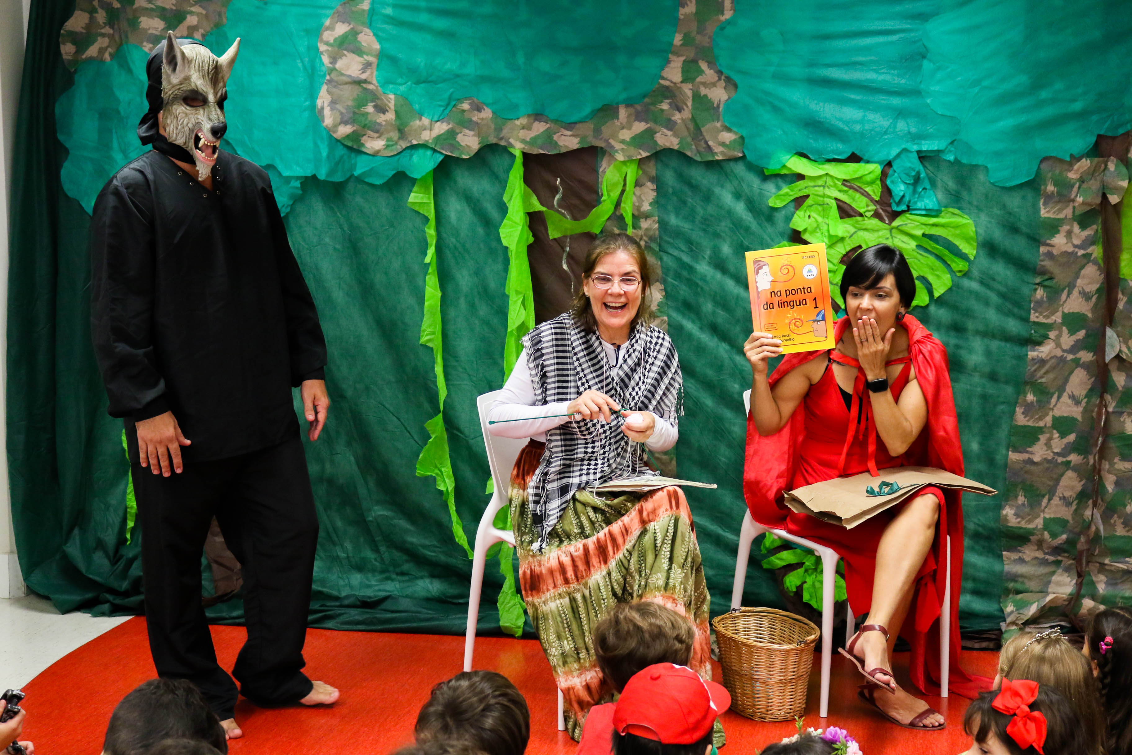 Para a festança, os alunos foram fantasiados dos mais diversos personagens e entraram no mundo mágico das histórias infantis. Entre muita diversão, dança e brincadeira, o Lobo Mau apareceu trazendo de presente à Chapeuzinho um pacote misterioso. Dentro dele, o protagonista do dia, o novo livro de Português!