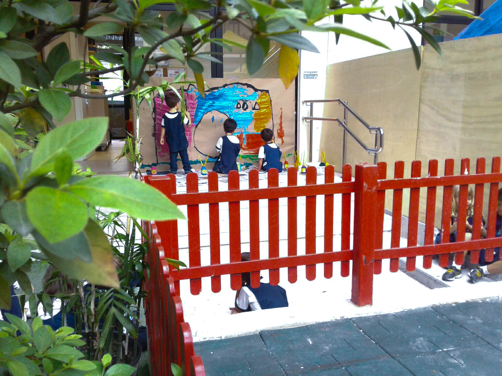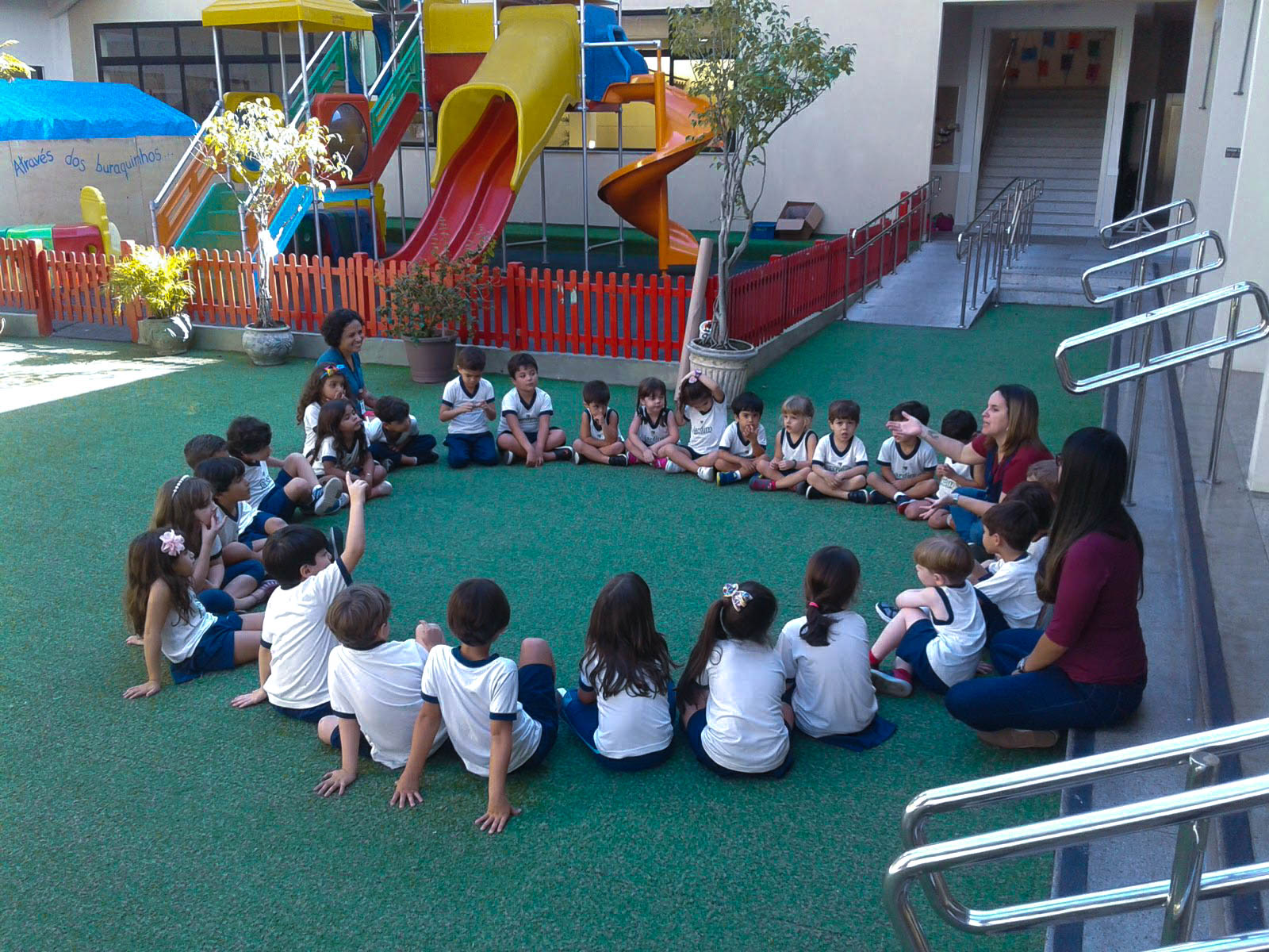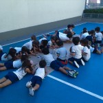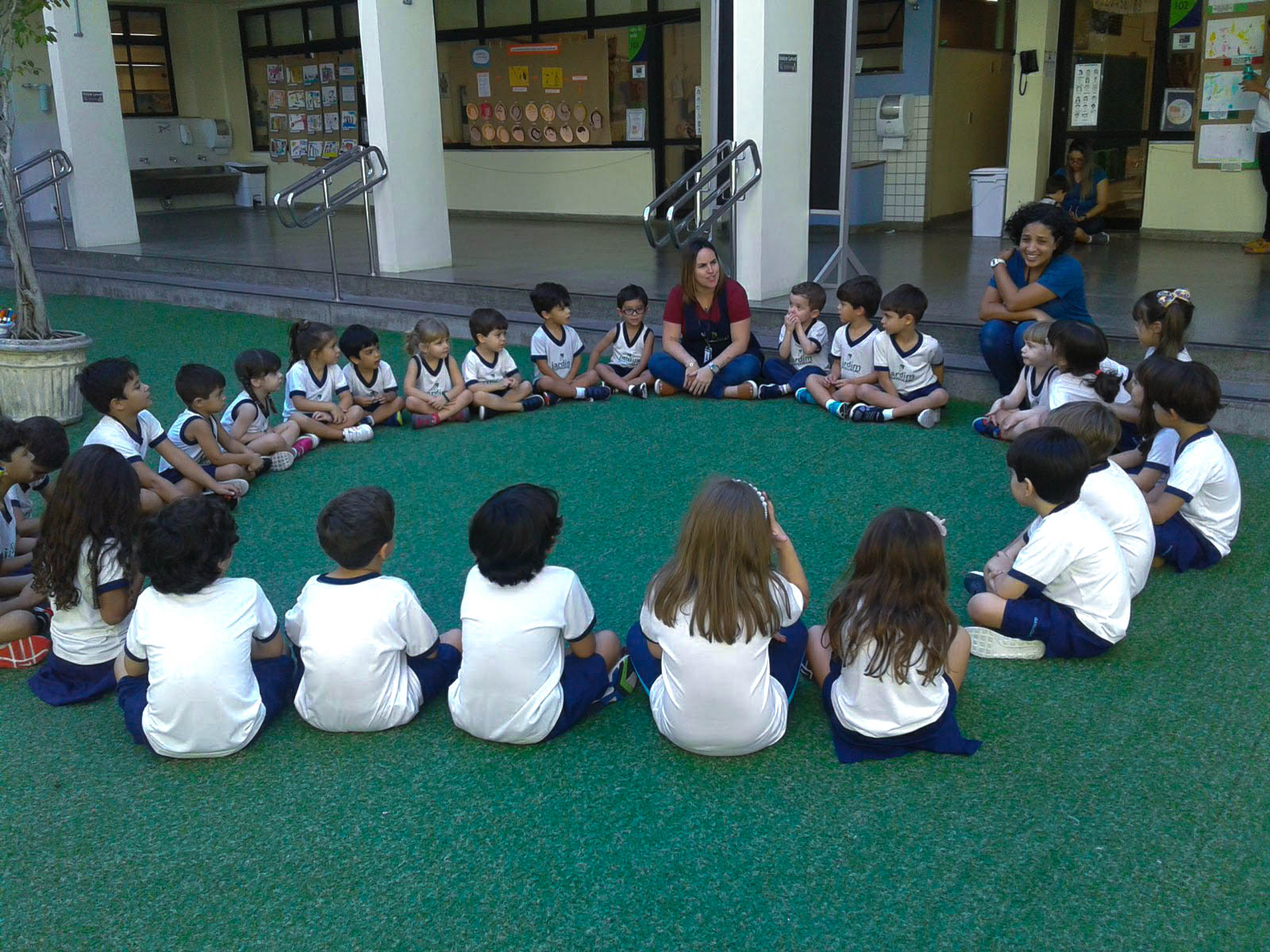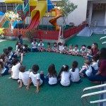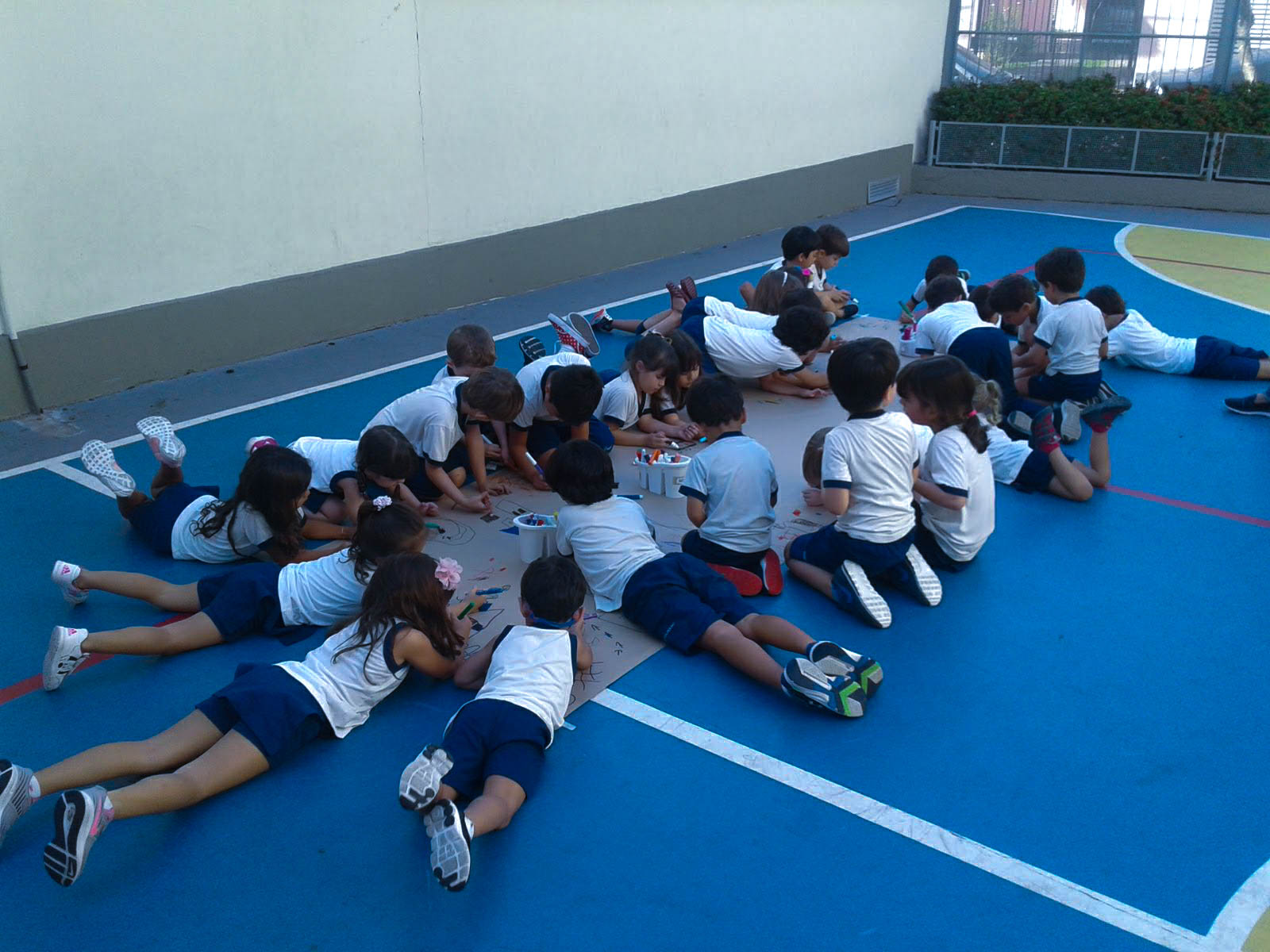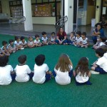 Empolgados com os novos conhecimentos, as turmas do Jardim 1 fizeram trocas sobre seus estudos com as turmas do Jardim 3. O projeto foi finalizado com um desenho coletivo feito simultaneamente pelas duas séries.