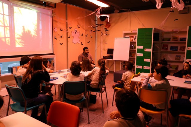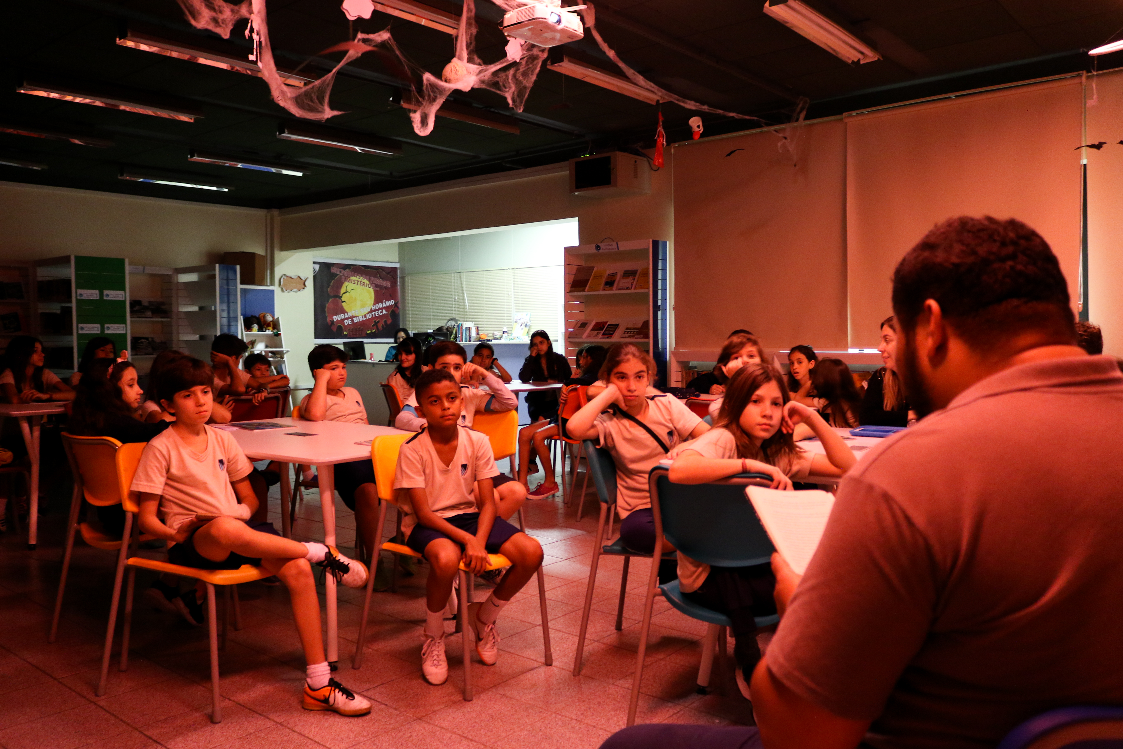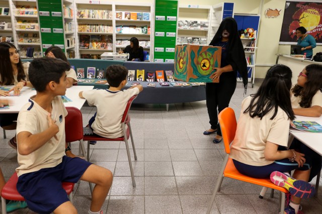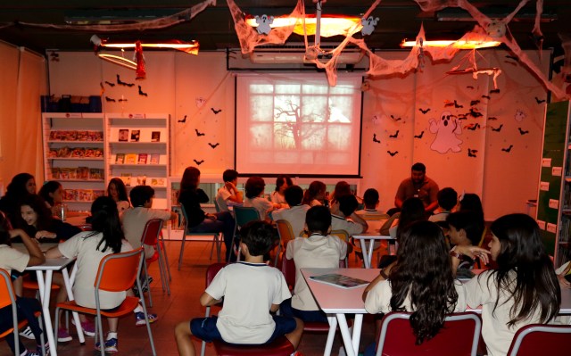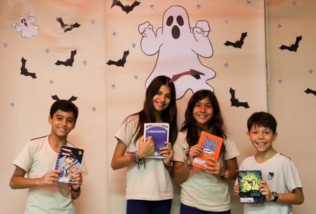 O lago dos Monstros, A Menina e o Vampiro e O fruto da figueira Velha, através de 7 ossos e uma maldição. Em outubro, esses contos instigaram a curiosidade e o anseio de leitura dos alunos do 2º ao 5º ano do Ensino Fundamental, na Biblioteca Sylvia Orthof. Fantasmas, morcegos, teias de aranha e sons de raios adentravam as paredes da biblioteca, que foi ambientada assustadoramente para recebê-los e fasciná-los com histórias arrepiantes, introduzindo-os em um novo gênero.
