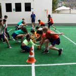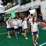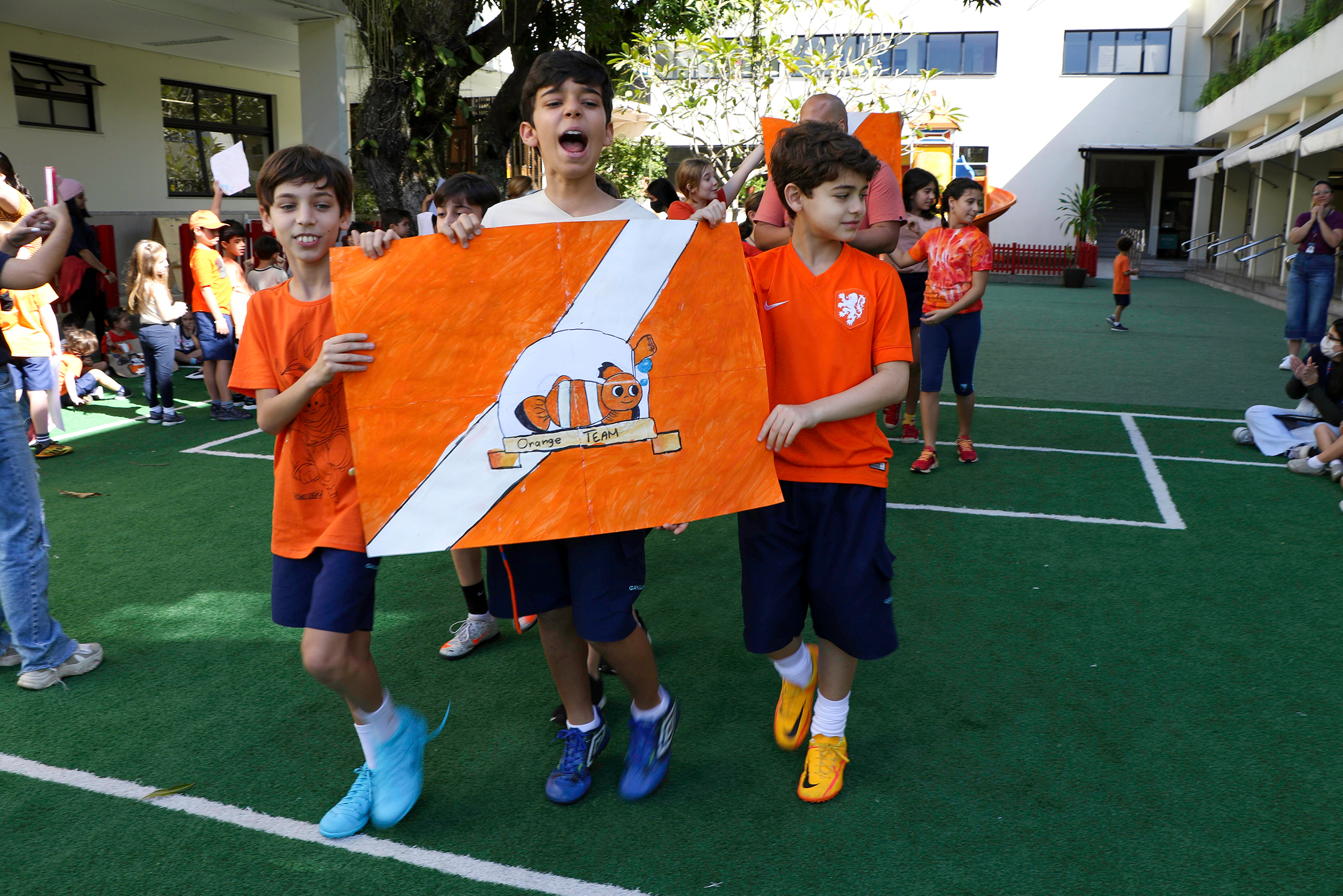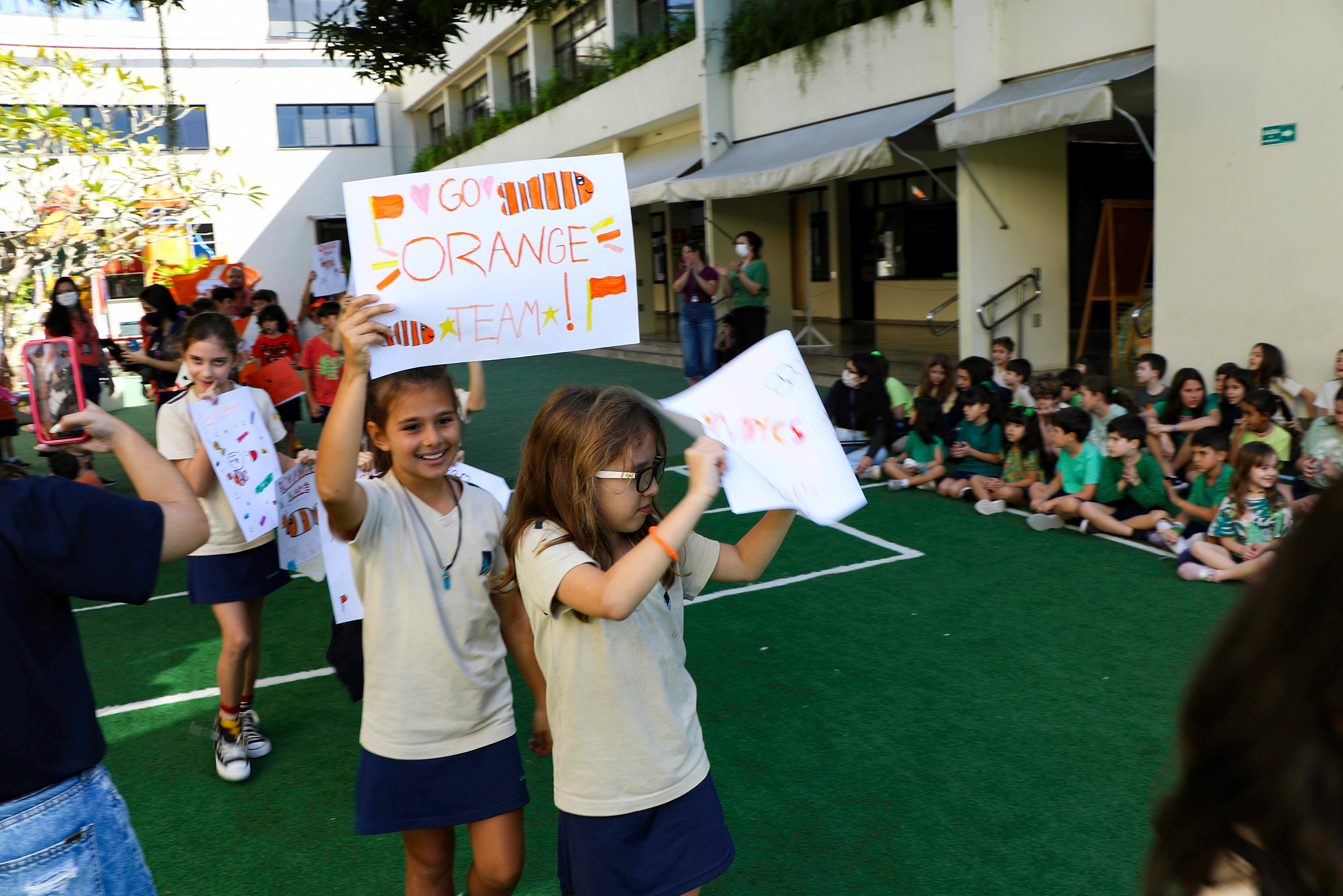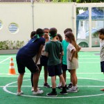 Os grupos estavam divididos em dois times sendo eles Orange Team e Green Team e cada um confeccionou sua bandeira e battle cry, além das mascotes: AkatShrek para os verdes e Orange bubbles para o time laranja. Antes de começar de fato a semana imersa em esportes e muita torcida, os alunos tiveram um “esquenta” especial. Capoeira, Knockdown, Dodgeball e The Filling Basket Game, marcaram as manhãs e todos já estão muito empolgados, como disse Gianlucca da turma Dublin: “I love the fact that we can play in groups in the competition and we feel happier. I like sports in general, so it’s very fun”.