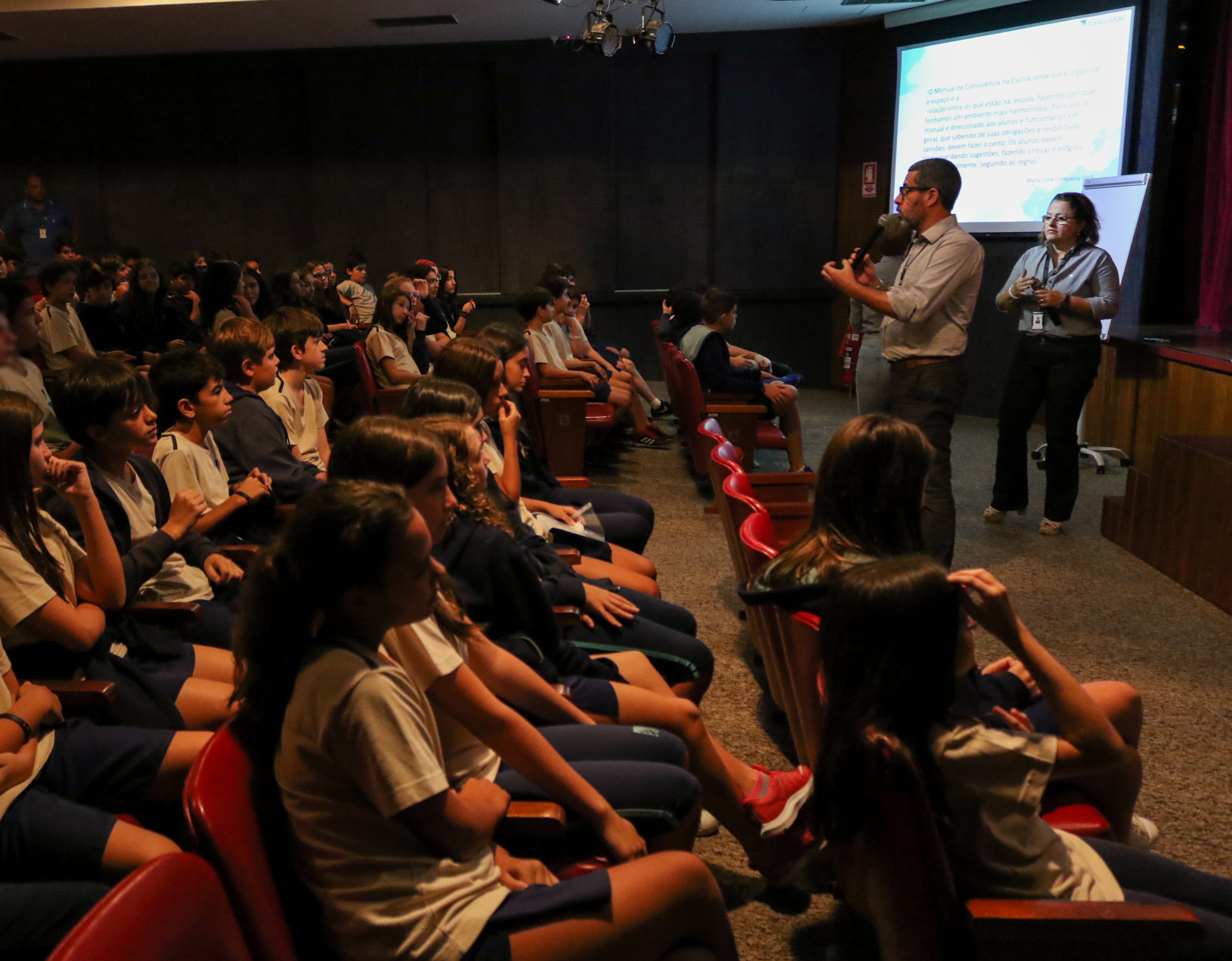 Uma democracia exige de seus cidadãos o debate, a opinião e a construção conjunta. A multiplicidade de vozes presentes em decisões políticas da mais alta e complexa à mais simples instância garante o desenvolvimento mais justo e igualitário de uma sociedade. Para que uma democracia se construa de maneira sólida, a escola deve exercer papel central na construção dessa multiplicidade de vozes. Por isso, desde cedo nossos alunos são incentivados a se envolverem nos assuntos políticos do dia a dia escolar. Assim, as turmas do 7º ano do Ensino Fundamental, na aula de Cidadania e Salvaguarda, convidaram a direção da escola para um bate-papo sobre o Manual de Convivência Escolar, levando críticas e sugestões para um melhor desenvolvimento acadêmico.