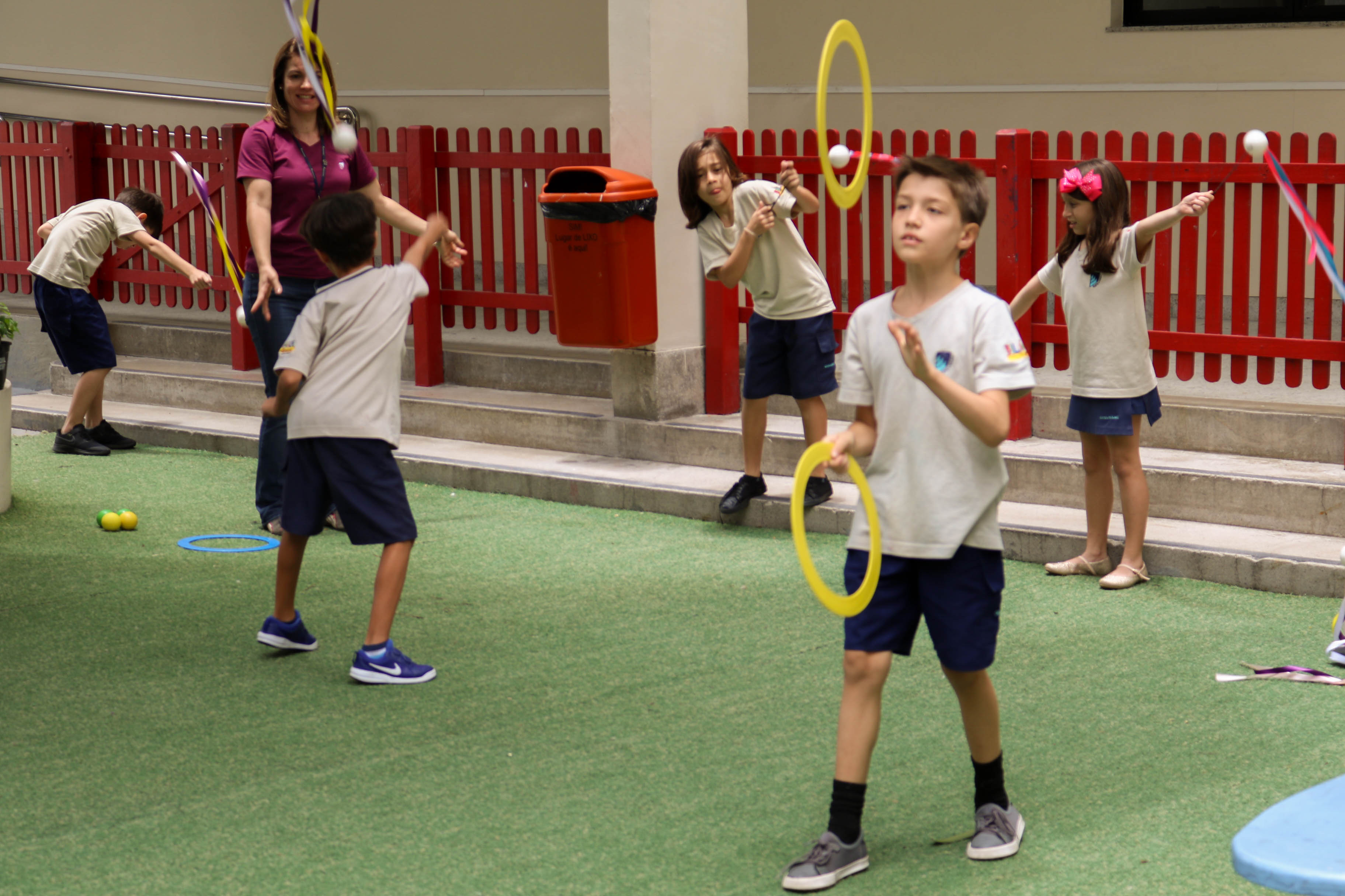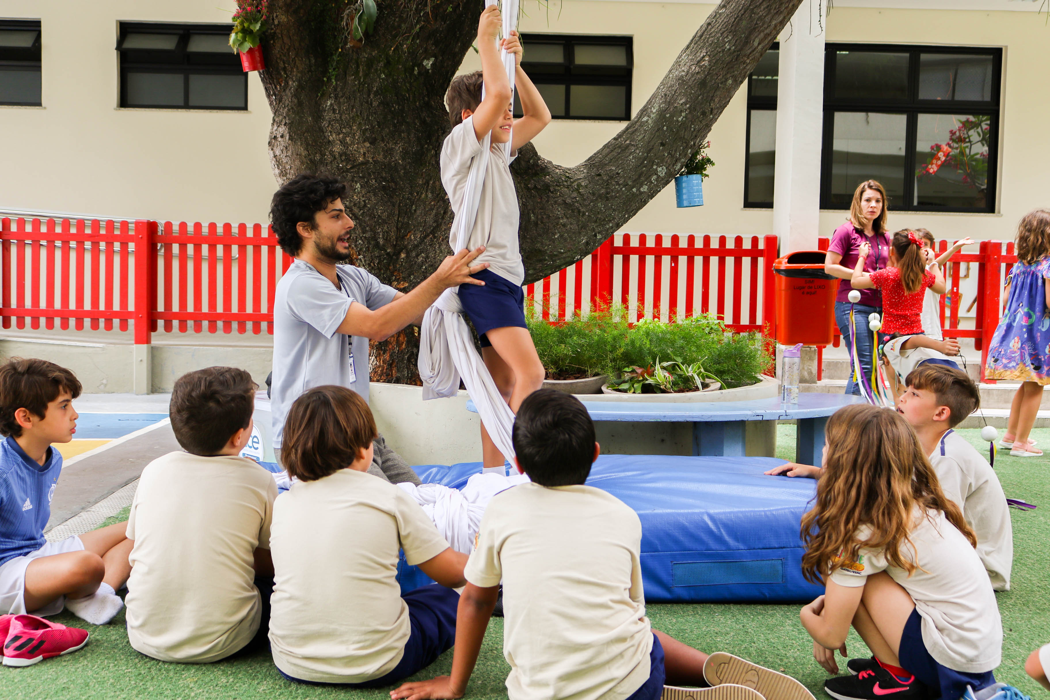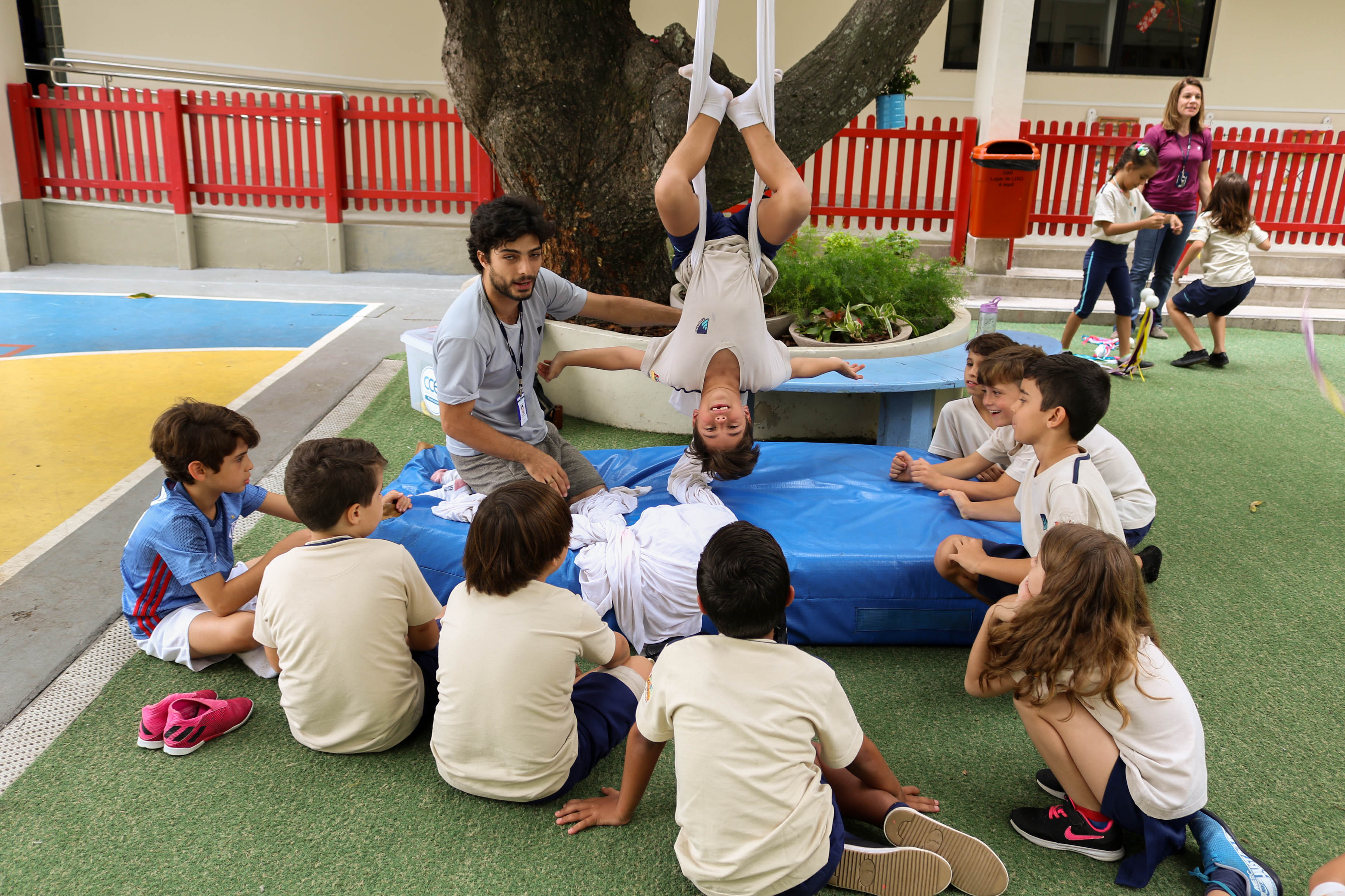 Disciplina, concentração, cooperação, foco, criatividade e diversão! Em dezembro, para contemplar a unidade “The Circus is Coming to Town” do International Primary Curriculum (IPC), os alunos do 2º ano do Projeto Bilíngue participaram de um Circus Workshop, com o professor de Teatro Raphael Pompeu, em que fizeram acrobacias no tecido, pularam na cama elástica, caminharam com pernas de lata e praticaram malabares.
