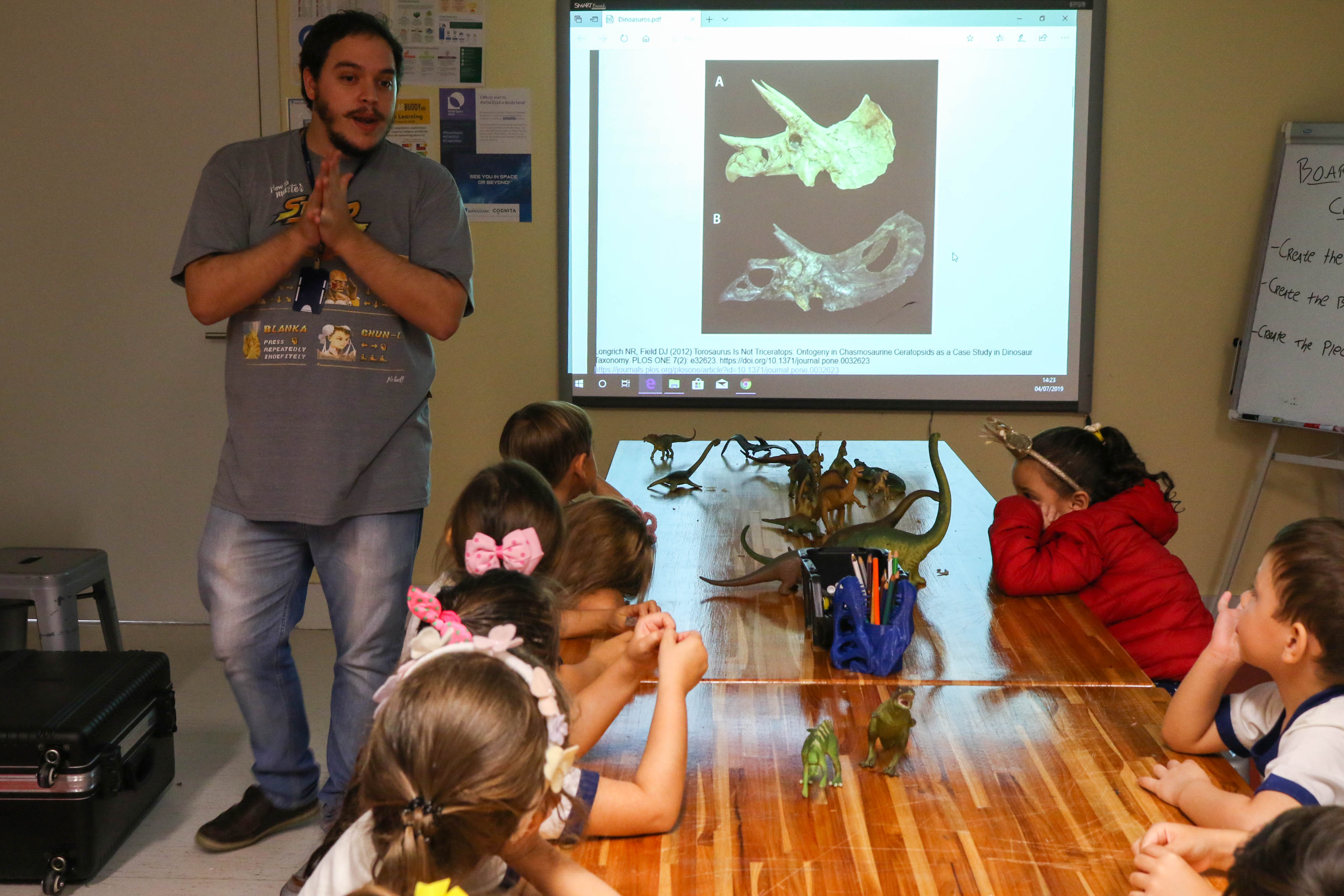 Será que os dinossauros tinham ossos e músculos como a gente? Como será o esqueleto de um dinossauro? Como os paleontólogos descobrem a espécie do dinossauro pelo osso? A partir das dúvidas levantadas pelos alunos, o professor Victor Sassi, também fascinado pelo mundo dos dinossauros, convidou a turma para uma vivência no Maker Lab. Lá, foi falado como os pesquisadores fazem para classificar as espécies de dinossauros e a diferença das ossadas de dinossauros filhotes e adultos.