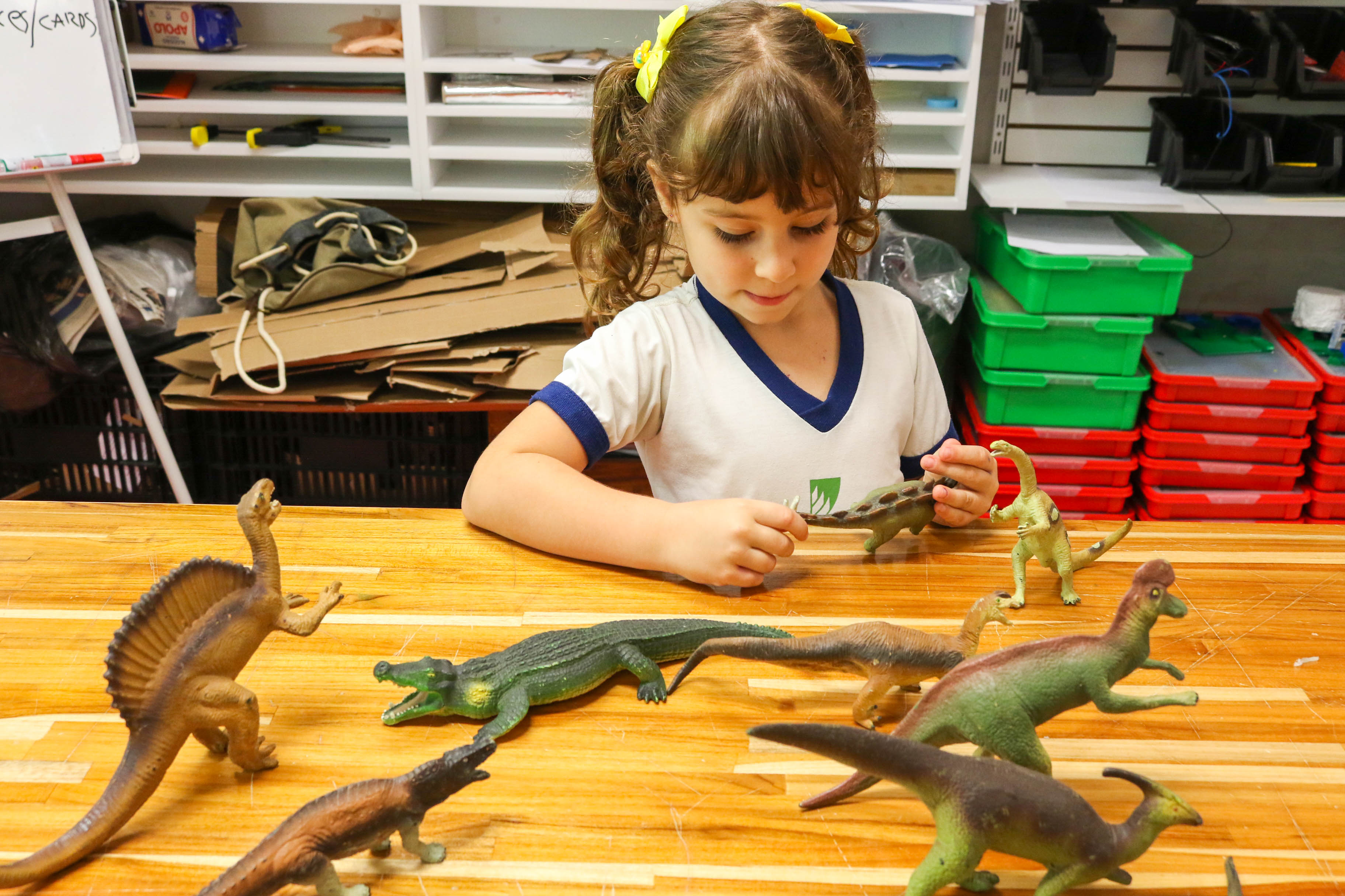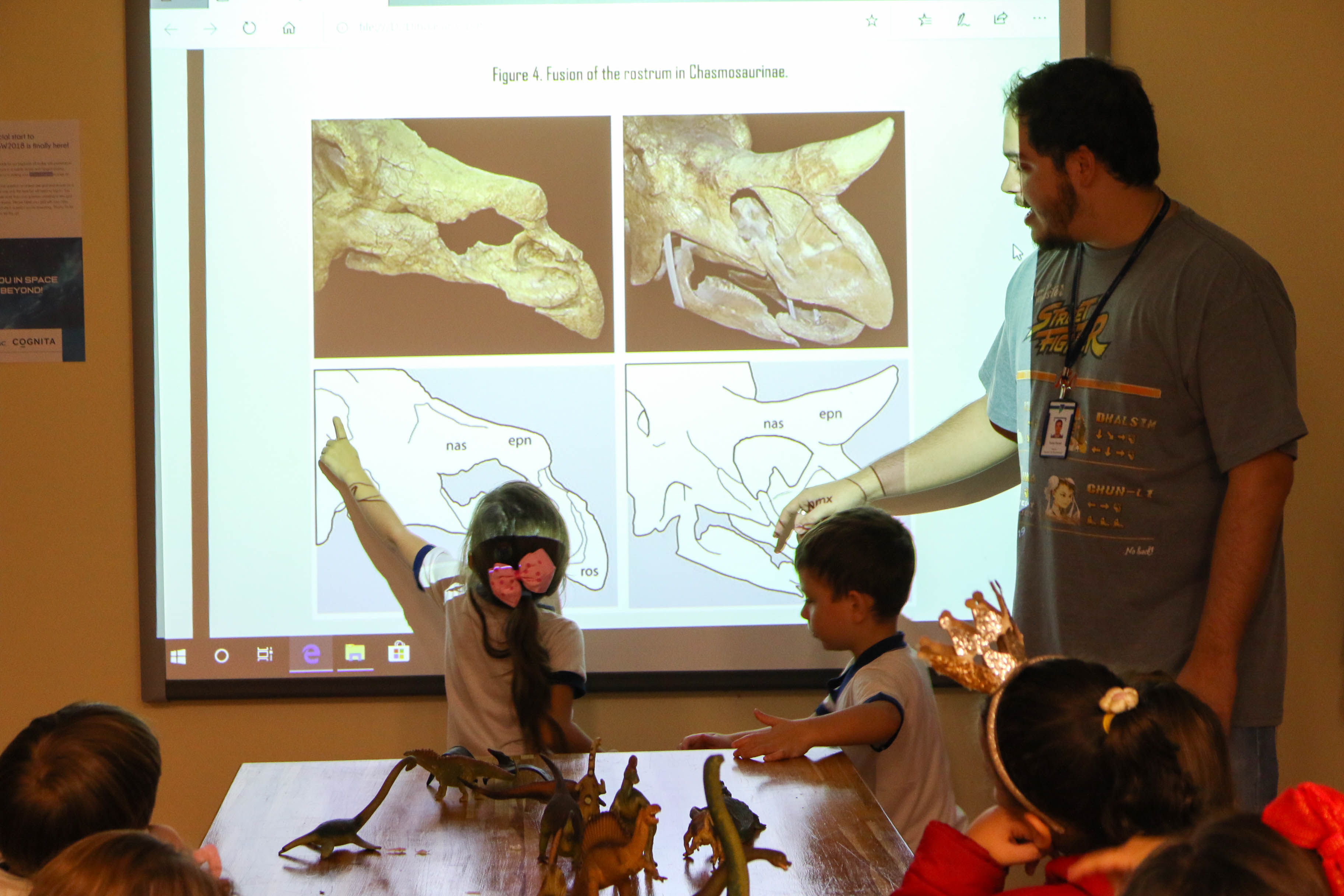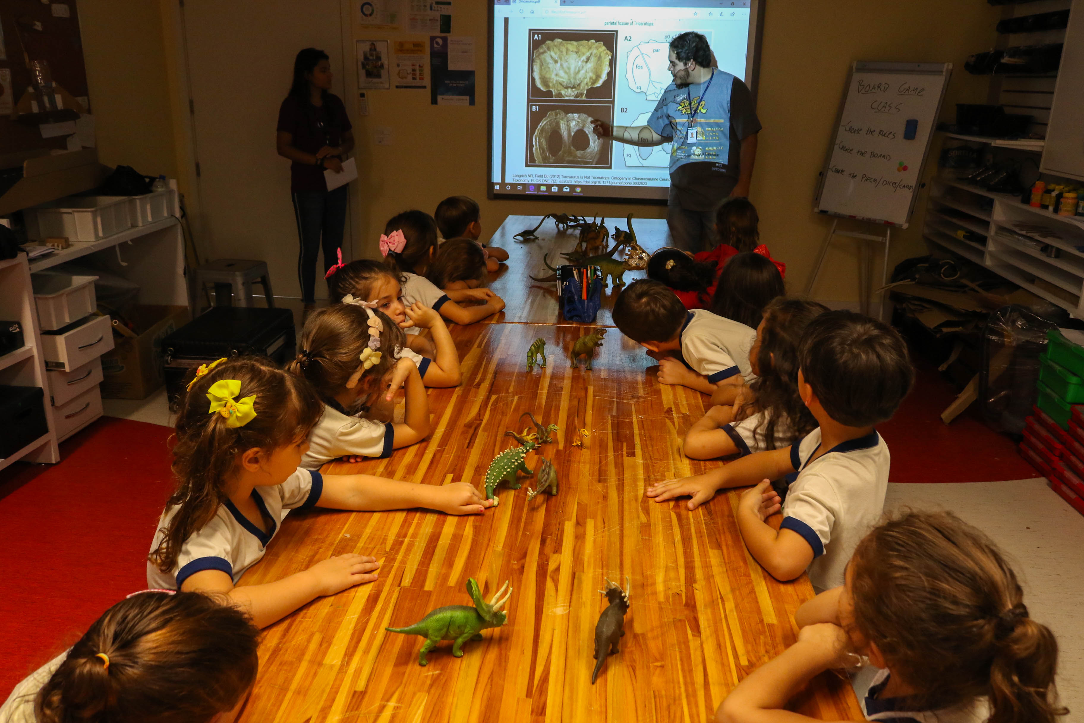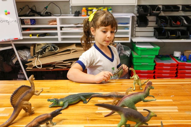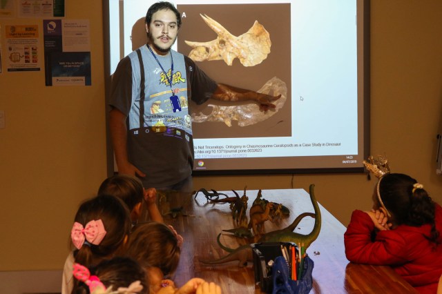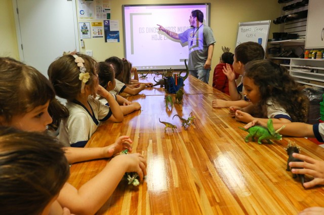 Será que os dinossauros tinham ossos e músculos como a gente? Como será o esqueleto de um dinossauro? Como os paleontólogos descobrem a espécie do dinossauro pelo osso? A partir das dúvidas levantadas pelos alunos, o professor Victor Sassi, também fascinado pelo mundo dos dinossauros, convidou a turma para uma vivência no Maker Lab. Lá, foi falado como os pesquisadores fazem para classificar as espécies de dinossauros e a diferença das ossadas de dinossauros filhotes e adultos.