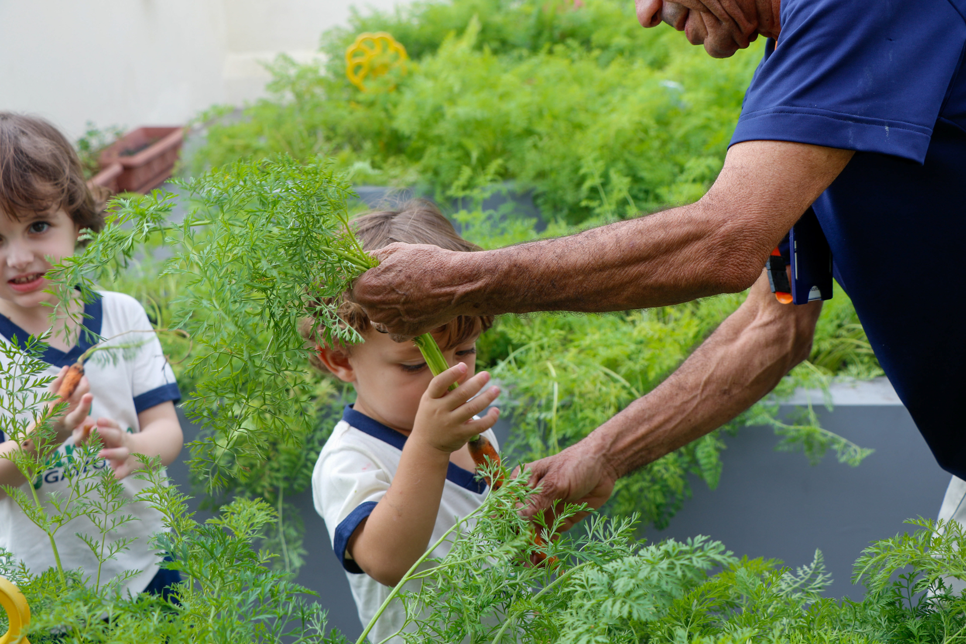 O espaço é educador. E o projeto Mãos à Horta é prova disso, permitindo que os alunos estabeleçam um contato mais próximo à natureza e uma relação de intimidade com alimentos saudáveis ao observar e participar ativamente de seu plantio e colheita. Para a Educação Infantil, a cenoura foi pivô de muito aprendizado.