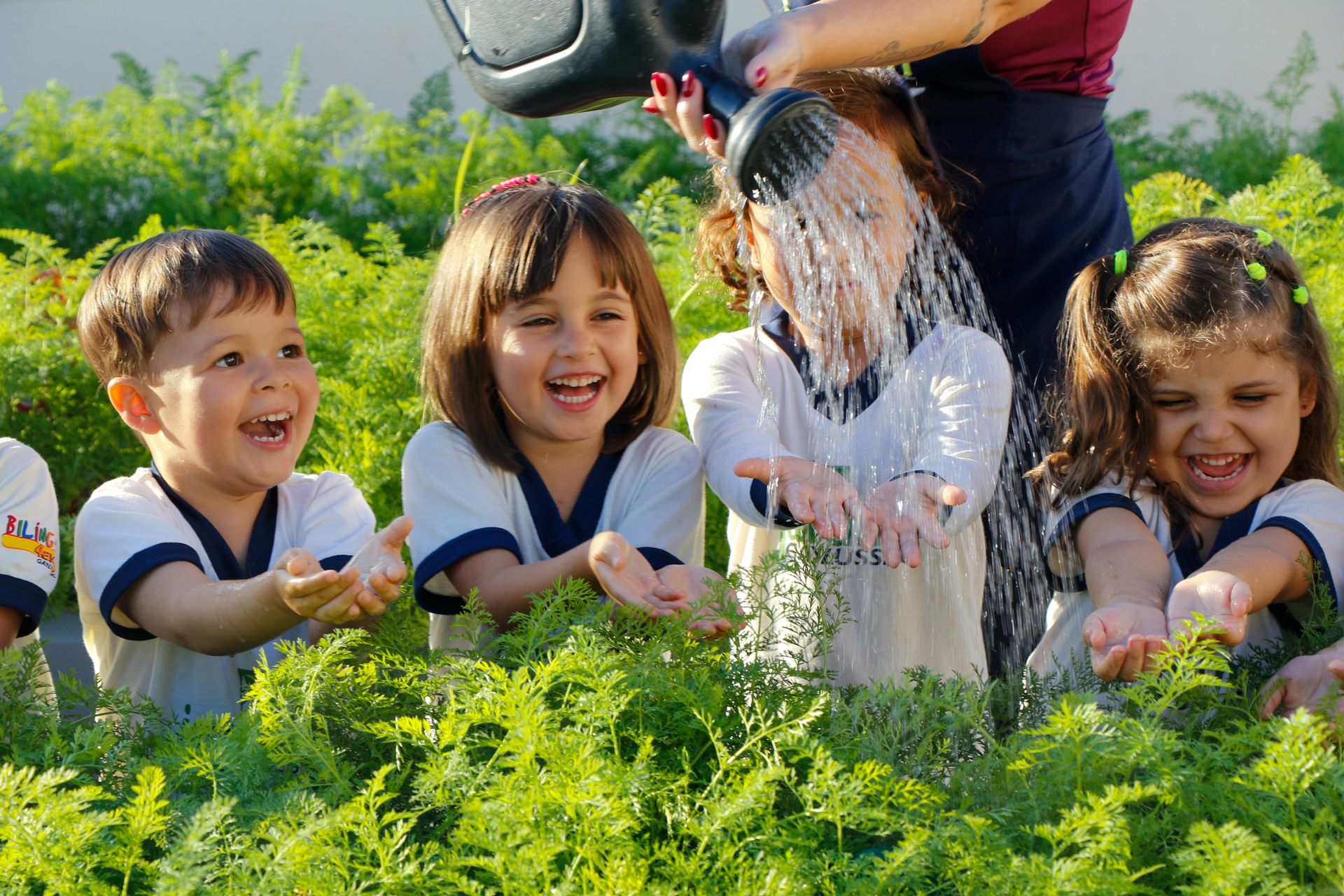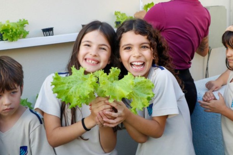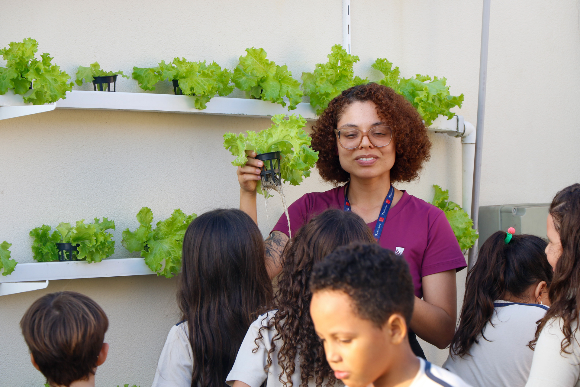 “A hidroponia traz para os alunos a possibilidade de ampliação do conceito de cultivo e sustentabilidade. No 2° ano, eles experimentam um modo novo de germinação sem uso da terra. Além disso, vivenciam todo o ciclo de vida do ser vivo desde a germinação da semente, o transplante para os perfis hidropônicos, o tempo de espera do crescimento do vegetal até a vida adulta quando ocorre a colheita. Tudo isso acontece sendo observado e registrado pelos alunos. É um verdadeiro laboratório a céu aberto! ”, Simone Abreu, Coordenadora