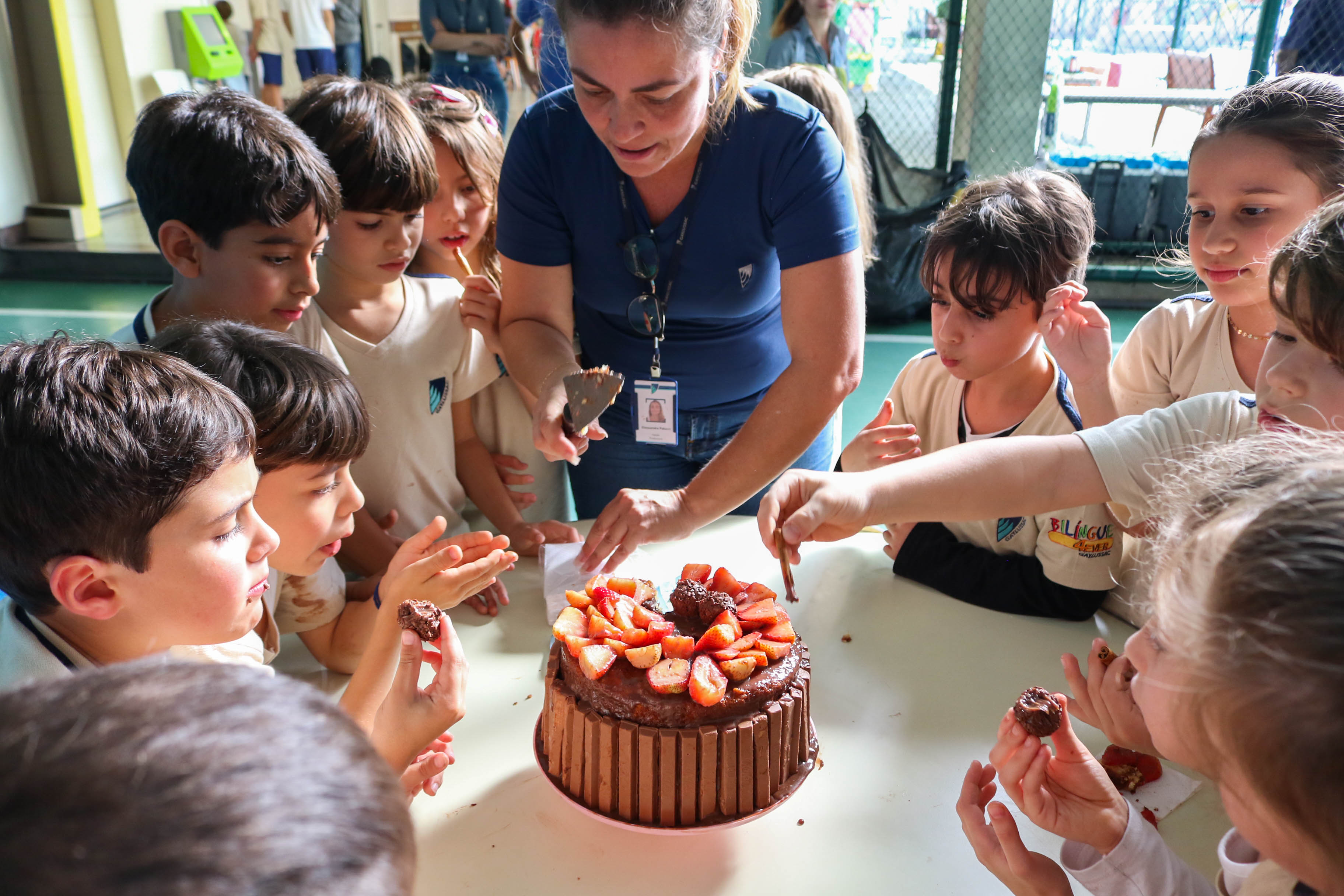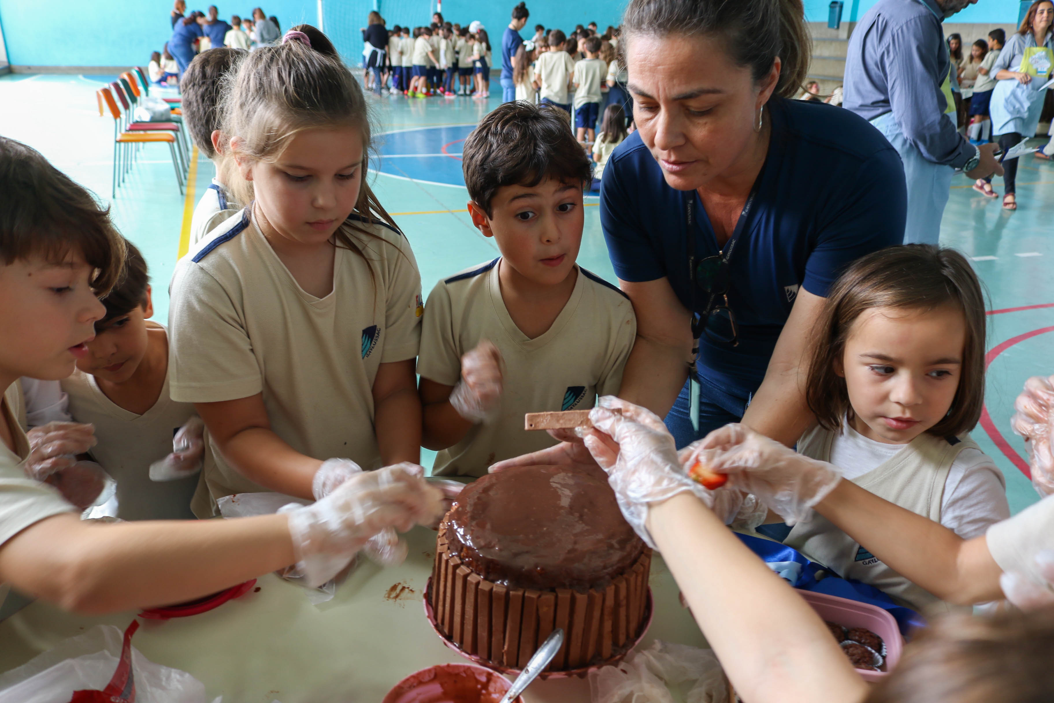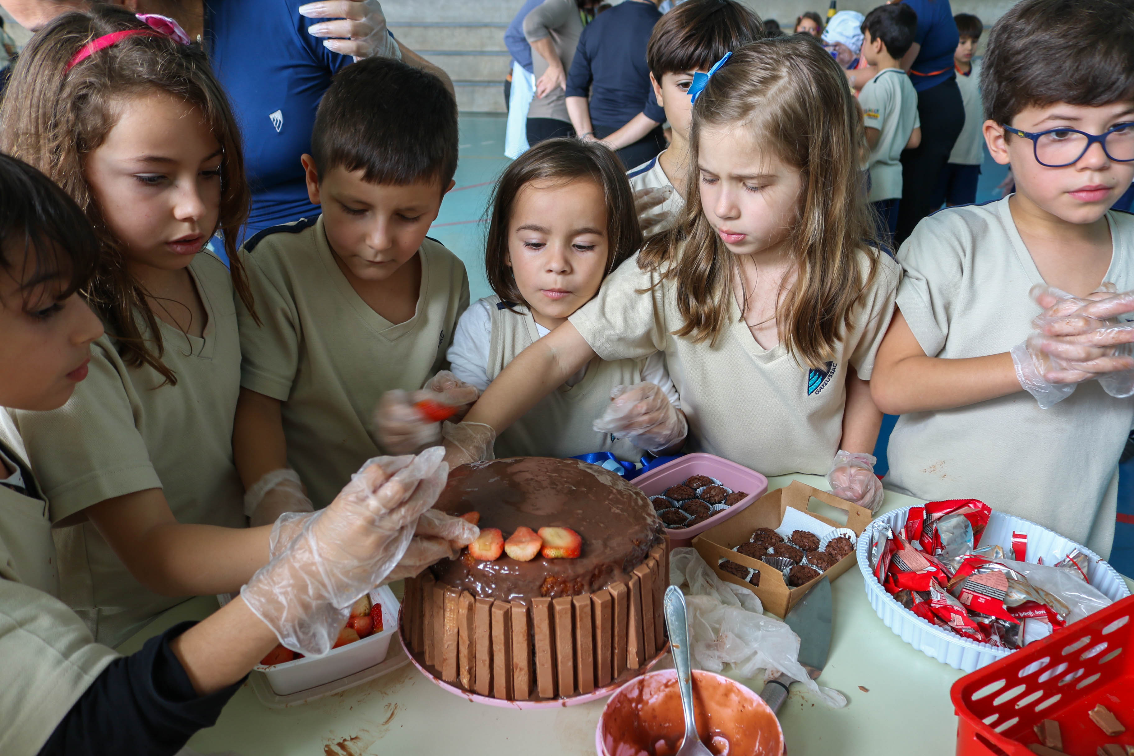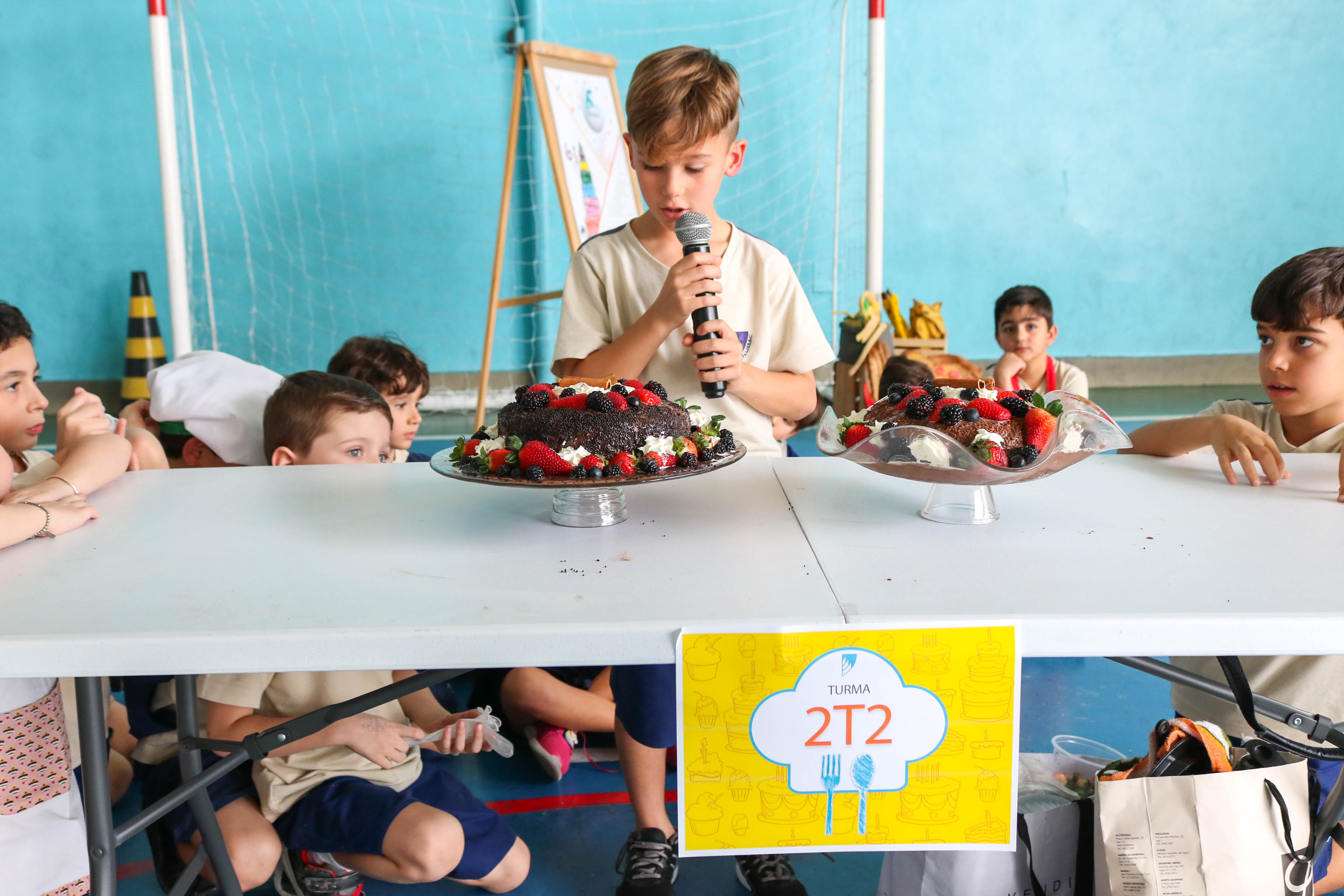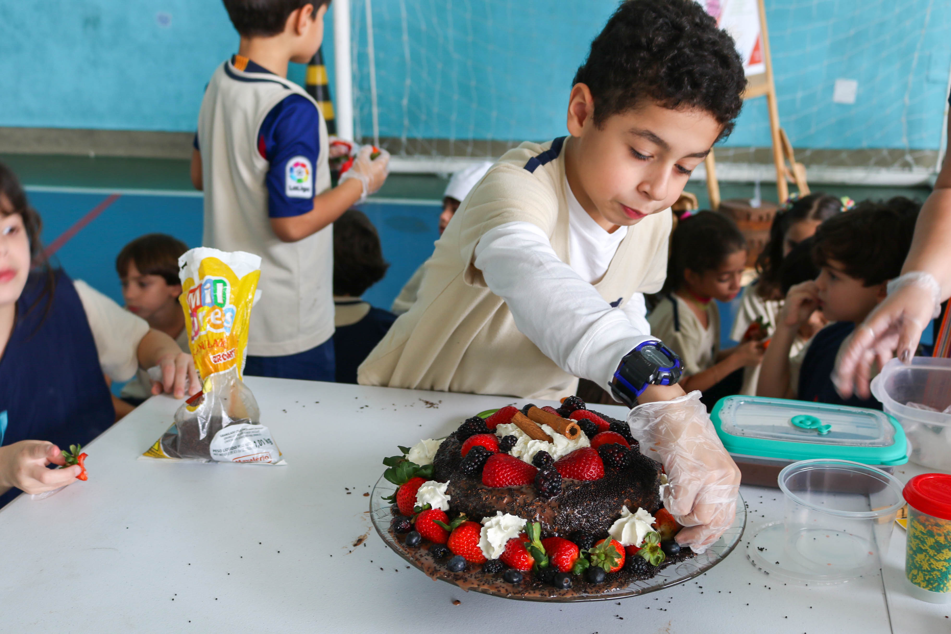 A quadra da escola se transformou em uma cozinha a céu aberto em nossa competição de Mini Master Chefinho para as turmas do 2º ao 5º ano do Ensino Fundamental. Nessa doce competição, a ideia é que os alunos aprendam na prática, com a experiência, em uma autêntica atividade hands on, na qual o trabalho em equipe está em jogo. A atividade também promove um sentimento de pertencimento à escola, uma memória afetiva que vai acompanhá-los por toda a vida. Os bolos confeitados foram avaliados pela nossa equipe gestora, que levou em conta a criatividade, a beleza e a organização em grupo.
