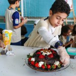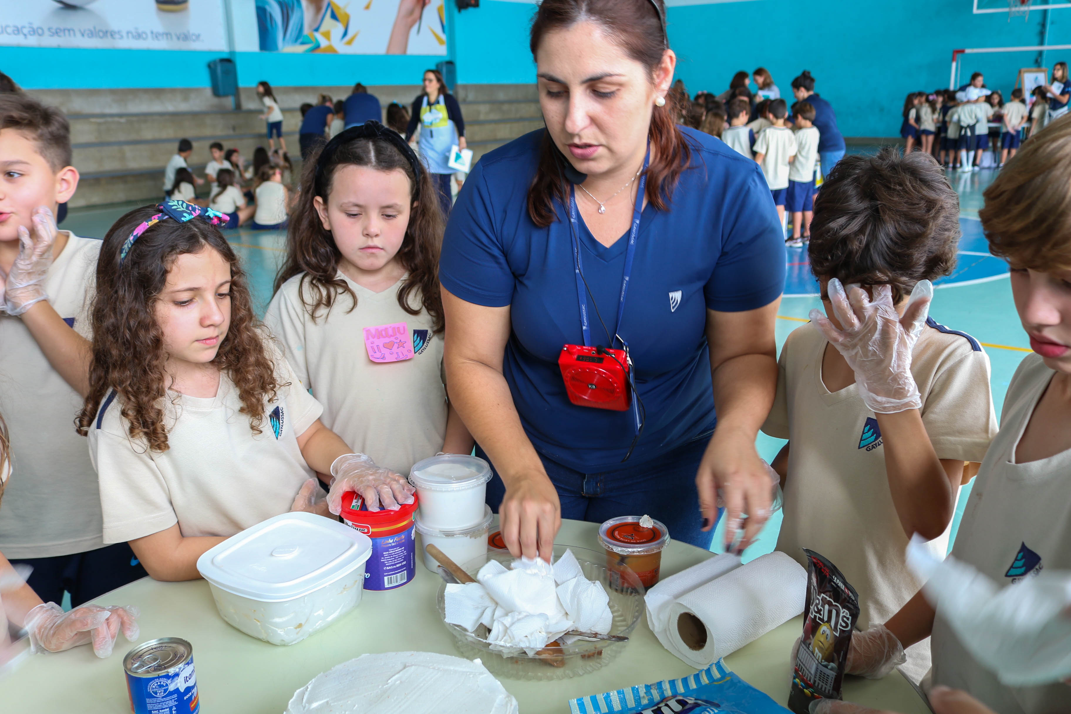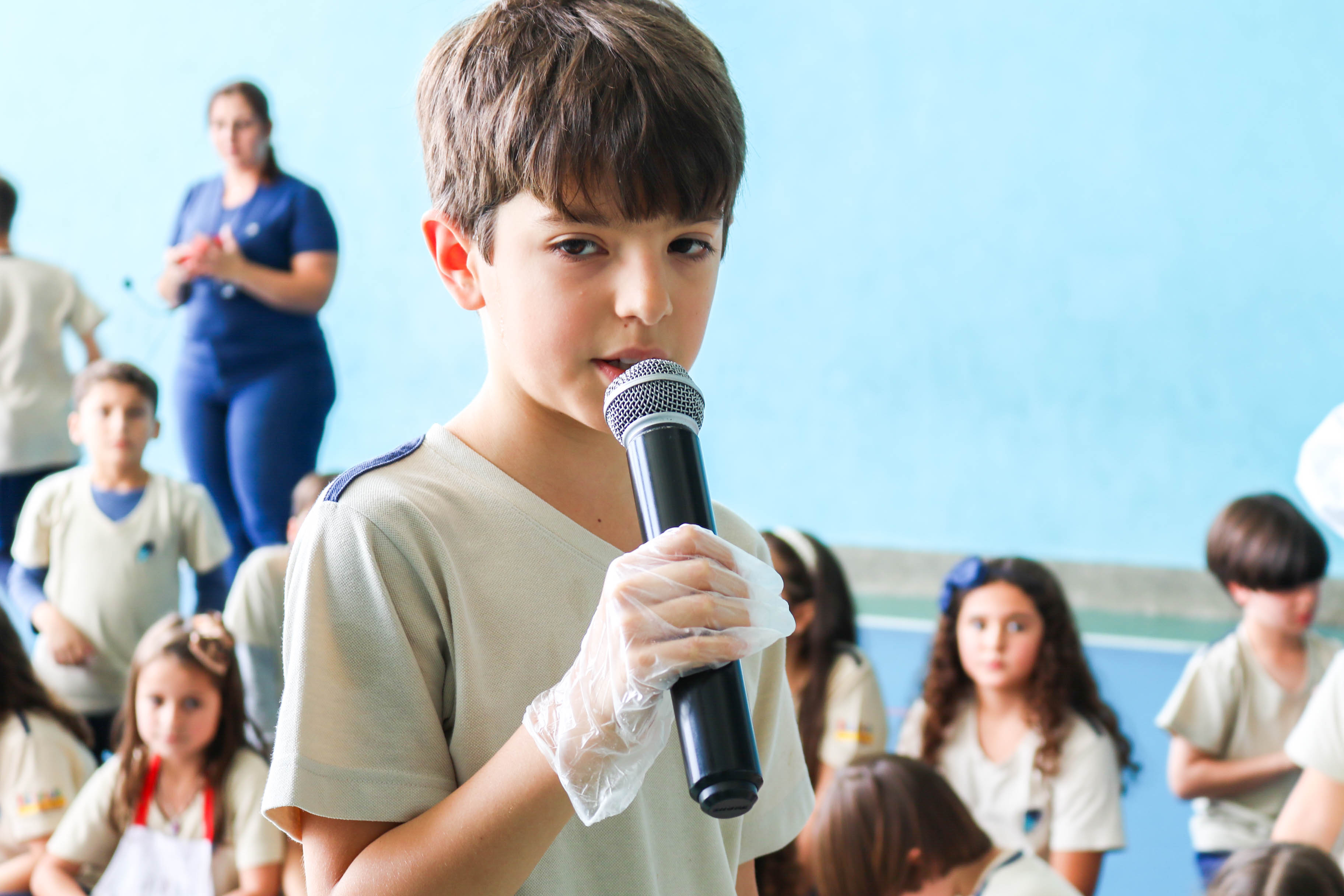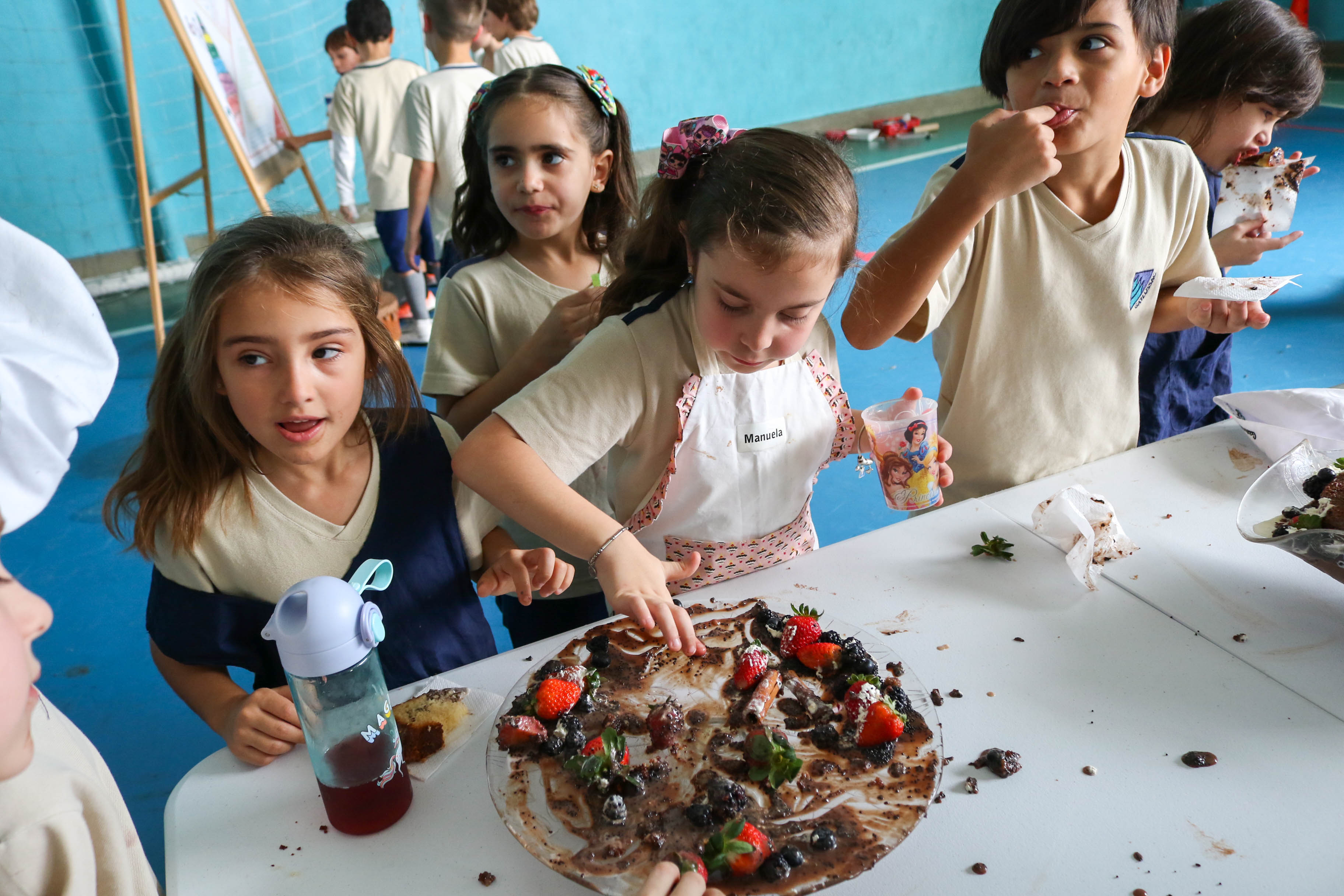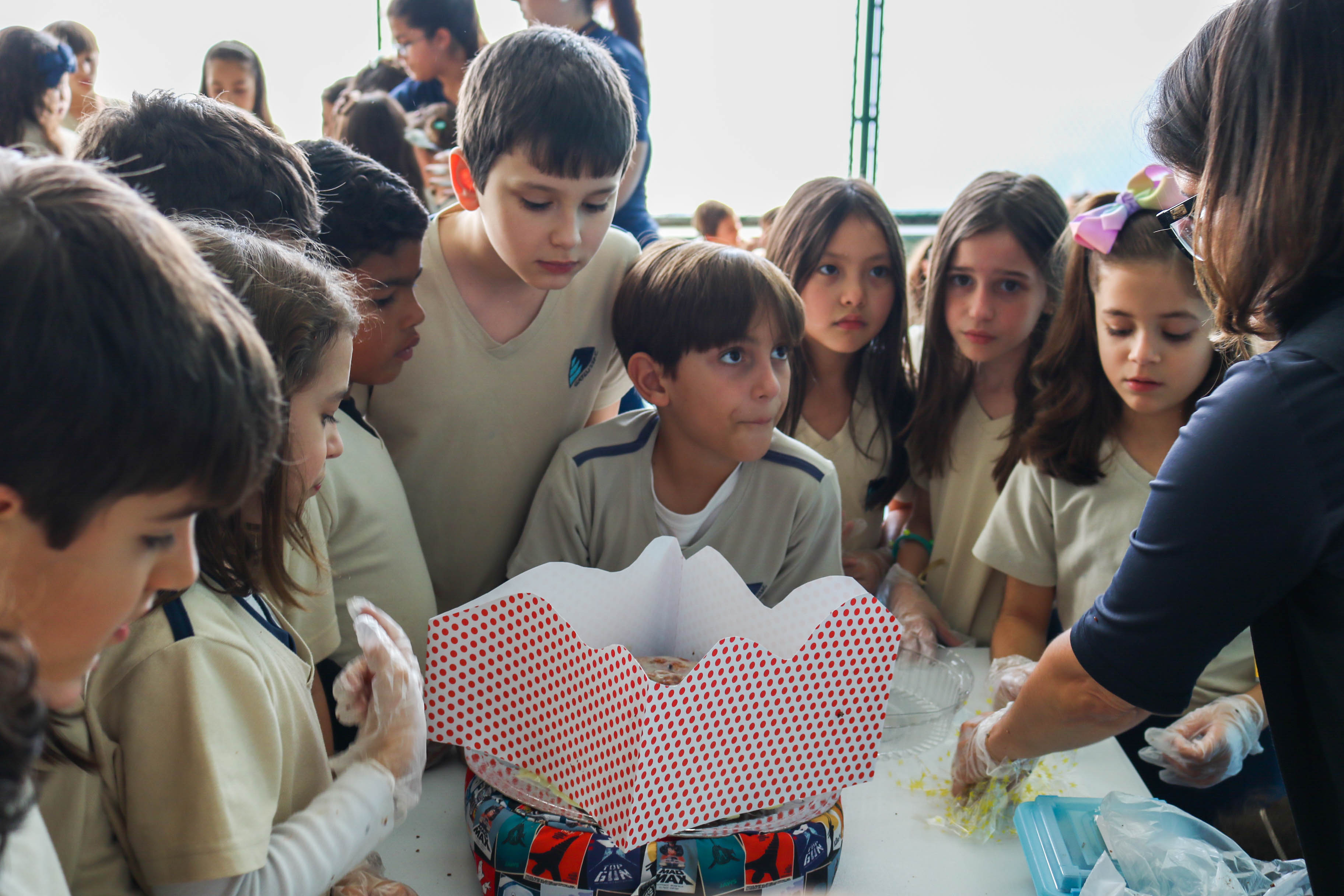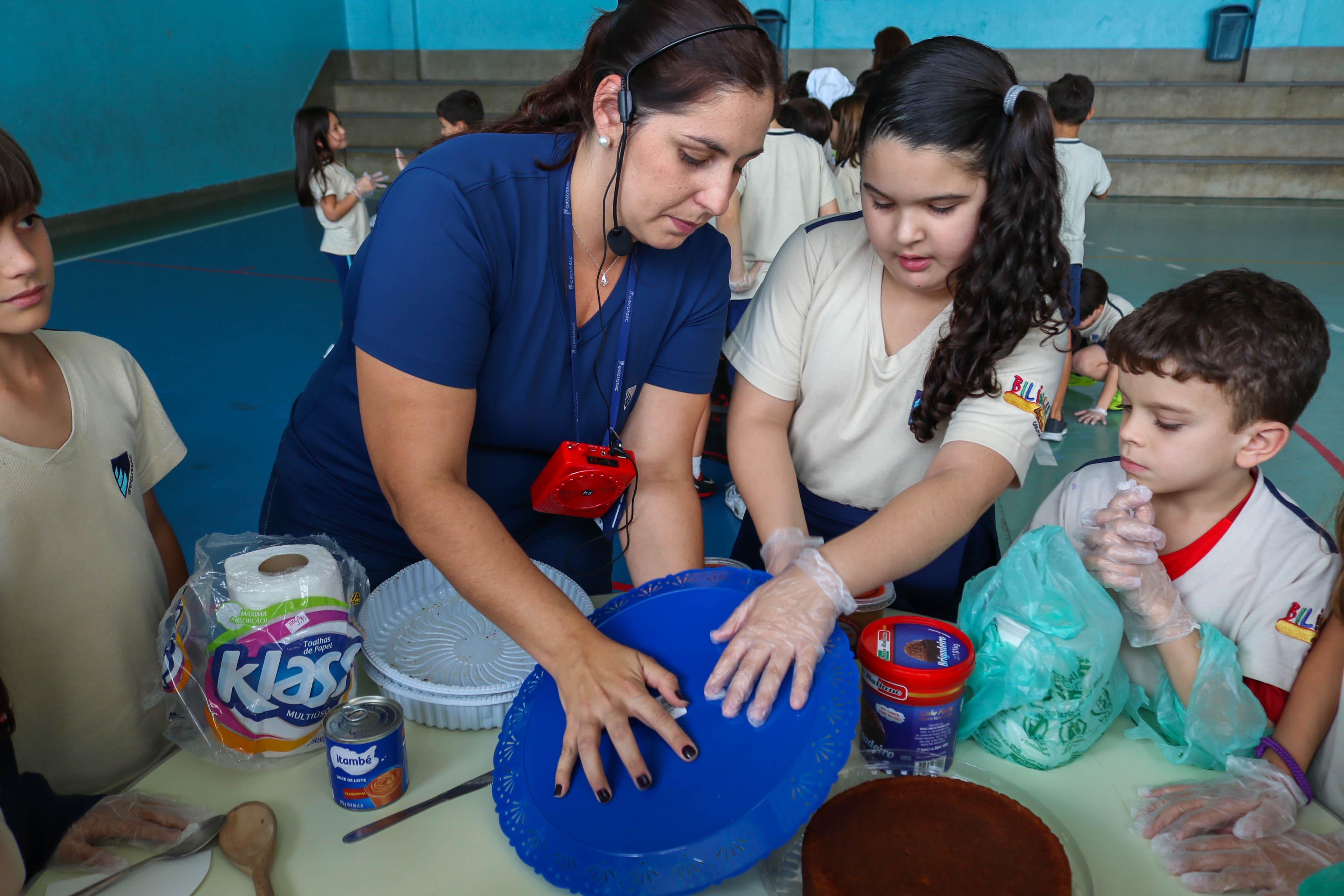 A quadra da escola se transformou em uma cozinha a céu aberto em nossa competição de Mini Master Chefinho para as turmas do 2º ao 5º ano do Ensino Fundamental. Nessa doce competição, a ideia é que os alunos aprendam na prática, com a experiência, em uma autêntica atividade hands on, na qual o trabalho em equipe está em jogo. A atividade também promove um sentimento de pertencimento à escola, uma memória afetiva que vai acompanhá-los por toda a vida. Os bolos confeitados foram avaliados pela nossa equipe gestora, que levou em conta a criatividade, a beleza e a organização em grupo.