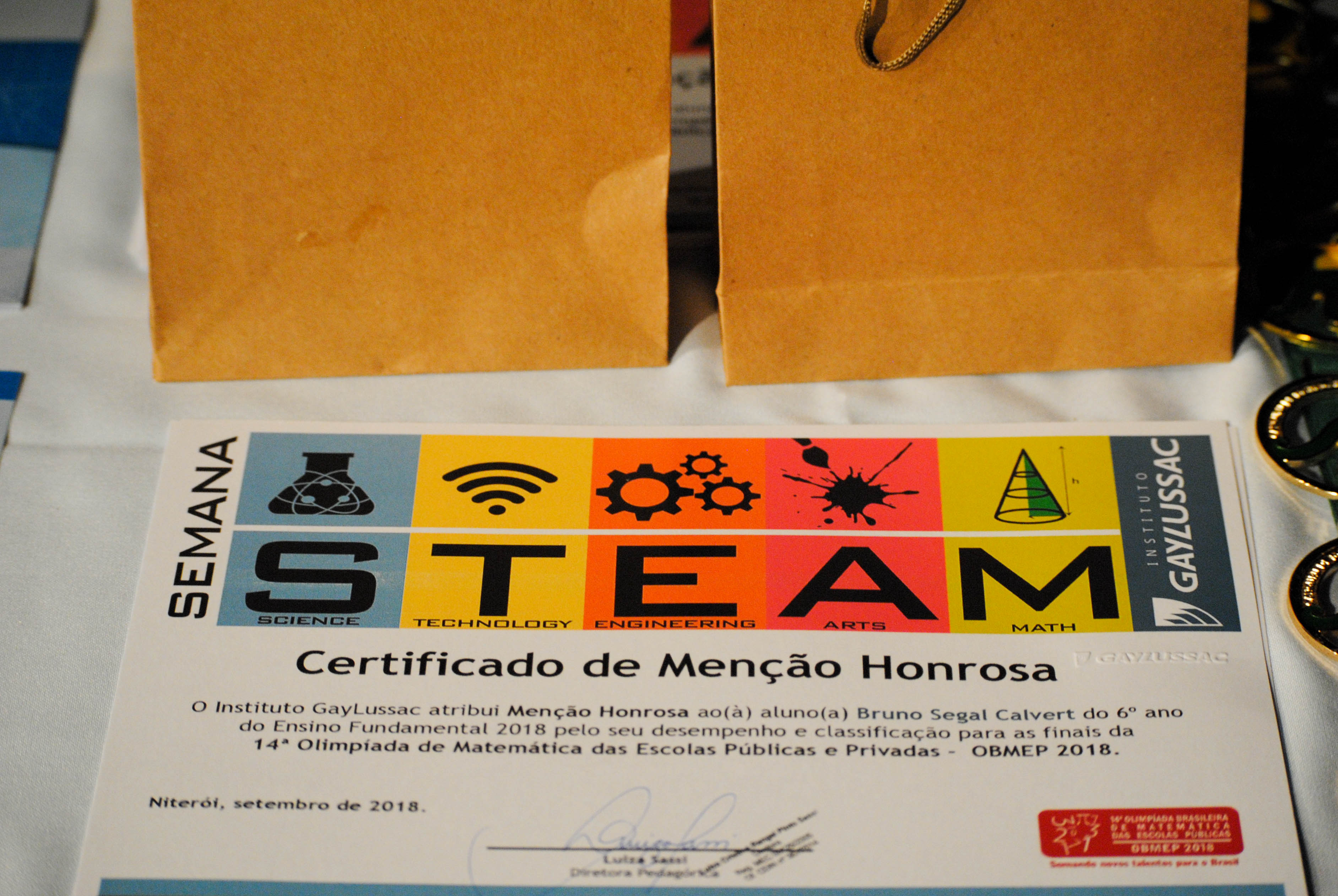 Ao total, foram 118 medalhas Canguru e 16 menções honrosas aos melhores resultados da Olimpíada Brasileira de Matemática das Escolas Públicas e Particulares (OBMEP), entregues aos alunos de 6º ano do Ensino Fundamental à 3ª série do Ensino Médio, sendo seis delas emitidas pelo Instituto de Matemática Pura e Aplicada (IMPA), referente à OBMEP de 2017. Além disso, tivemos também a entrega da premiação de 1º Lugar da Feira de Ciência, Tecnologia e Inovação do Estado do Rio de Janeiro (FECTI), alcançada em 2017 pelos alunos Lucas Baliane, João Guilherme Correia e Kaui Madeira, na categoria de 6º a 9º ano.