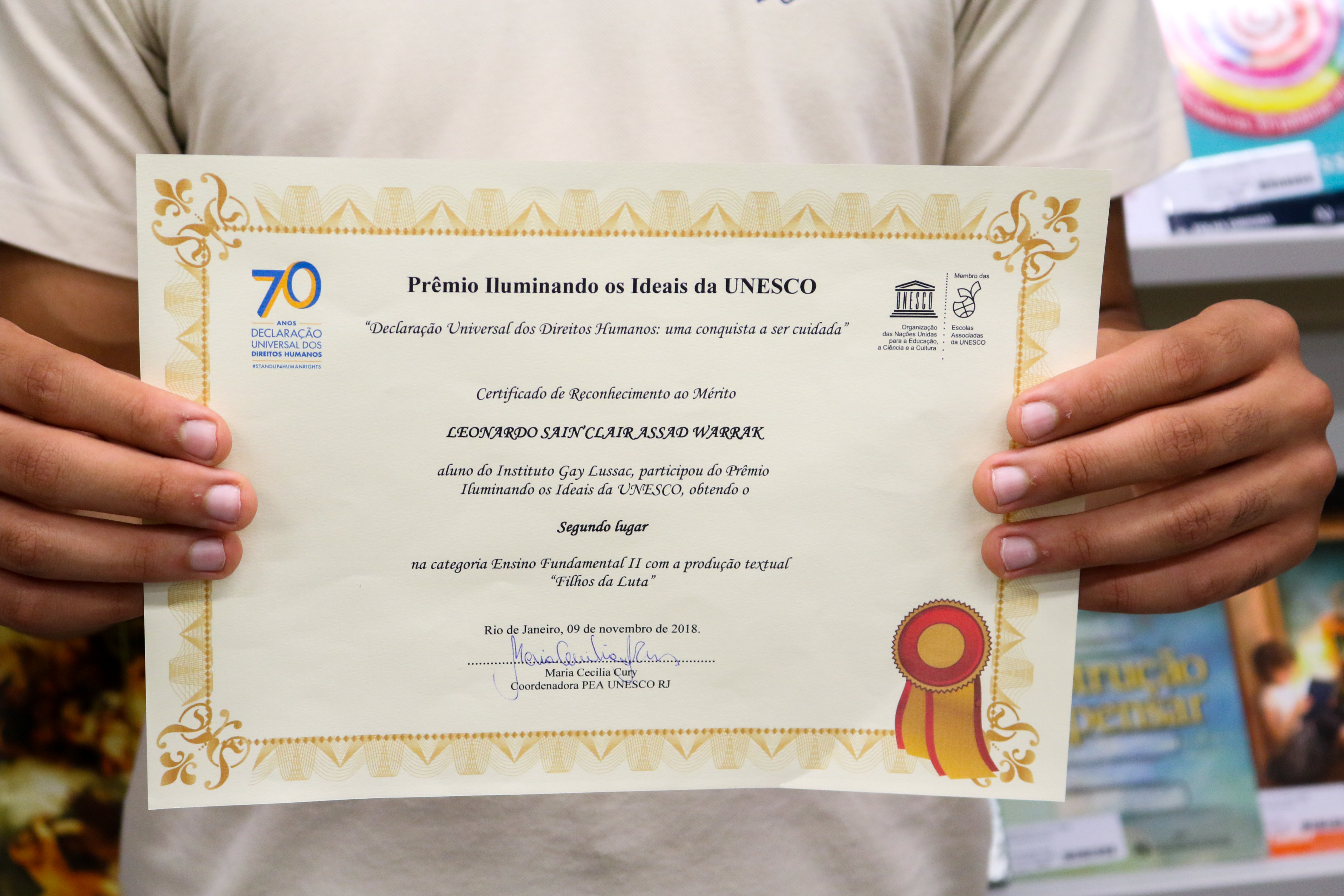 Em 2018, o documento mais traduzido do mundo, a declaração dos Direitos Humanos, completa 70 anos. Para celebrar essa data, a ONU-UNESCO criou o concurso de redação e artes plásticas para que alunos do Ensino Médio e Fundamental, pudessem ter uma oportunidade de reflexão sobre as principais transformações e novos desafios que os direitos humanos enfrentam atualmente. Ao fim de longos meses de seleção, o aluno Leonardo Saint’ Clair recebeu a premiação de 2º Lugar na disputa regional, representando a escola com o texto “Filhos da Luta”.