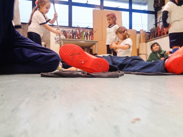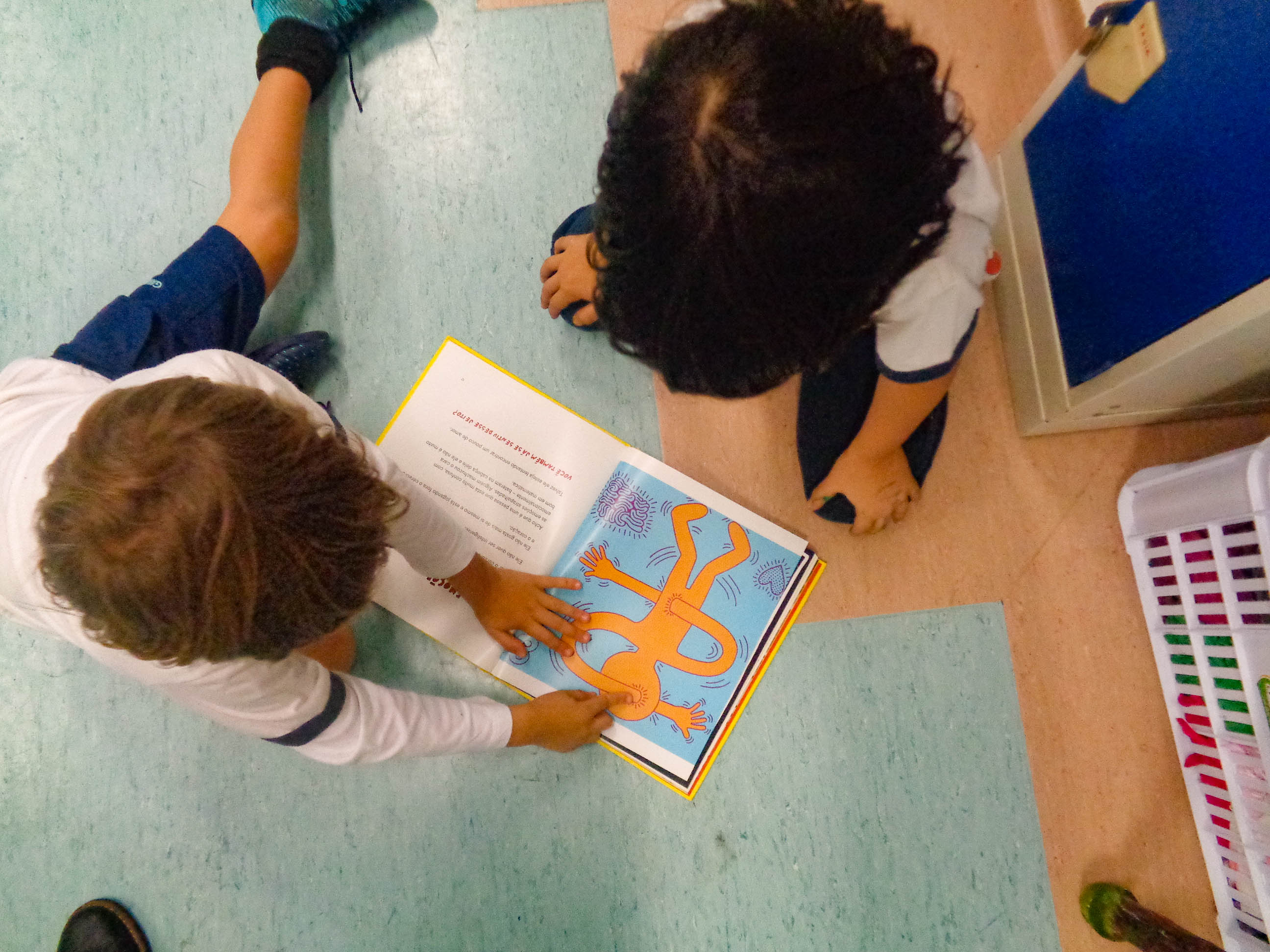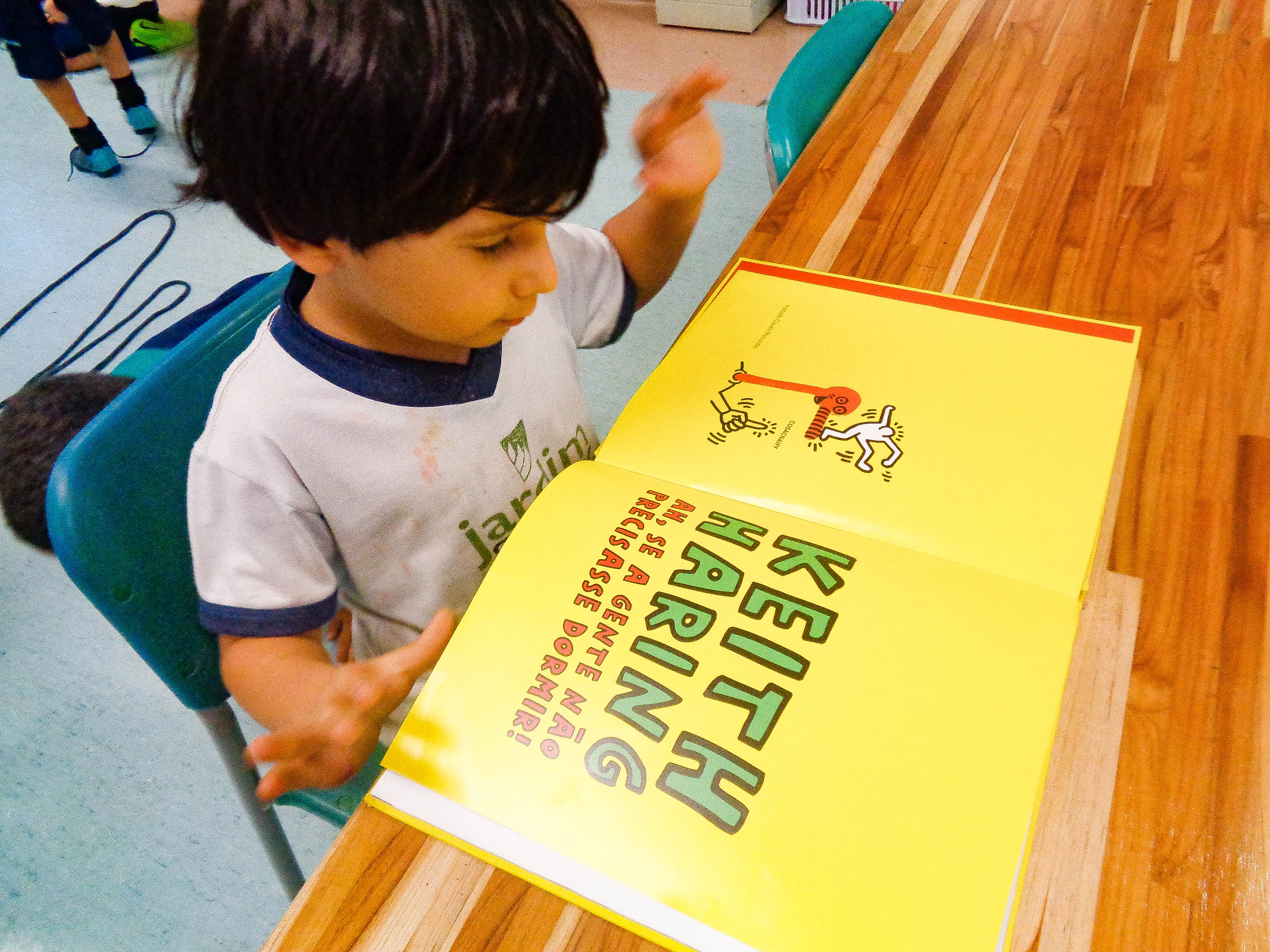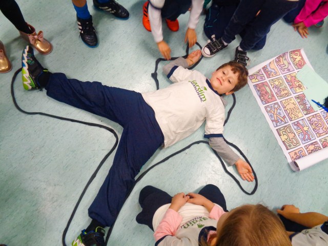 “Numa folha qualquer eu desenho um sol amarelo e com cinco ou seis retas é fácil fazer um castelo…”, os versos de Toquinho são emblemáticos. Nas mãos de uma criança, um traço vira forma, ganha movimento e se transforma em expressão. Esse movimento artístico que alinha o estudo do corpo e o movimento em 2D, foi o tema trabalhado pelas turmas do Jardim 3, no projeto “Keith Haring, corpo em movimento”. Inspirado no livro “Ah, se a gente não precisasse dormir!”, do artista gráfico dos anos 1980, os alunos fizeram comparações entre as obras e traços de Leonardo da Vinci e Haring.