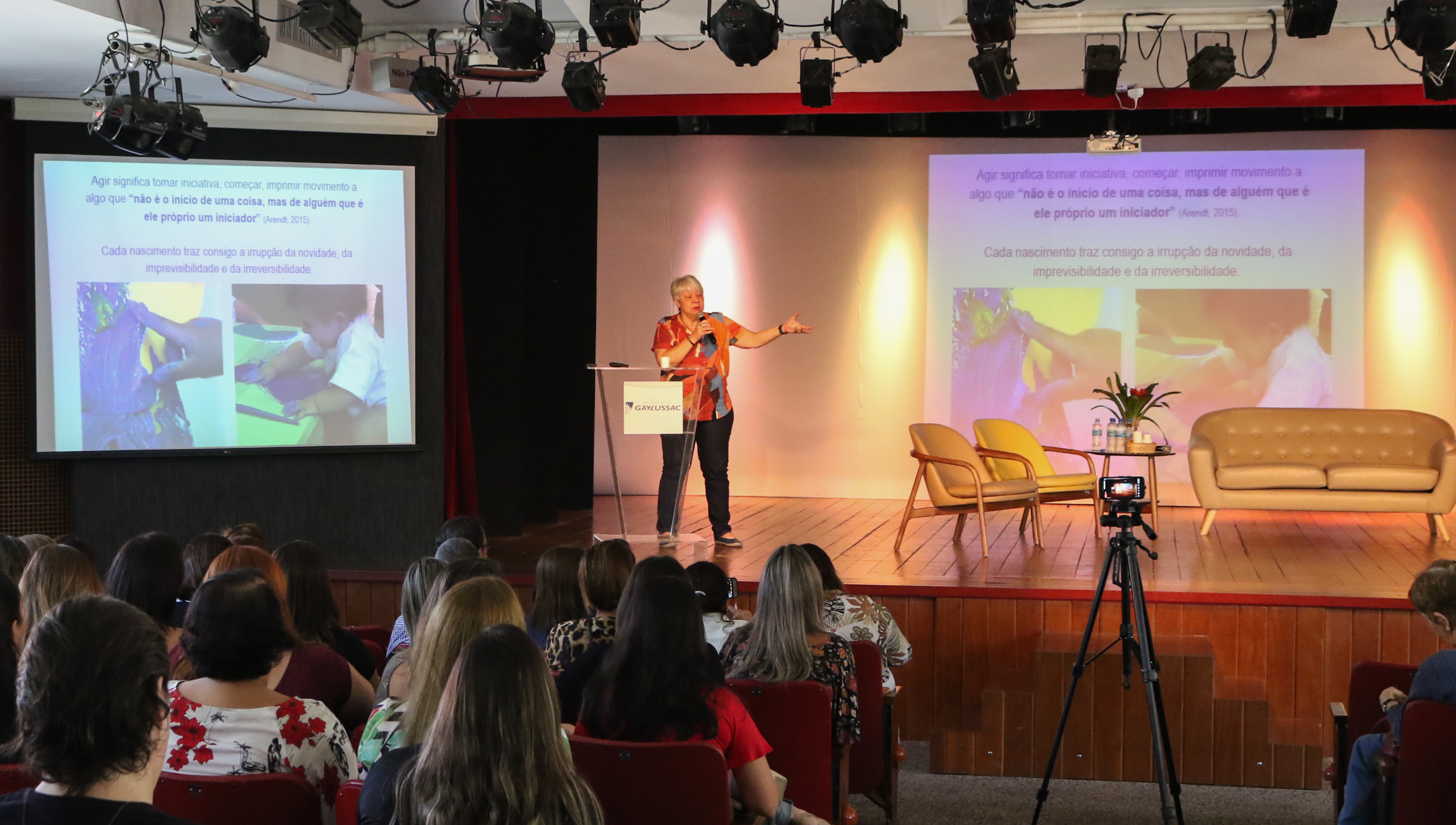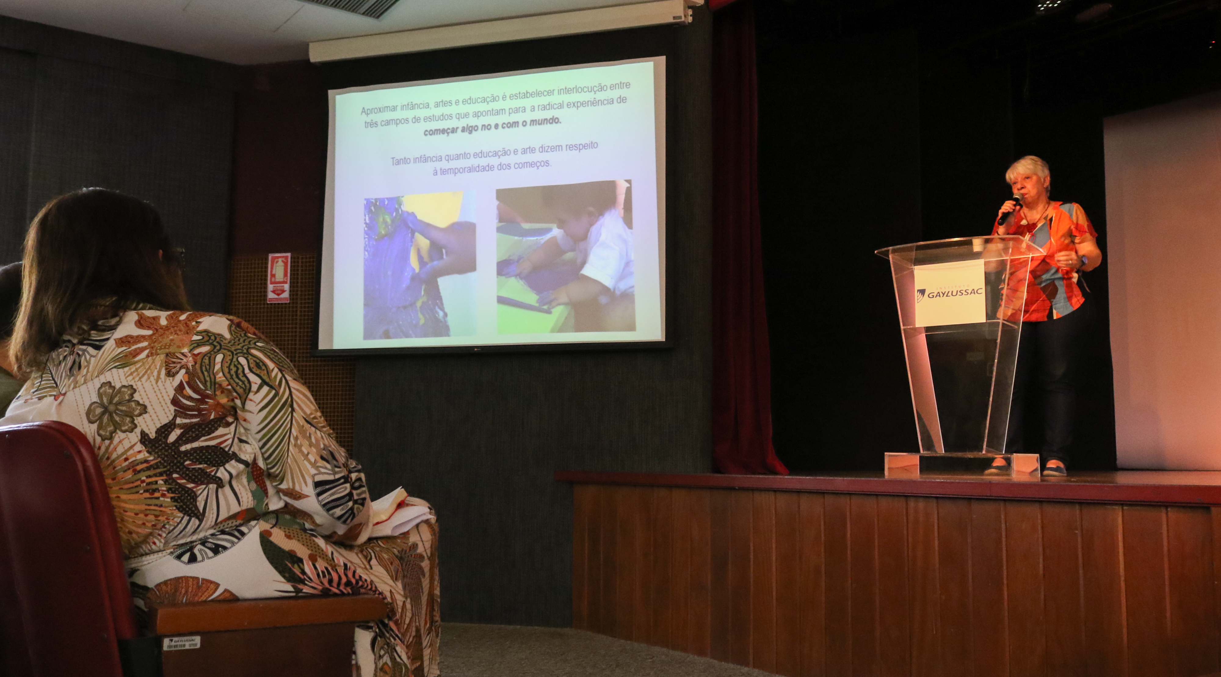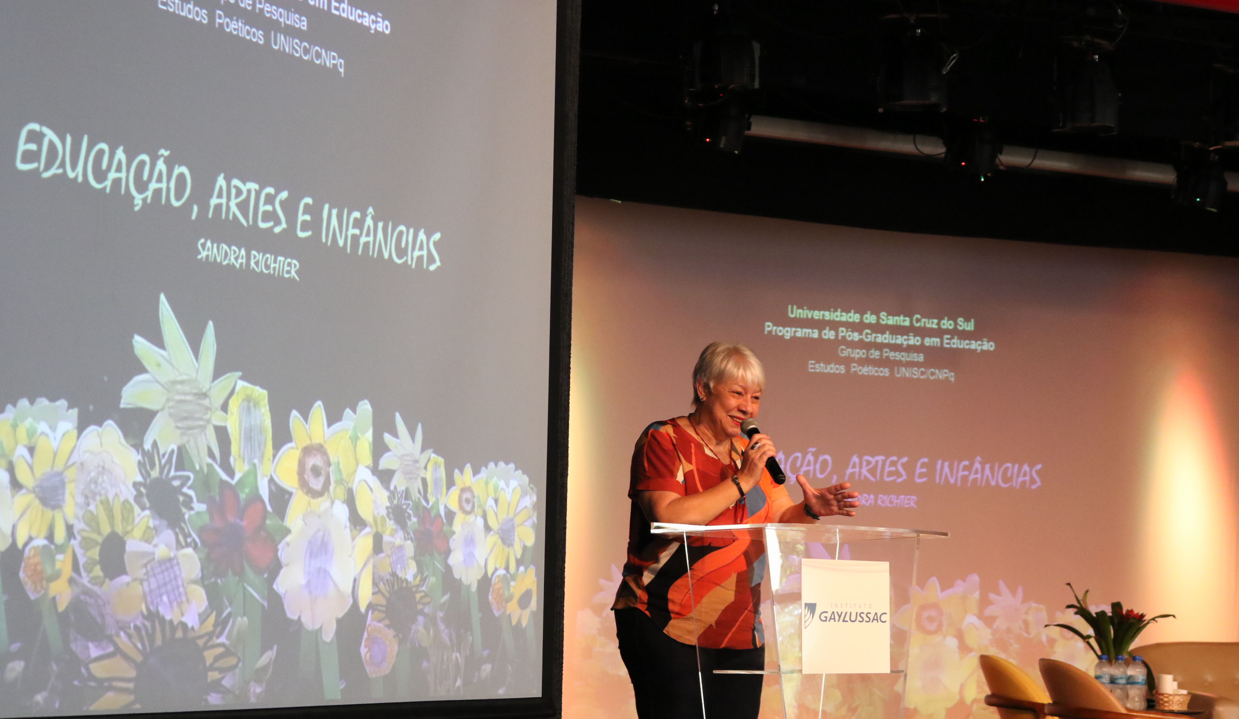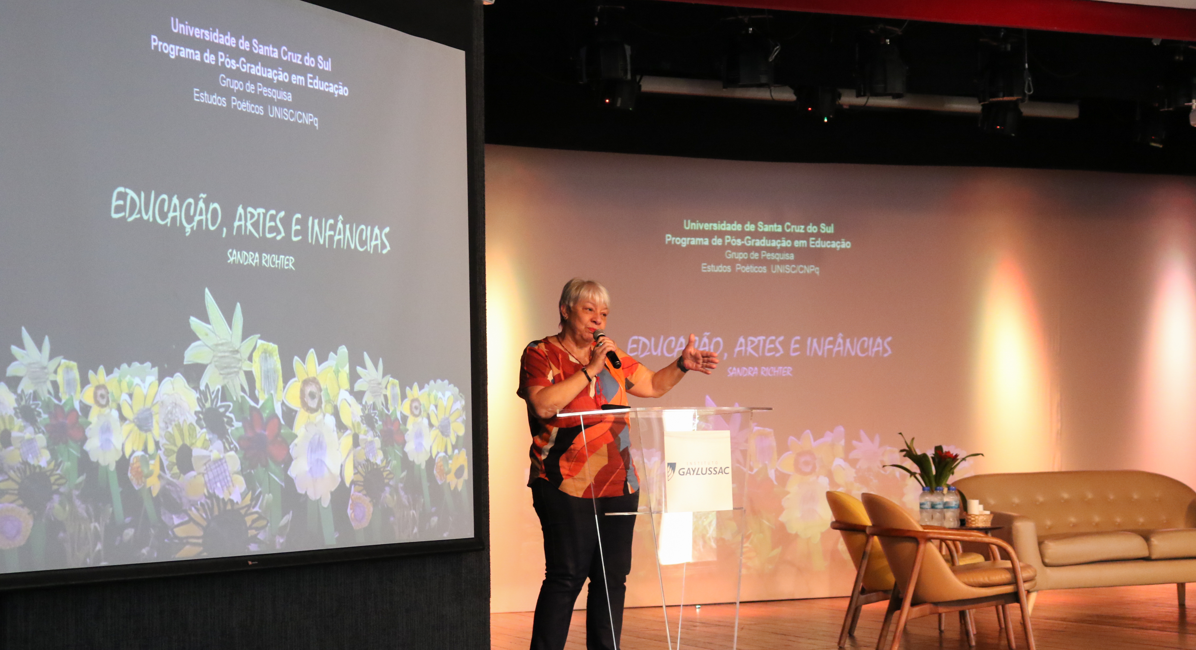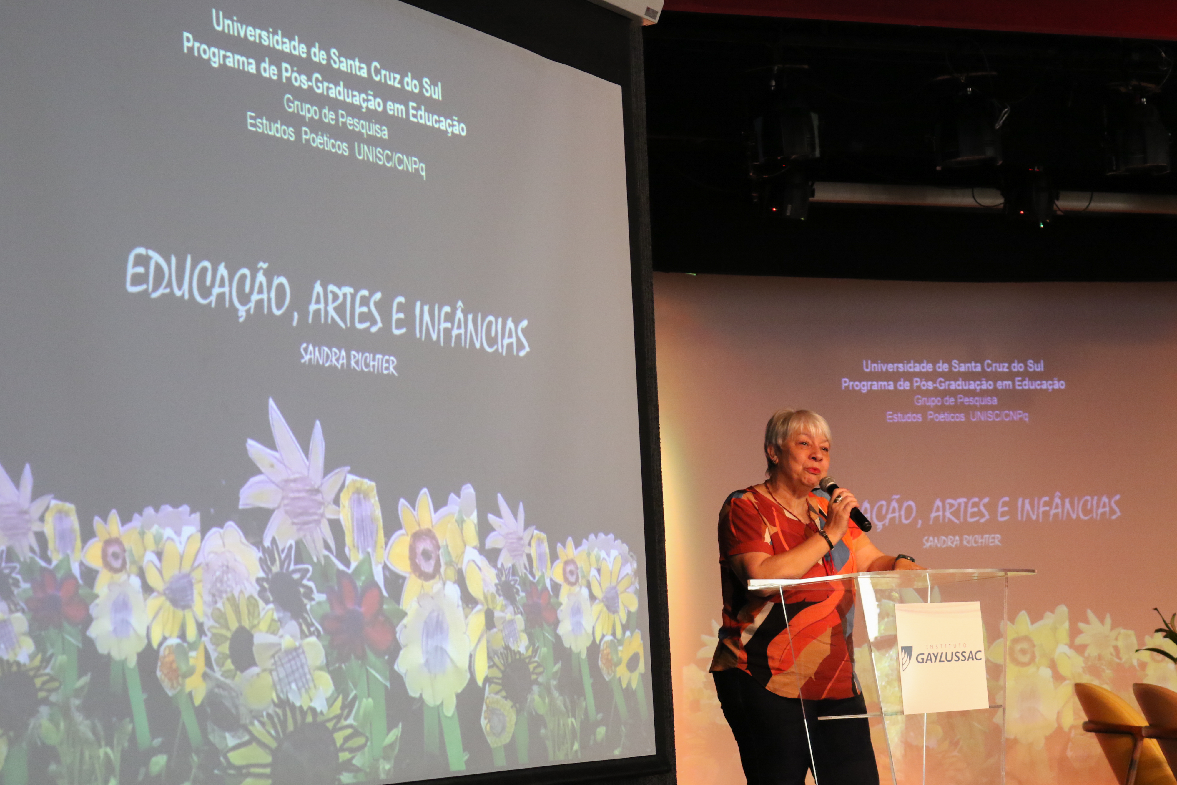 A palestra da professora da UFRGS, Dra. Sandra Regina Simonis, provocou indagações sobre a primeira infância como instância e experimentação. “Os professores de 0 a 3 anos precisam perceber que todos os começos estão ali. Vir ao mundo é vir à linguagem e a grande questão dos adultos é a inserir as crianças nesse universo da linguagem. As artes, ferramentas essenciais para isso, são plurais, são relatos irredutíveis e estão presentes desde os tempos imemoriais”.