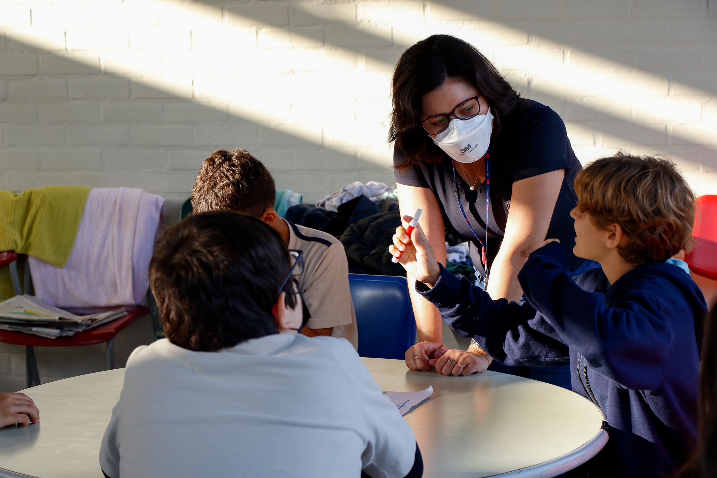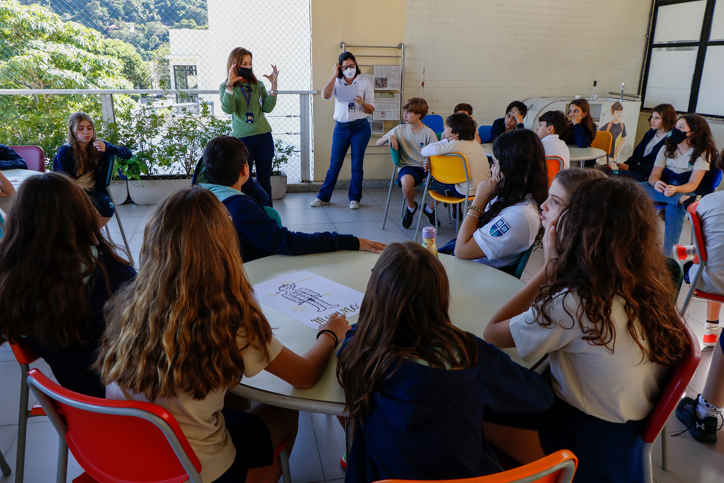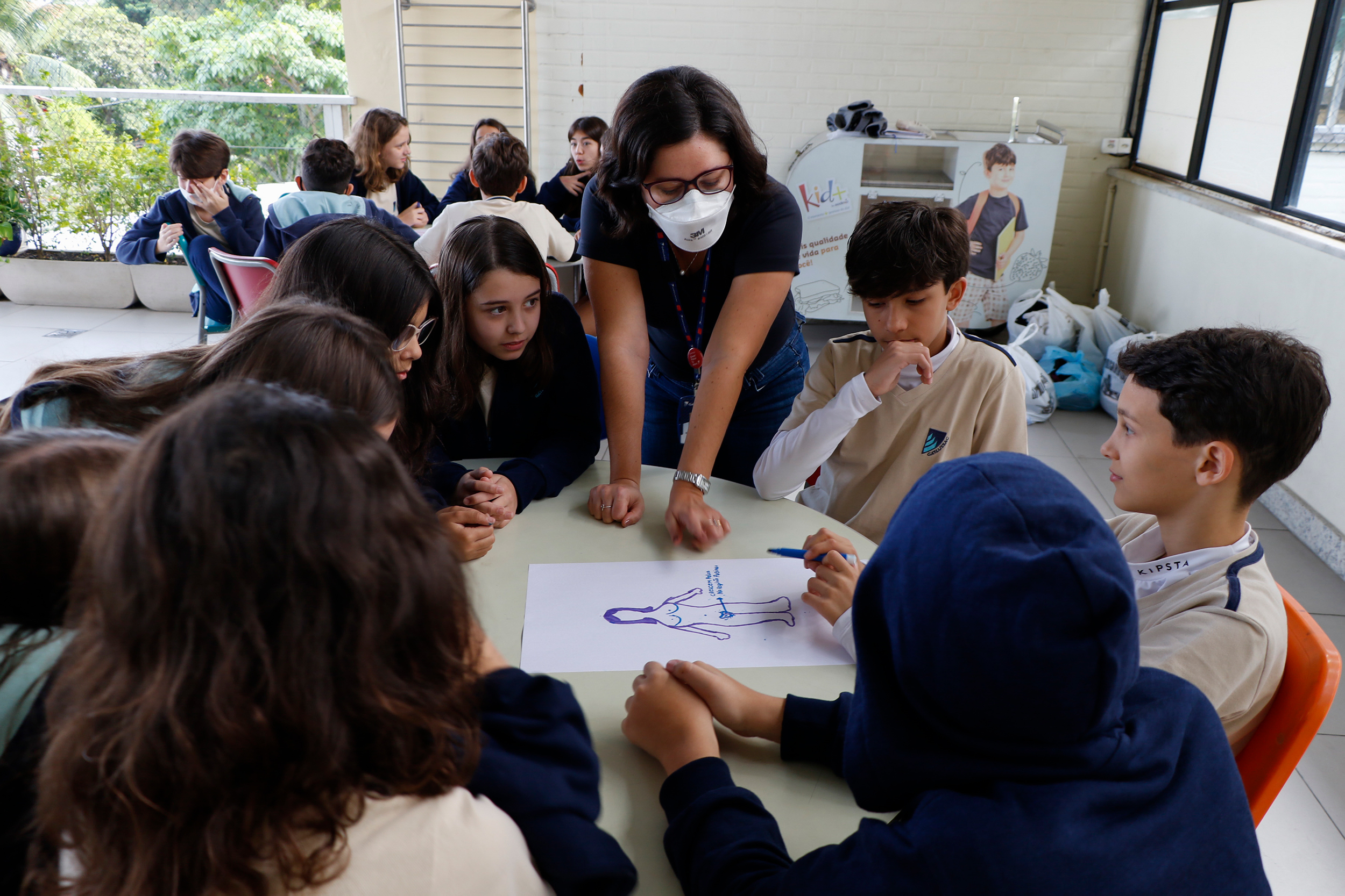 Os alunos do 6º ano se reuniram para falar sobre educação sexual. A professora Lana Guimarães, de Ciências, e a psicóloga Natalia Romanini preparam uma atividade que incentivava os alunos a representarem os diferentes corpos – masculinos e femininos.