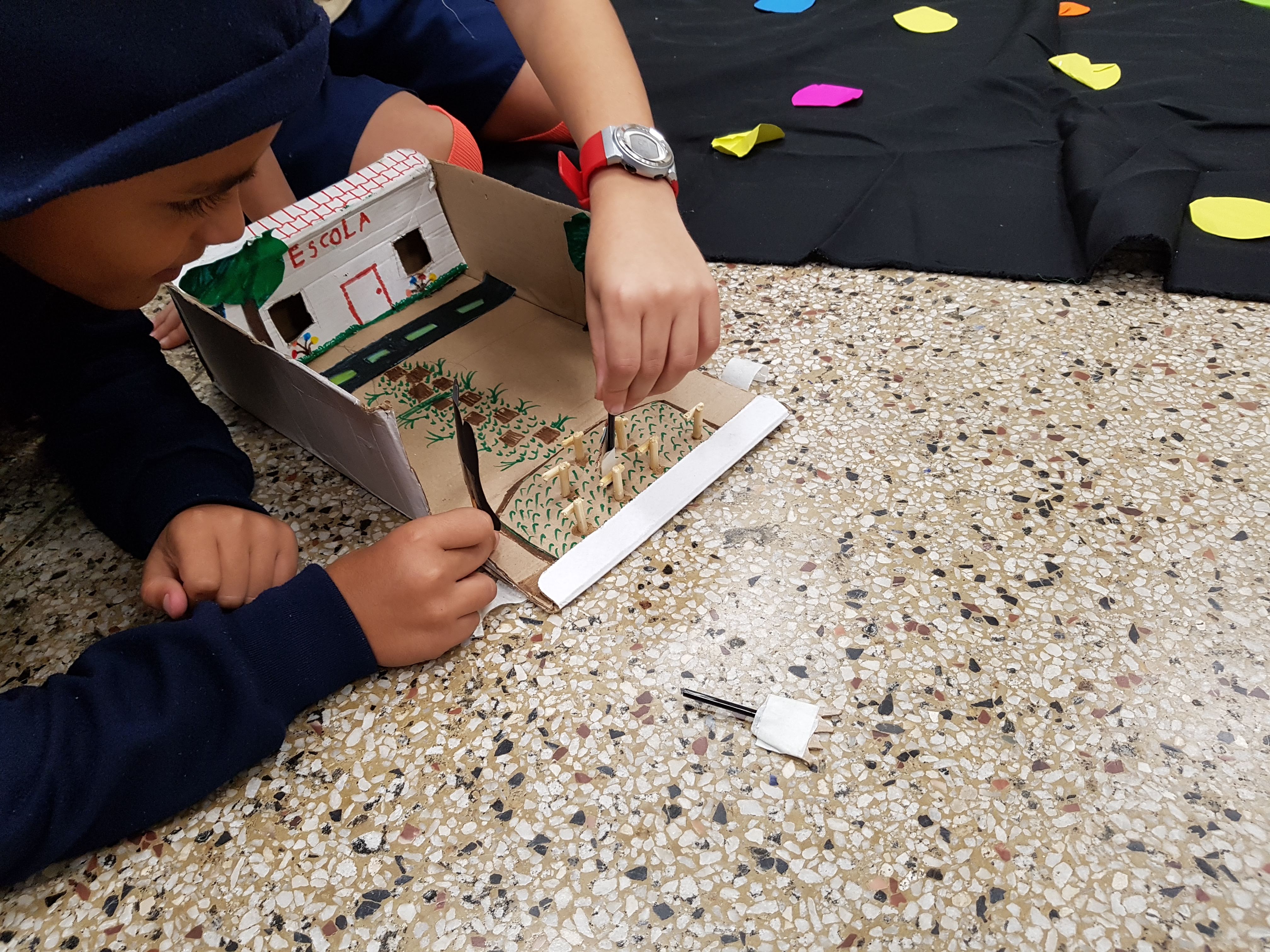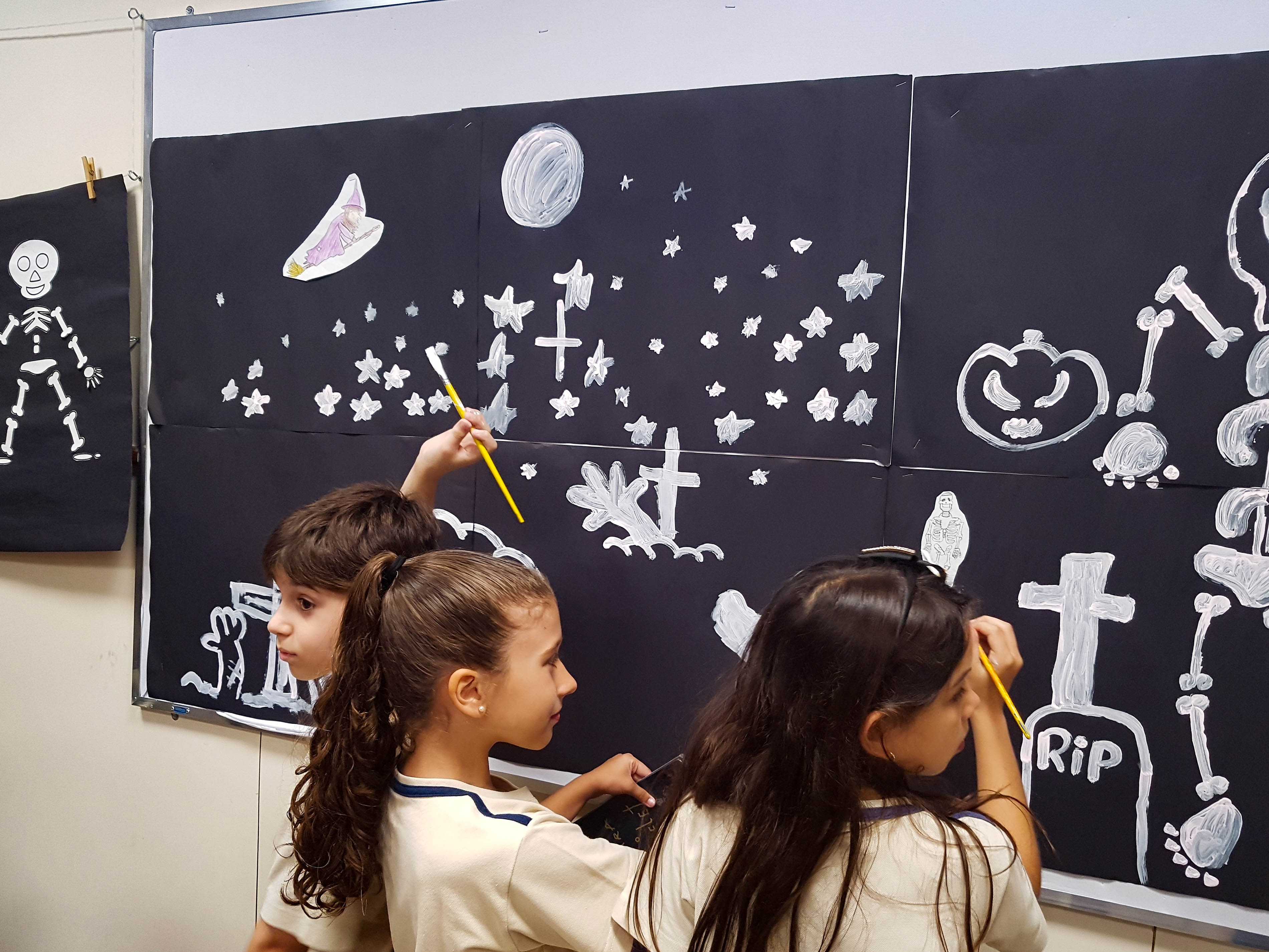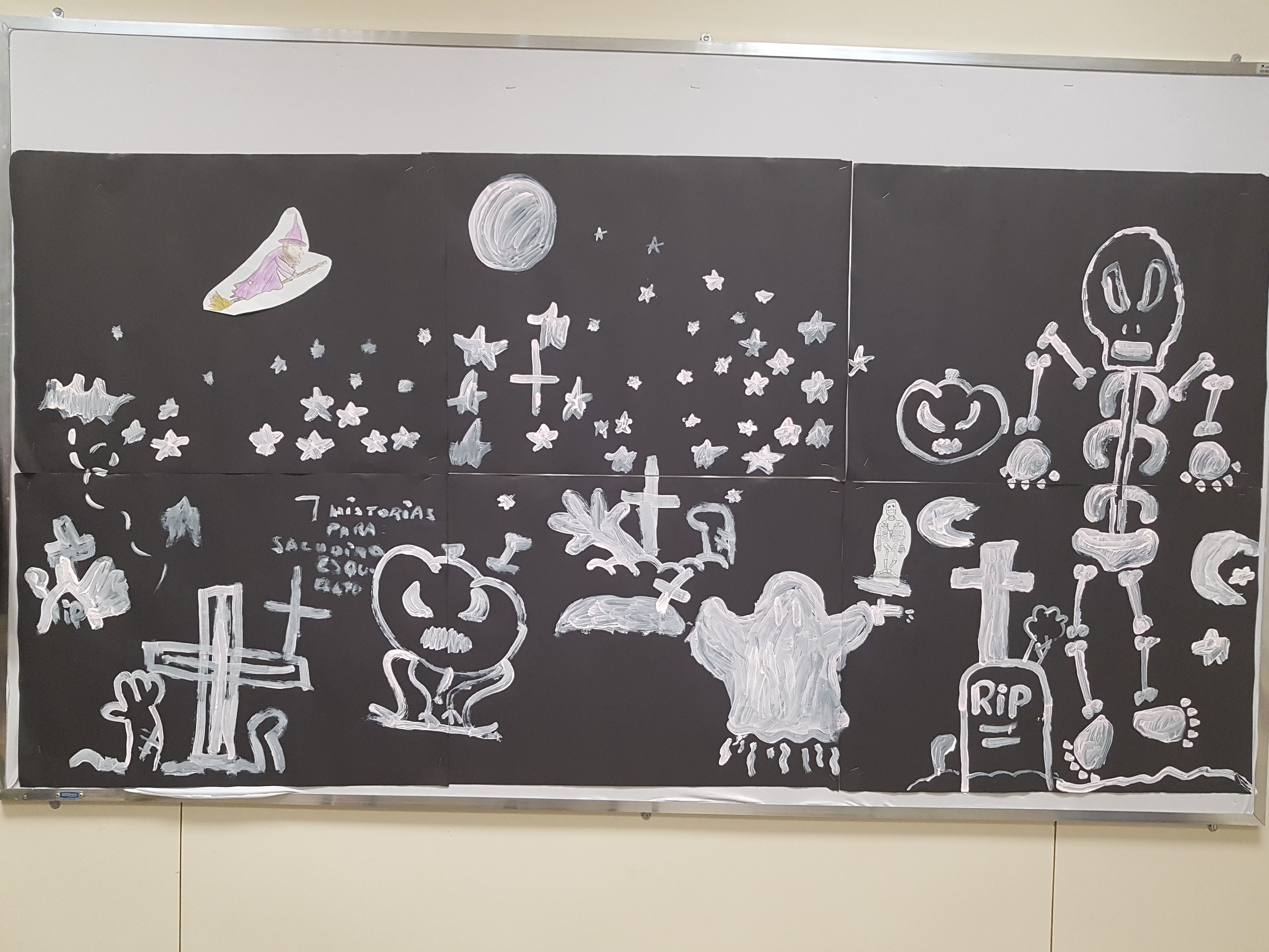 Na sala escura, foi a hora e a vez dos alunos se transformarem em contadores de histórias. Usando microfone e gravações caseiras, as histórias de terror foram recontadas permeadas por muito riso. Andreia complementa: “A ideia era ouvir as crianças contando histórias de forma criativa. Eles ajudaram a decorar a sala com suas pinturas”.