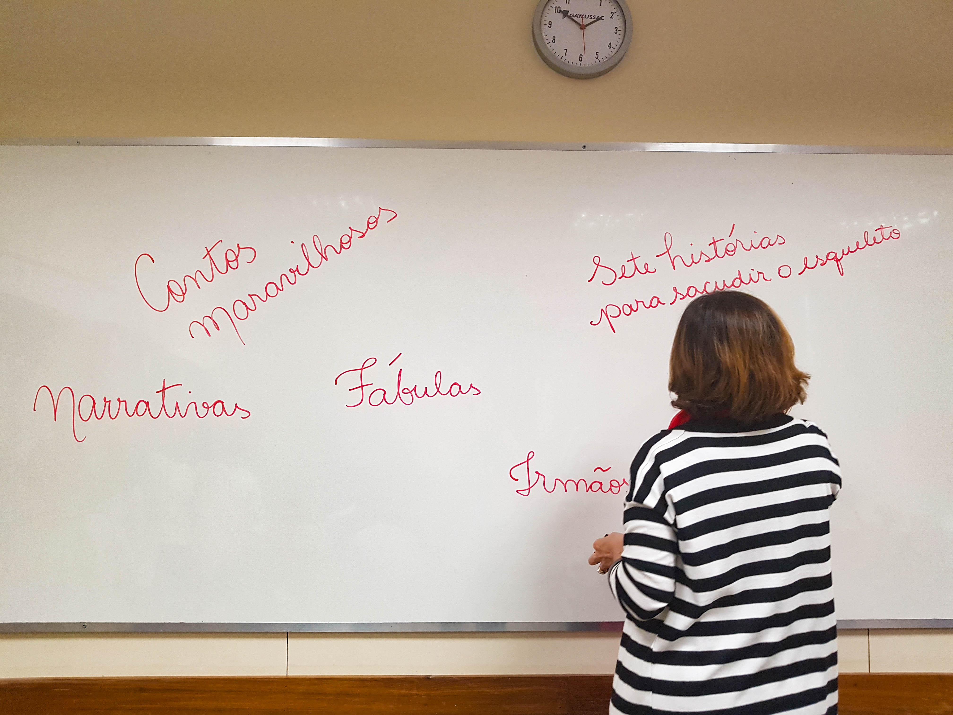 Andreia conta: “Refletimos um pouco sobre expressões como ‘de boca em boca’ e ‘quem conta um conto acrescenta um ponto’, descobrindo sobre a tradição oral das histórias e lendas populares através do livro Almanaque dos Contos de Fadas”. Sobre o conto da Chapeuzinho, a aluna Gabriela Silva conta: “A versão antiga teve um final bom para o lobo, que comeu a vovó e a Chapeuzinho, afinal ele é carnívoro. Enquanto na versão atual ele morre pelo caçador”.