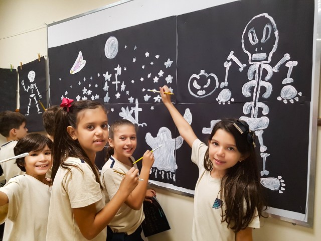 Na sala escura, foi a hora e a vez dos alunos se transformarem em contadores de histórias. Usando microfone e gravações caseiras, as histórias de terror foram recontadas permeadas por muito riso. Andreia complementa: “A ideia era ouvir as crianças contando histórias de forma criativa. Eles ajudaram a decorar a sala com suas pinturas”.