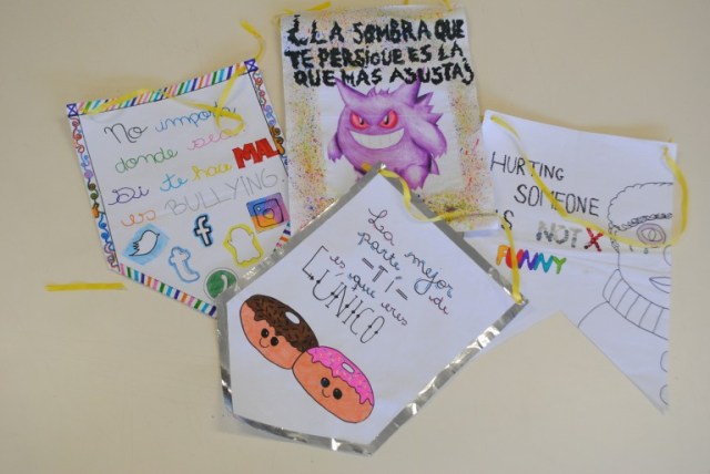 A atividade foi continuada em Espanhol, aprofundando o debate em outra língua. Todos conheceram vocabulário novo em um projeto de conscientização acerca de um problema comum à faixa etária. Divididos em grupos, produziram os estandartes em um idioma e soltaram a imaginação e a criatividade para inventar frases de efeito, decorando com fitas e purpurina.