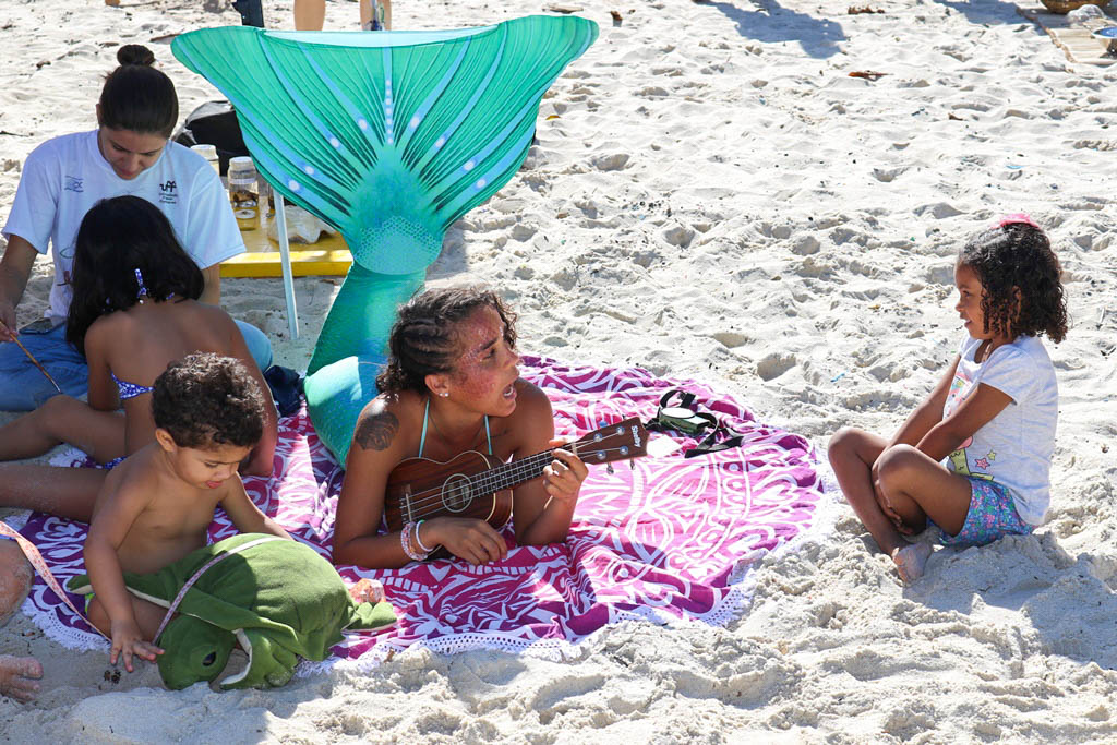 Sob olhares curiosos das nossas crianças, as alunas da UFF trouxeram recursos lúdicos, como desenho corporal e uma sereia contadora de histórias da natureza para mostrar aos pequenos a importância da preservação do meio ambiente.