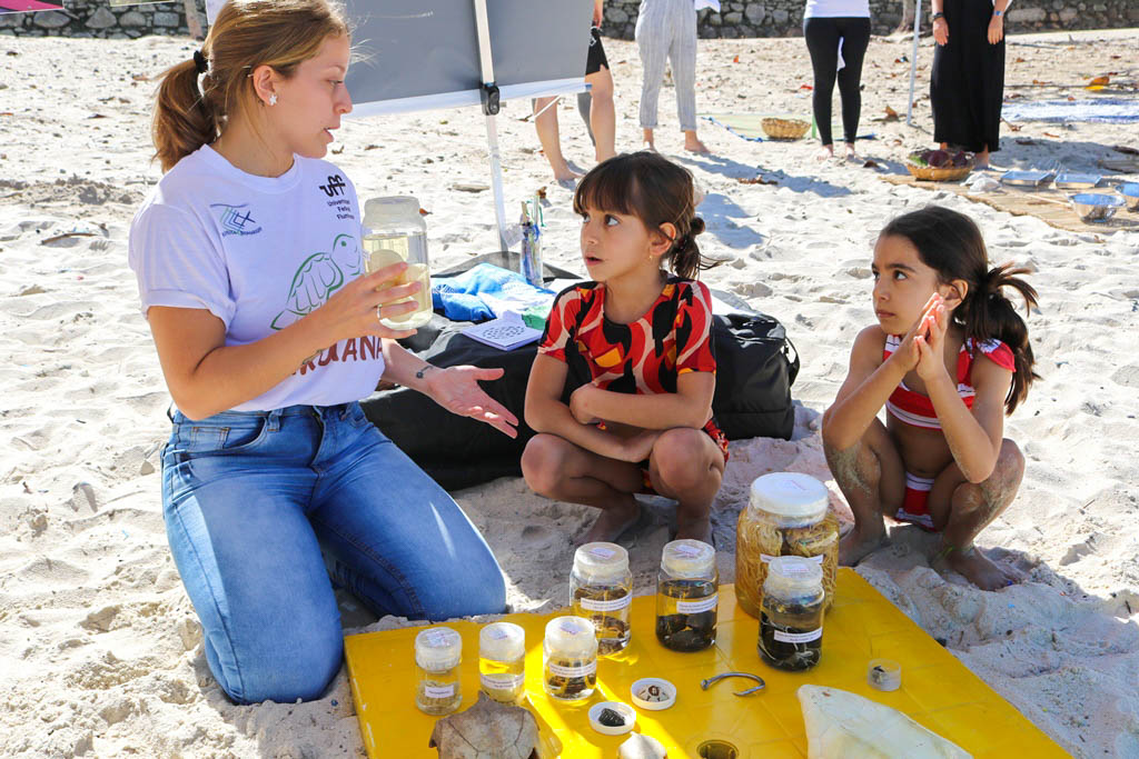 Na entrada da praia, uma rede de pesca com lixo ilustrava a importância de deixar a natureza intacta. Convidados de honra, o Projeto Aruanã marcou presença com a barraca que o nosso Clube de Ciências doou para eles no ano passado. O projeto da UFF trabalha com a preservação ambiental das tartarugas e trouxe cascos, ovos e exemplares de filhotes em formol. Um dos objetivos do projeto também é conscientizar a população da cidade através da educação ambiental.