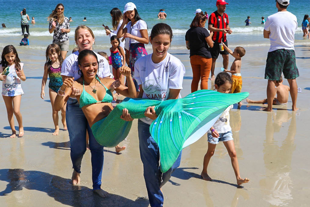 Sob olhares curiosos das nossas crianças, as alunas da UFF trouxeram recursos lúdicos, como desenho corporal e uma sereia contadora de histórias da natureza para mostrar aos pequenos a importância da preservação do meio ambiente.