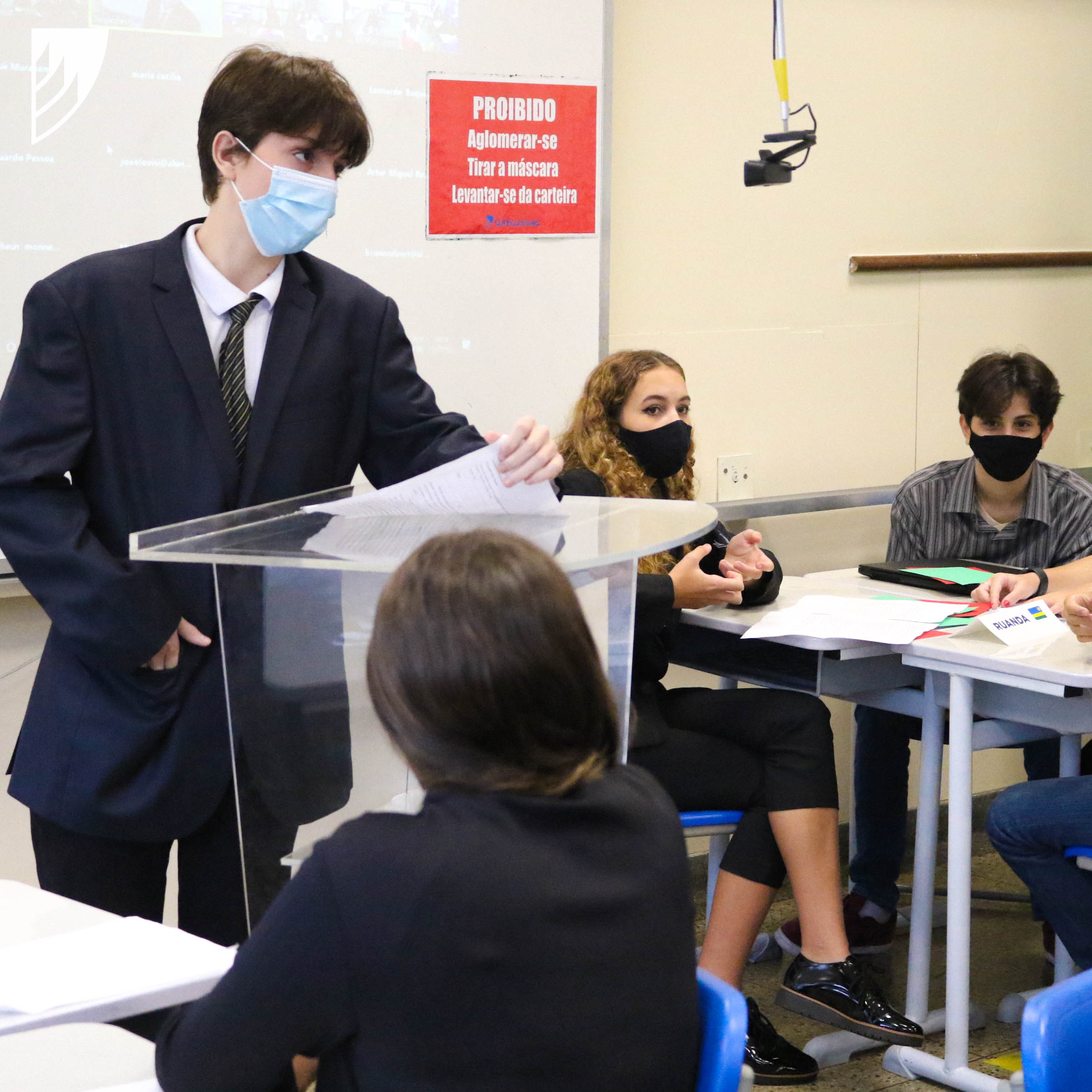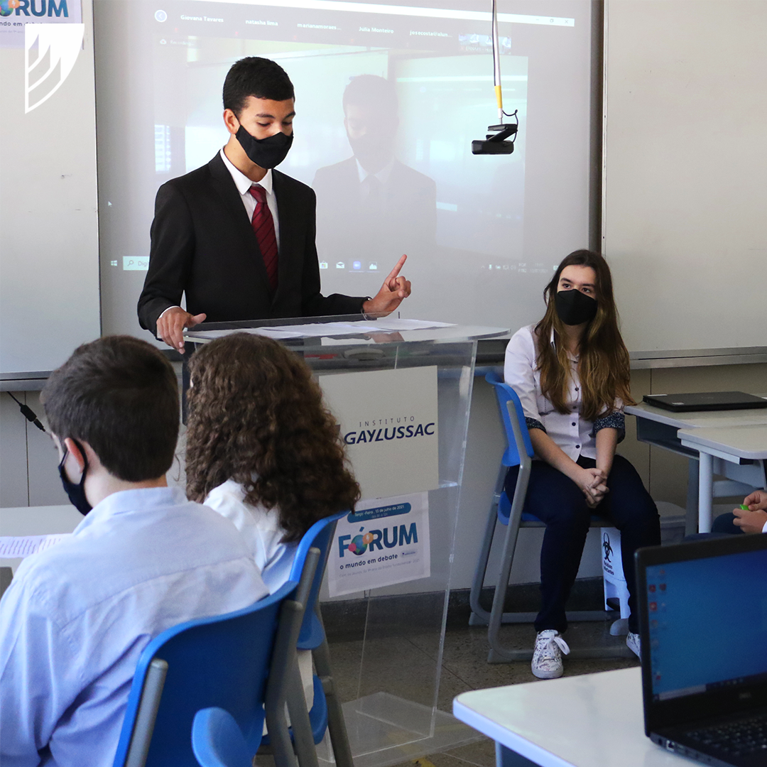 Os alunos do 9º ano apresentaram, em julho, suas delegações e argumentos acerca dos interesses e assuntos internacionais estudados em sala de aula. O Fórum é um projeto que exercita a diplomacia, instiga a reflexão sobre temas contemporâneos e trabalha habilidades como a oratória e persuasão.