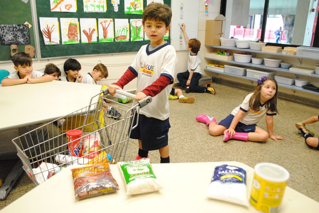 Em sala, fizeram as compras de forma dinâmica, com o shopping game, em que deveriam pegar o produto a partir do nome que sortearam. A aluna Bruna Pimentel conta o que levou: “Sugar and Nescau. This is me pushing the shopping car, the cash register and the money”. Já Manuela Buchaul comprou outras coisas: “Grapes, strawberries, grape juice and one pack of banana cookies. This is me pushing the car and this is my mommy waiting for me para levar ela para a gym”.