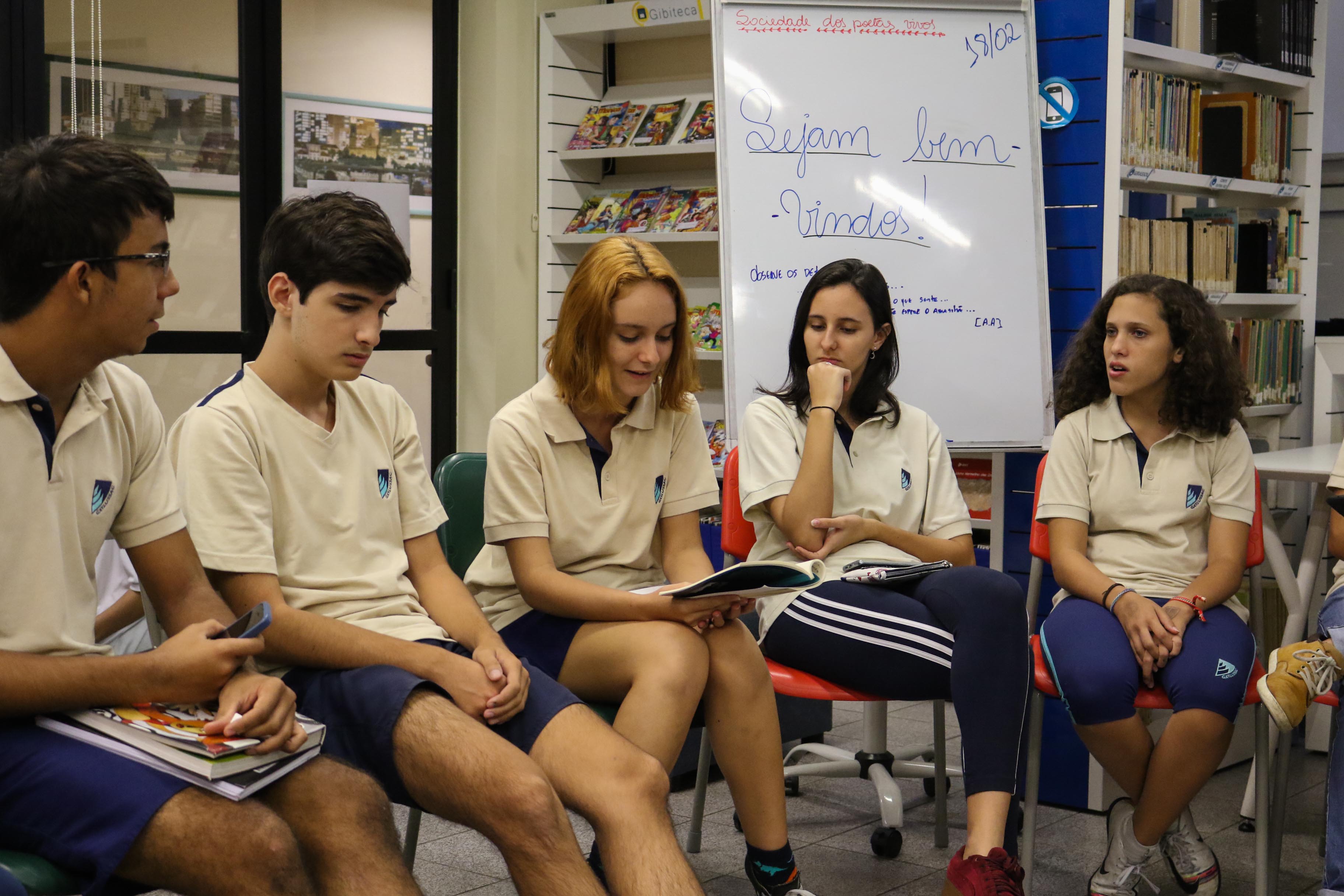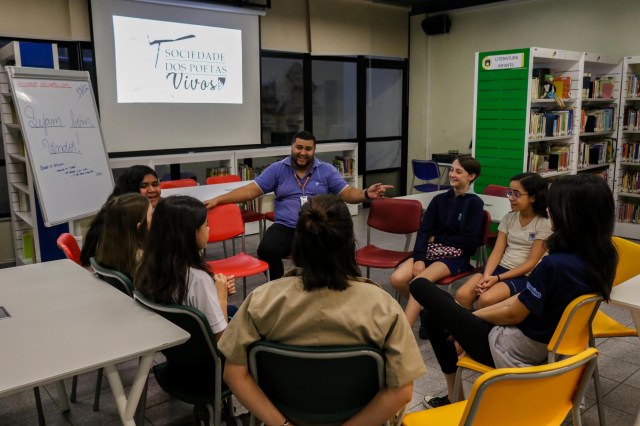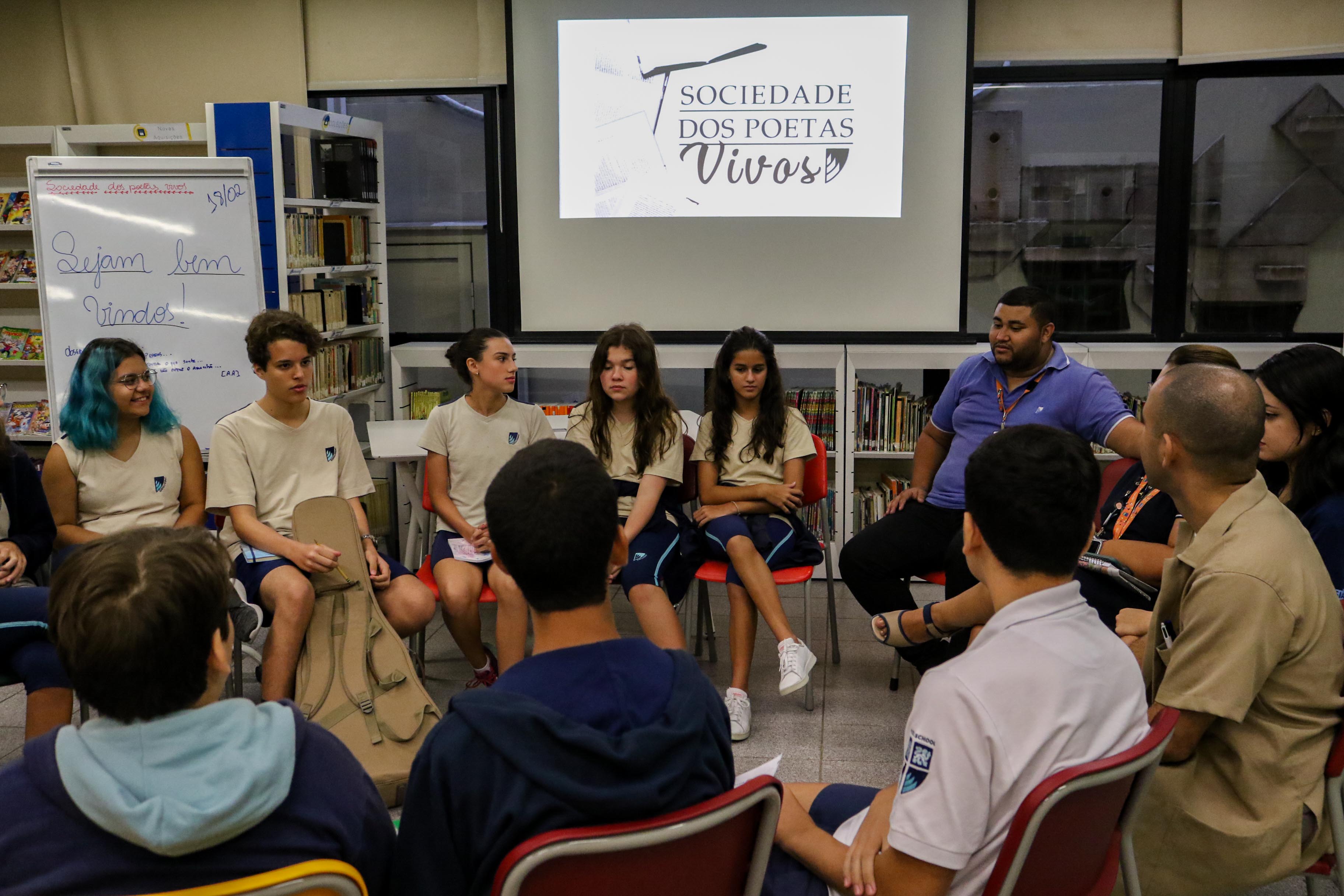 O projeto Sociedade dos Poetas Vivos teve sua primeira sessão do ano nessa terça, 18 de fevereiro. A reunião extraclasse, que acontece na última terça-feira do mês, é feita nos recreios dos alunos de Ensino Fundamental e Médio.