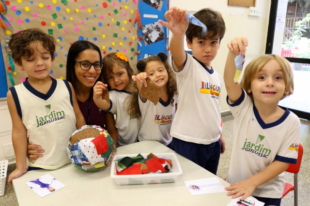 Para ajudar nessa tarefa criativa, a professora Juliana Veloso contou aos alunos a história dos insetos Belly e Dolly, que precisavam fazer um balão para ajudar um amigo que não conseguia voar. Após o conto, a turma utilizou retalhos para construir o balão, e cada aluno se desenhou viajando pelo céu.