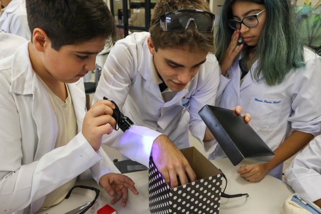 Brilha no escuro, mas é fluorescente, fosforescente ou quimioluminescente? Poucos assuntos são tão fascinantes aos estudantes quanto a luz. Assim, foi proposto às turmas da 1ª série do Ensino Médio um experimento investigativo, em que os alunos precisavam descobrir qual o motivo da luminescência observada. O objetivo das aulas práticas em laboratório é relacionar a vivência cotidiana com temas e assuntos de sala de aula, formando a ponte entre dominar um tema e torná-lo útil para novas criações.