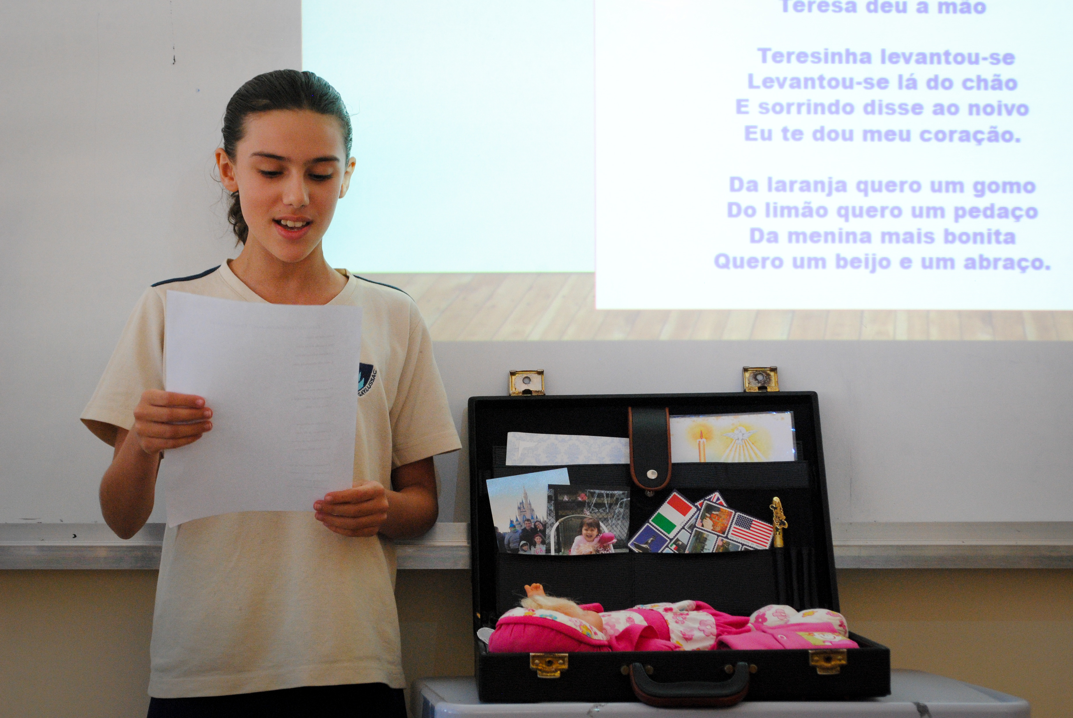 A aluna Maria Clara Gomes, da 6M2, conta: “Tudo o que seria importante, caberia dentro de uma mala”. Ela trouxe em sua bagagem as lembranças do batismo, aniversário com as amigas e histórias de quando morava em São Paulo com os pais: “Eu queria saber como foi a minha vida lá, saber como era. Muita coisa que eu não fazia ideia, como preferências que eu tinha antes e que eu não tenho agora. Coisas que mudaram. Eu fiquei muito feliz em poder rever tudo aquilo”.