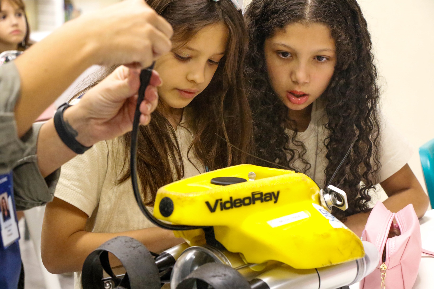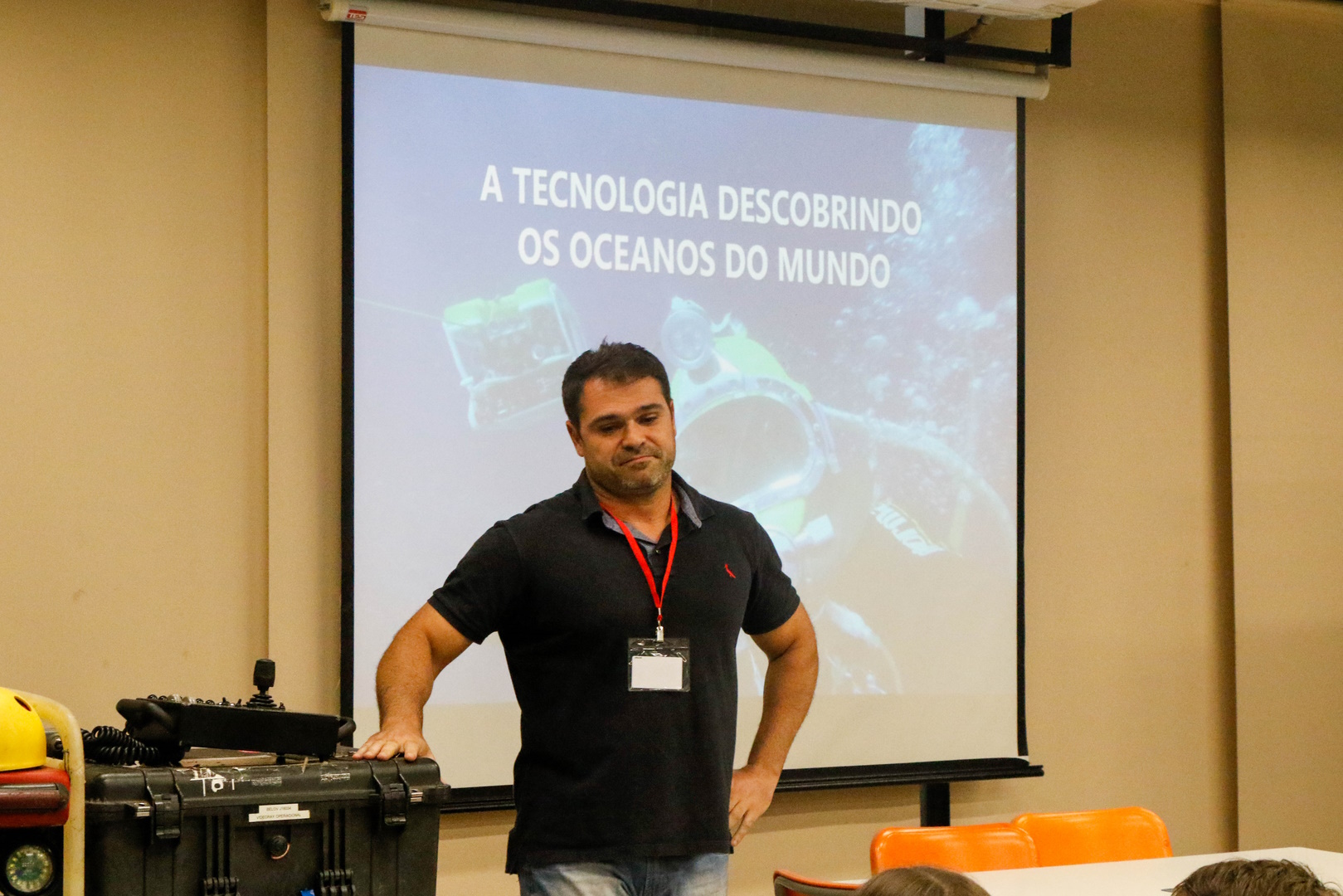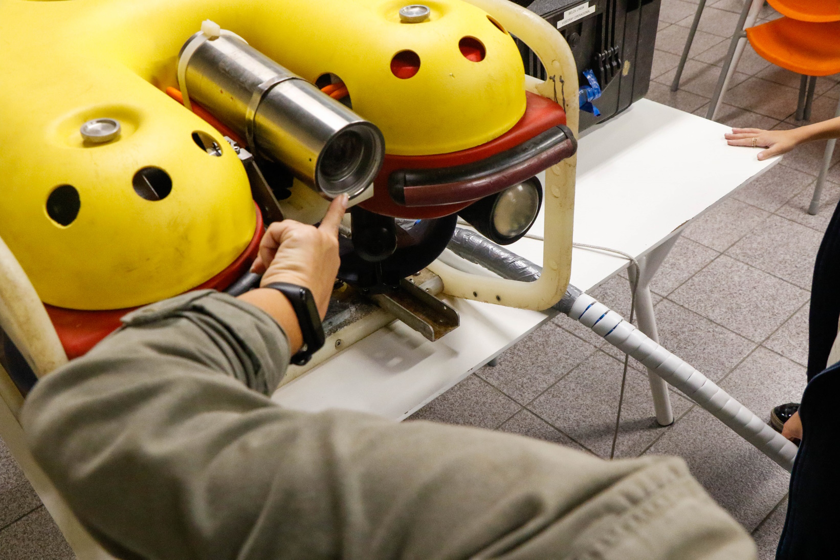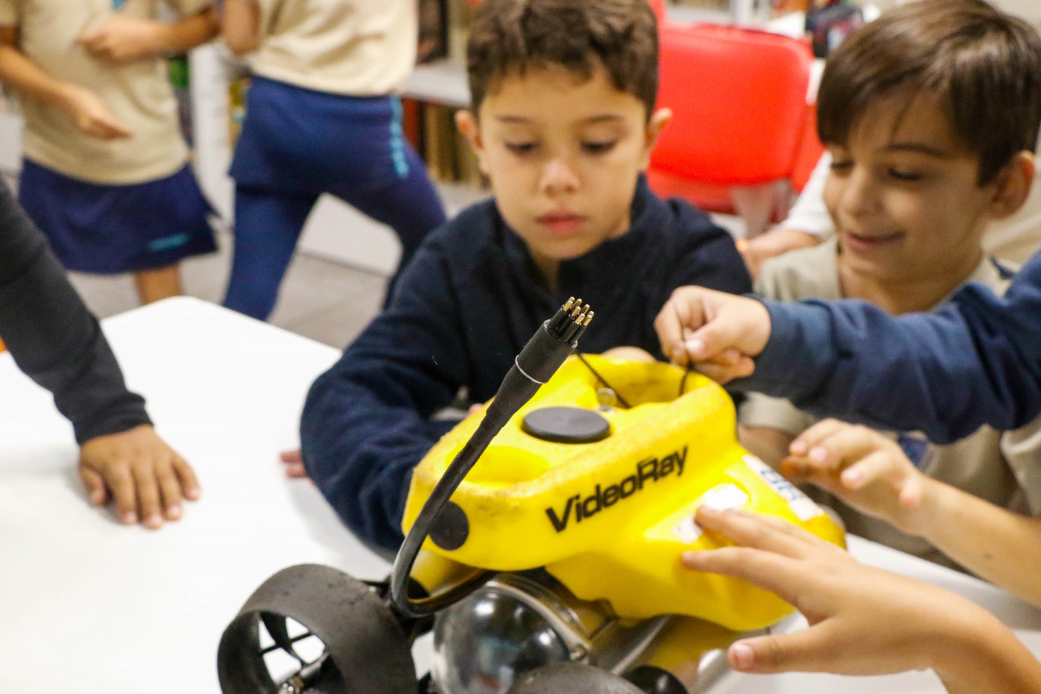 Além disso, a turma também recebeu a visita do Raphael, gerente de embarcações, e do superintendente de mergulho André, para uma conversa. Eles trouxeram ROVs – veículos subaquáticos operados remotamente – para a observação das crianças e falaram um pouco de como é o trabalho no fundo do mar.