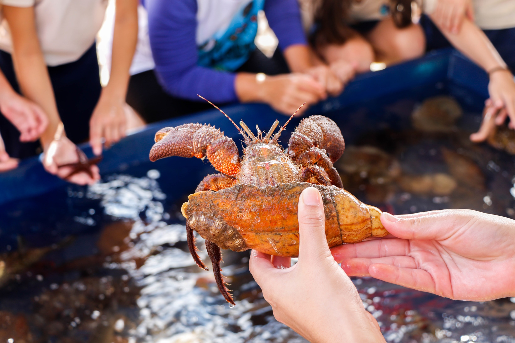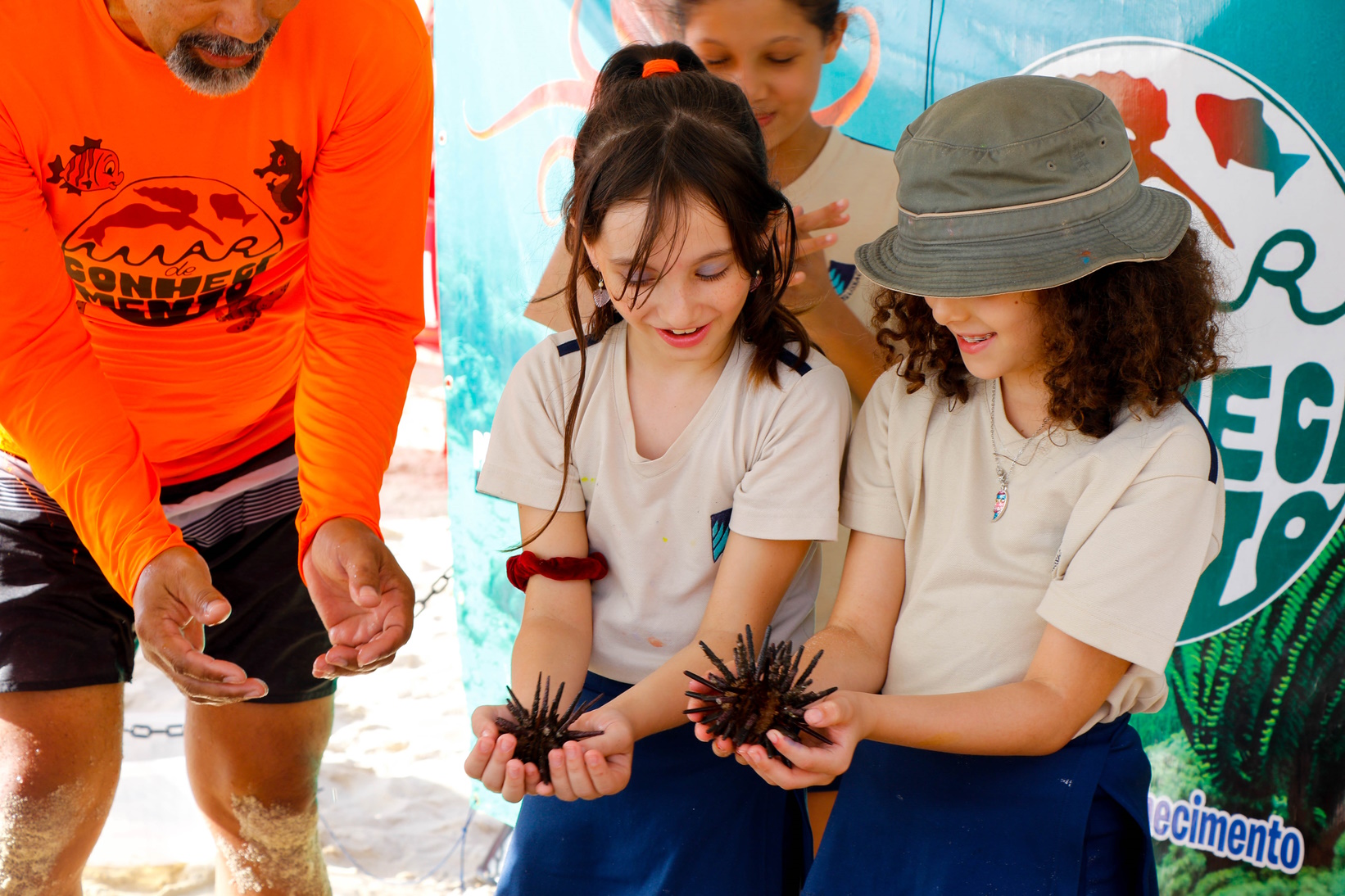 “Vimos animais muito interessantes e que nem sabíamos que existiam, como a bolacha-do-mar. E alguns deles a gente não pôde tocar, porque eram muito sensíveis ou porque poderiam nos machucar. A estrela-do-mar, por exemplo, era sensível, mas podíamos tocar nela com cuidado e tínhamos que ficar molhando ela”, Bernardo e Luisa, alunos da 3T3