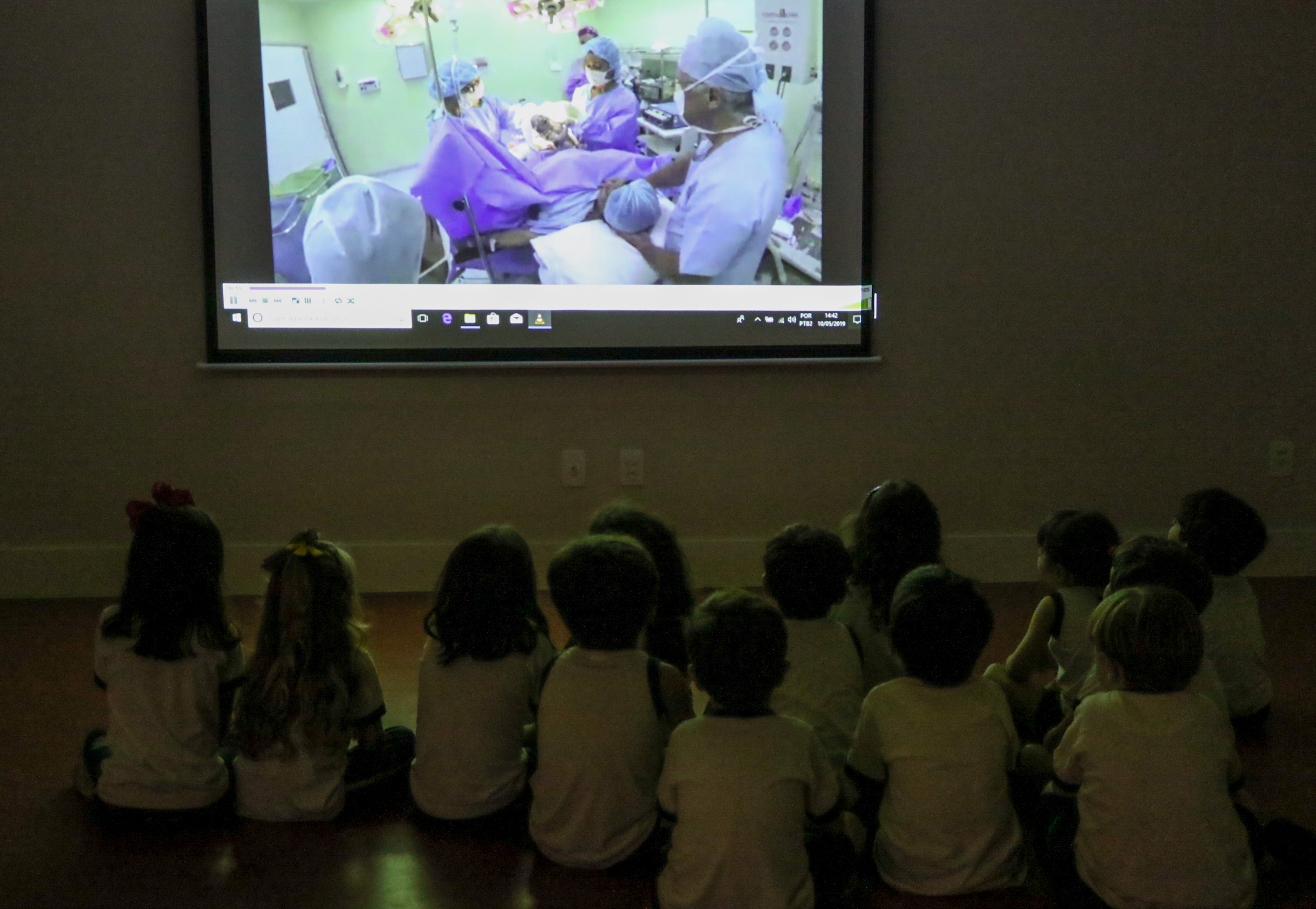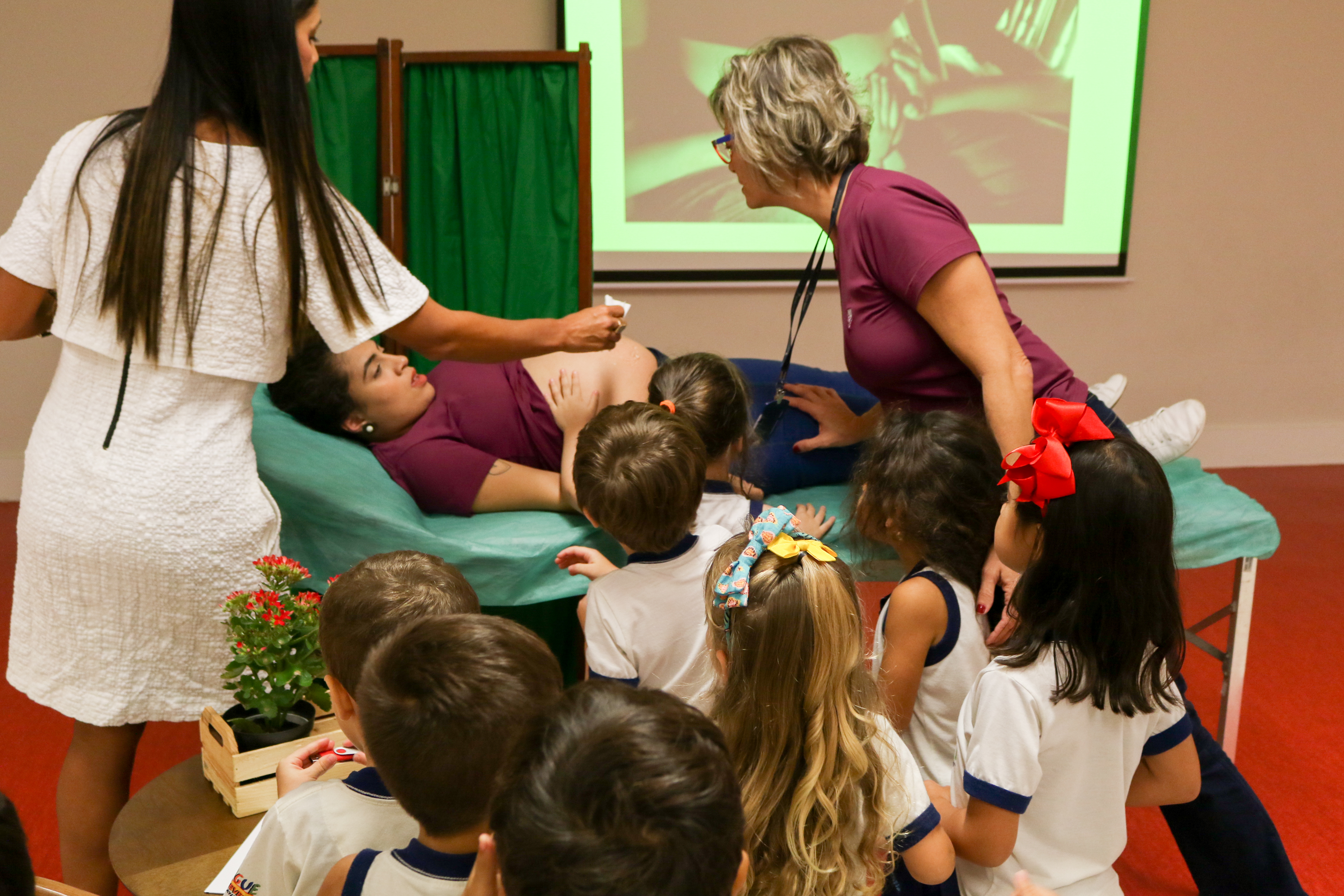 O mundo onde as crianças vive se constitui em um conjunto de fenômenos naturais e sociais diante do qual elas se mostram curiosas e investigativas. Quando o ano letivo começa, as professoras procuram ficar atentas a essas curiosidades pois delas podem nascer o objeto de estudo dos Clubes de Pesquisa. Este ano o tema da turma J2T4 surgiu nas primeiras semanas com a gravidez da professora Karen Souza: “Tem um bebê aí dentro?”, “Como ele faz para comer?”, “Ele faz xixi?”, “Ele chora?”. Por isso, em maio, os pequenos exploradores participaram de uma palestra com a obstetra Thays Jurgio, para descobrir como é a vida do bebê ainda na barriga e os processos da chegada dele ao mundo.