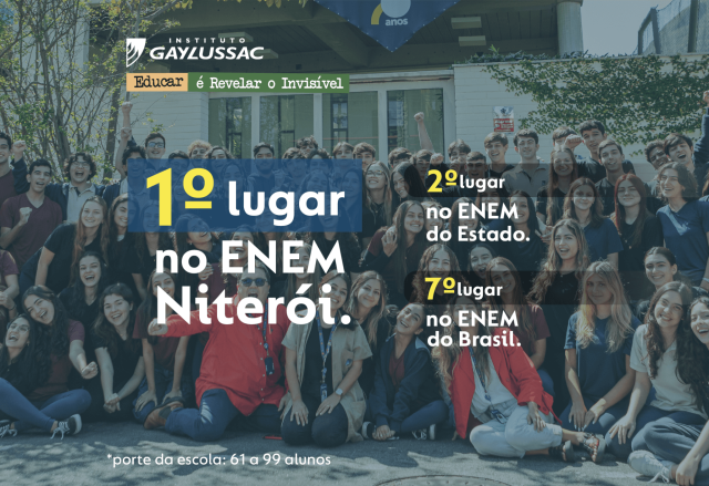 É a 15ª vez que o GayLussac alcança o topo do ranking do ENEM. Somos 1º em Niterói, 4º no Estado do Rio de Janeiro e 15º no Brasil no ENEM de acordo com o site da AIO para escolas com porte de 61 a 99 alunos. Dentre os 82 formandos de 2023, 78 já são universitários, um índice de 95% de aprovação em universidades públicas, privadas e internacionais, totalizando 186 vagas conquistadas individualmente.