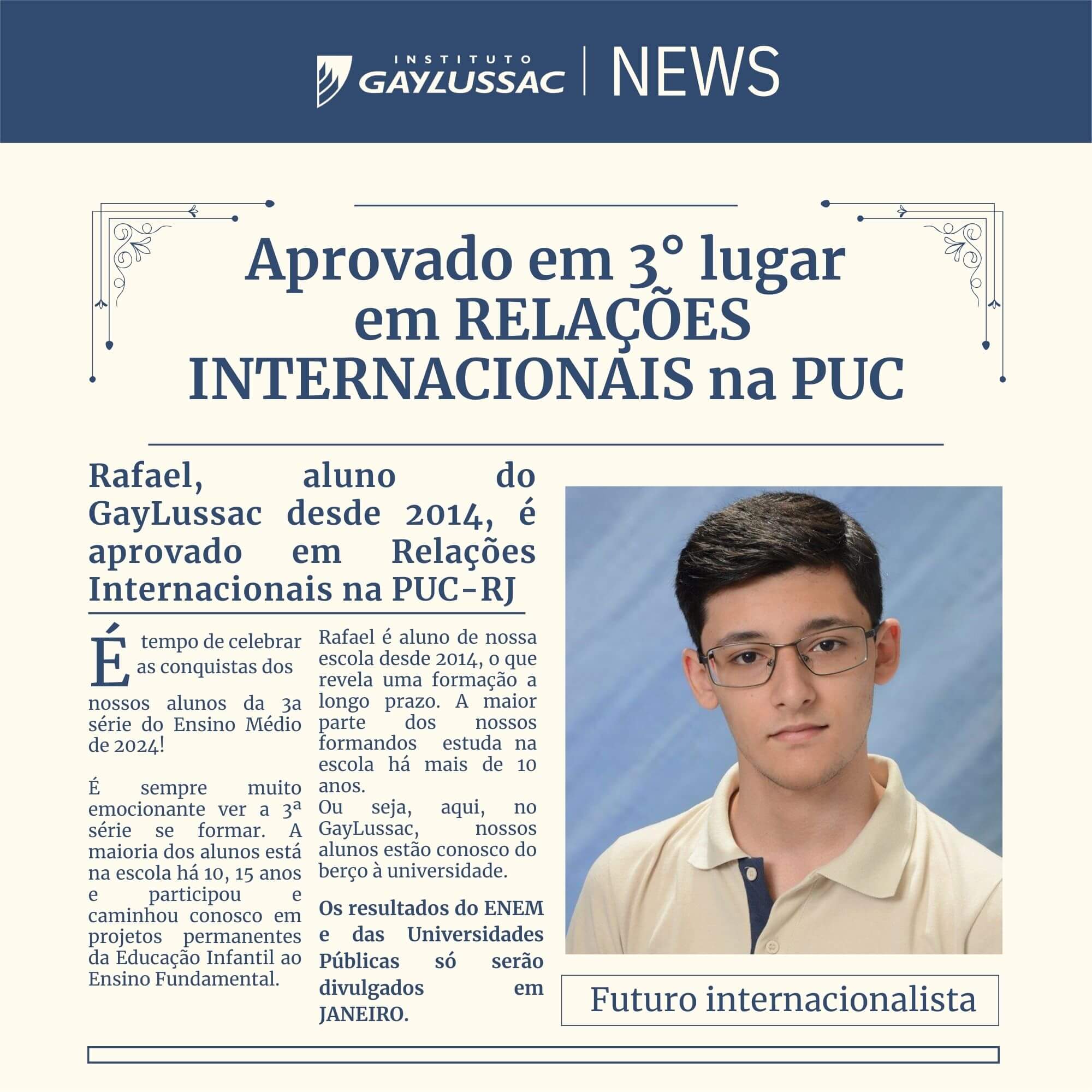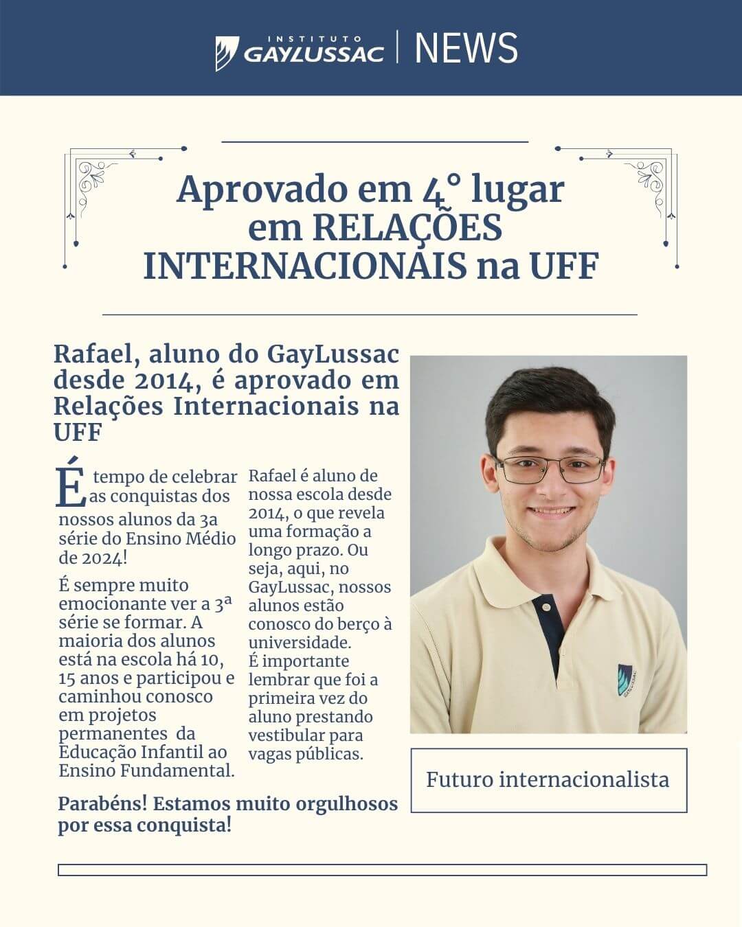 No cenário internacional, o Instituto GayLussac também se destacou com aprovações em renomadas universidades no exterior, reforçando nosso compromisso com a internacionalização do aprendizado e com a formação de cidadãos do mundo.
