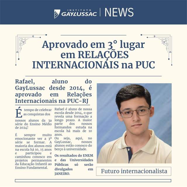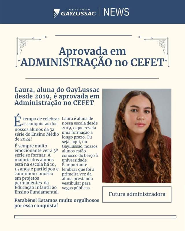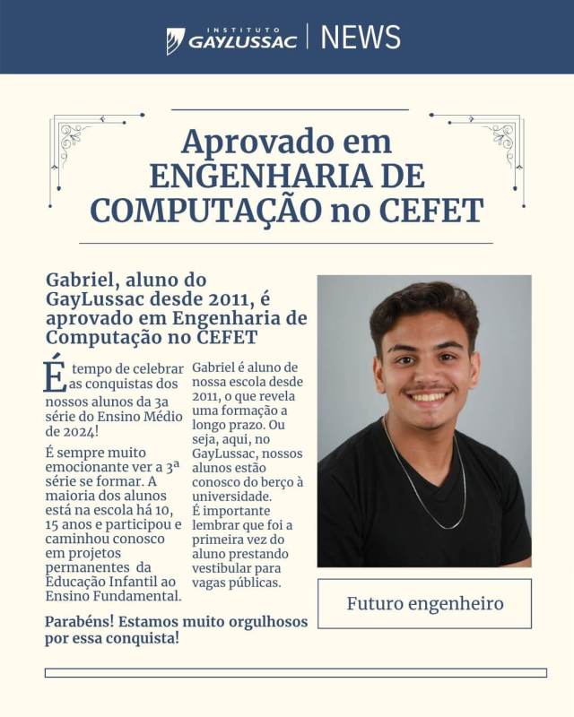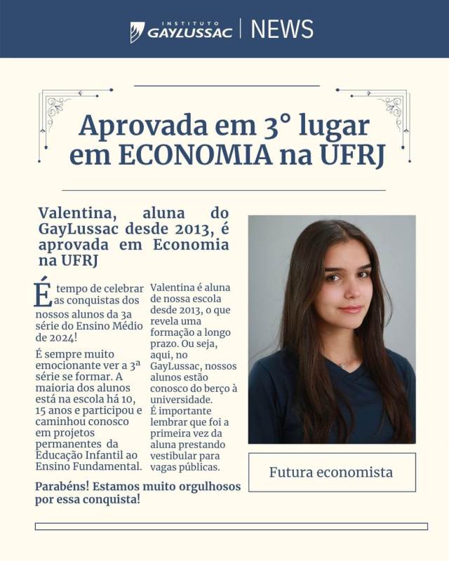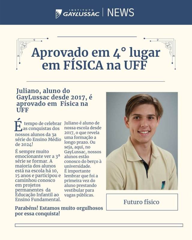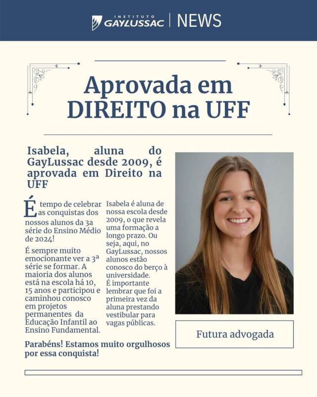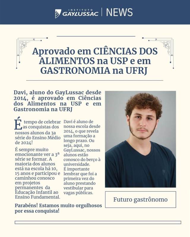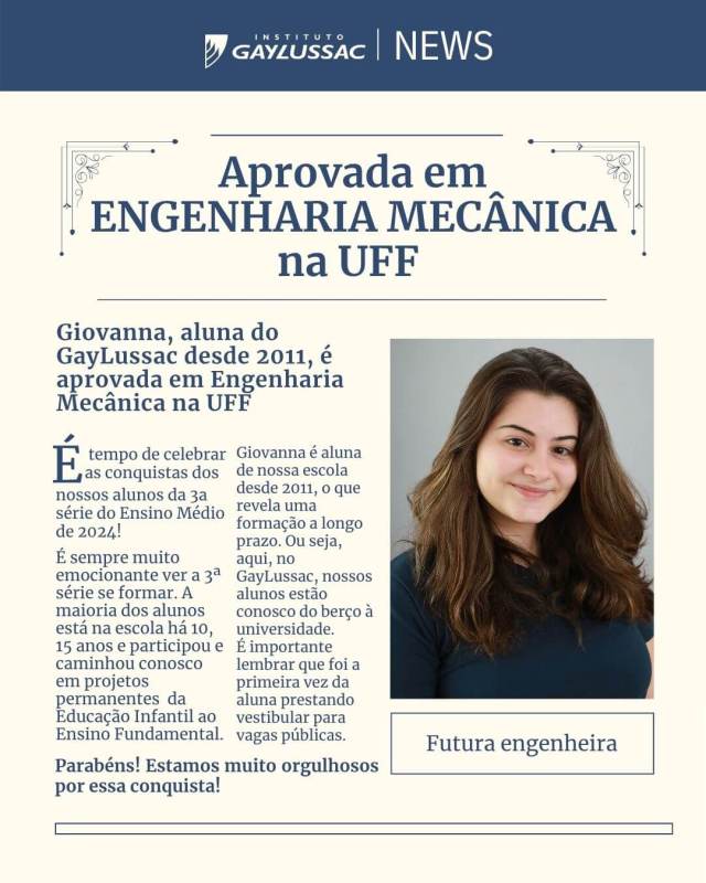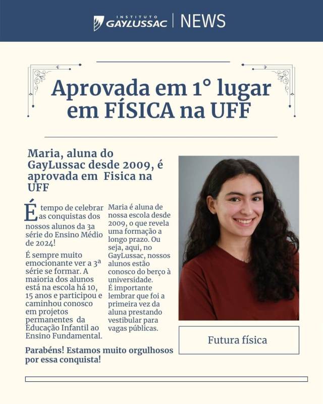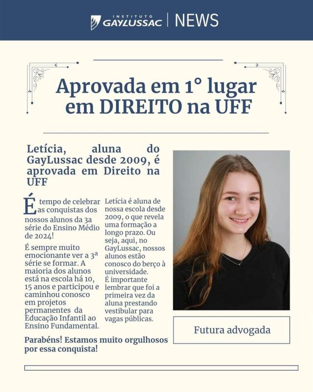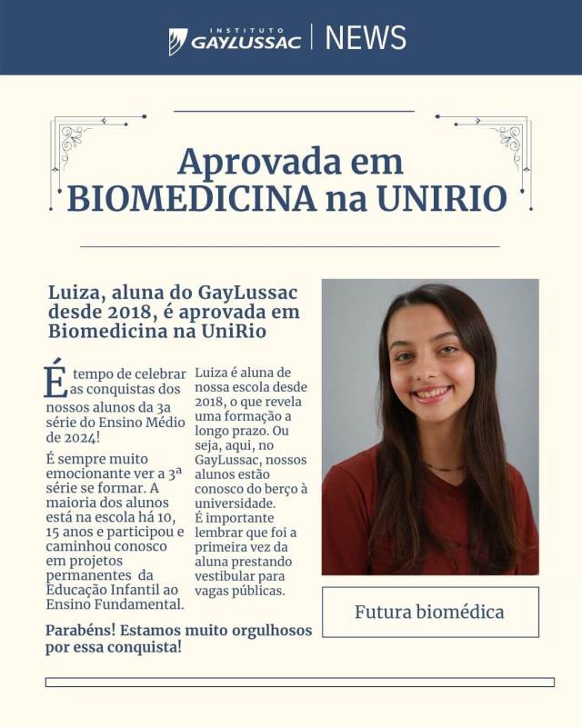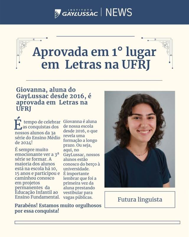 O Instituto GayLussac tem o orgulho de anunciar os resultados das aprovações de seus alunos da 3ª série do Ensino Médio em 2024. Foram 151 vagas conquistadas em universidades públicas, privadas e internacionais, por 77 alunos com apenas 17 anos. Um marco que comprova a força do nosso projeto pedagógico, pautado na excelência acadêmica, na formação crítica e na valorização do protagonismo juvenil.