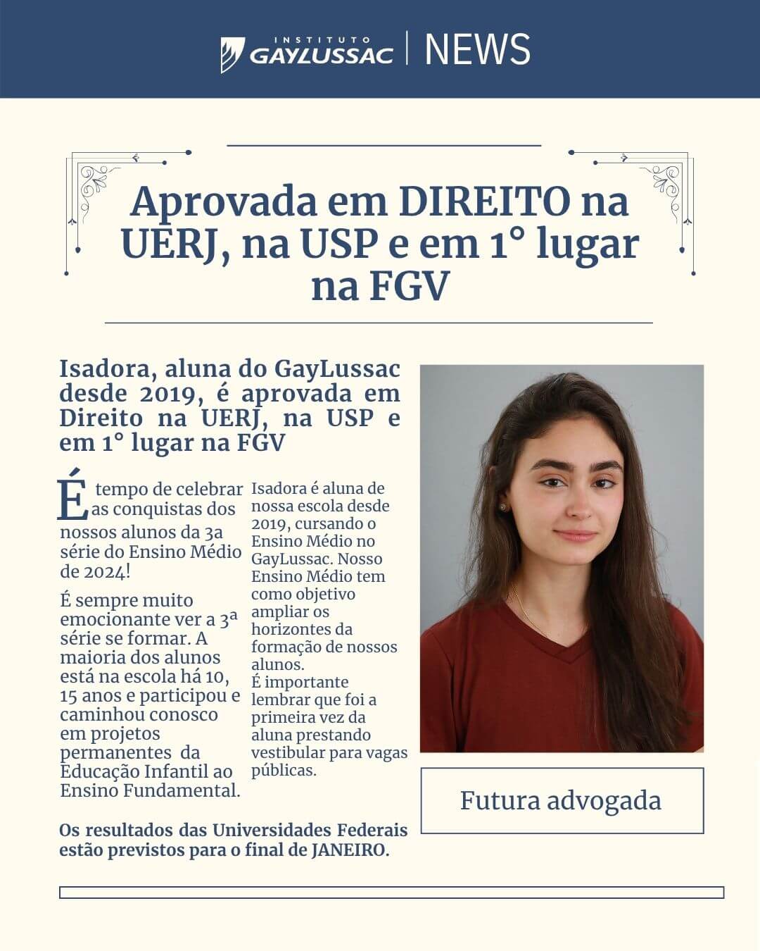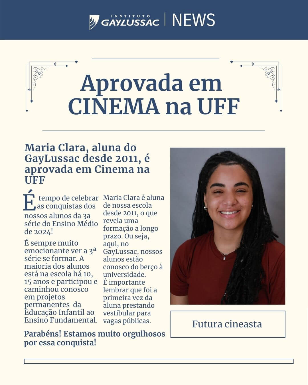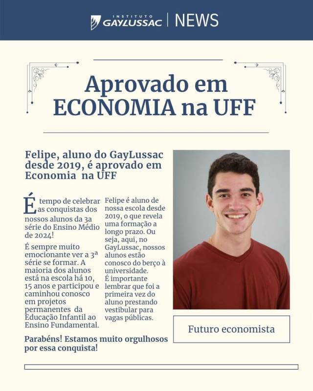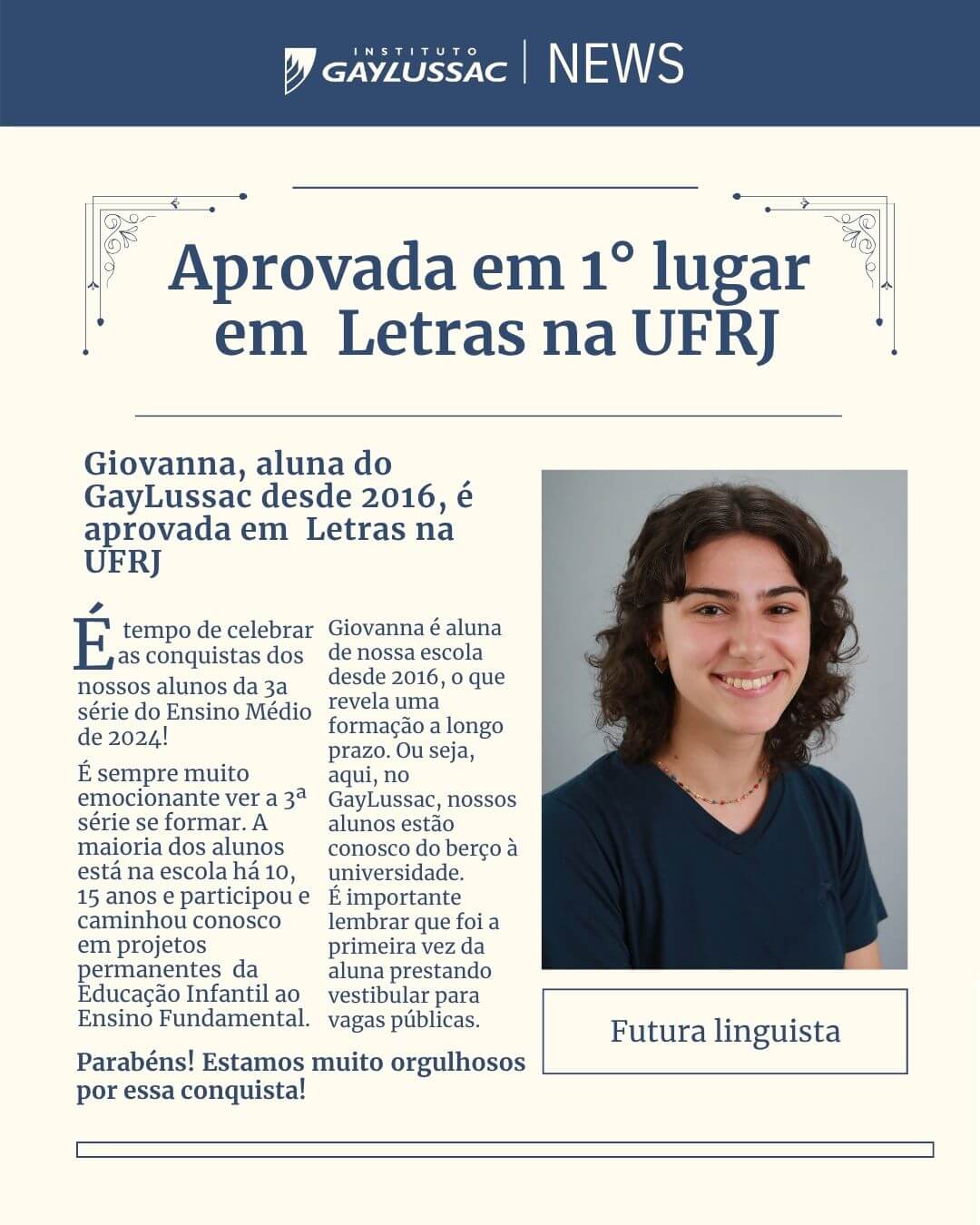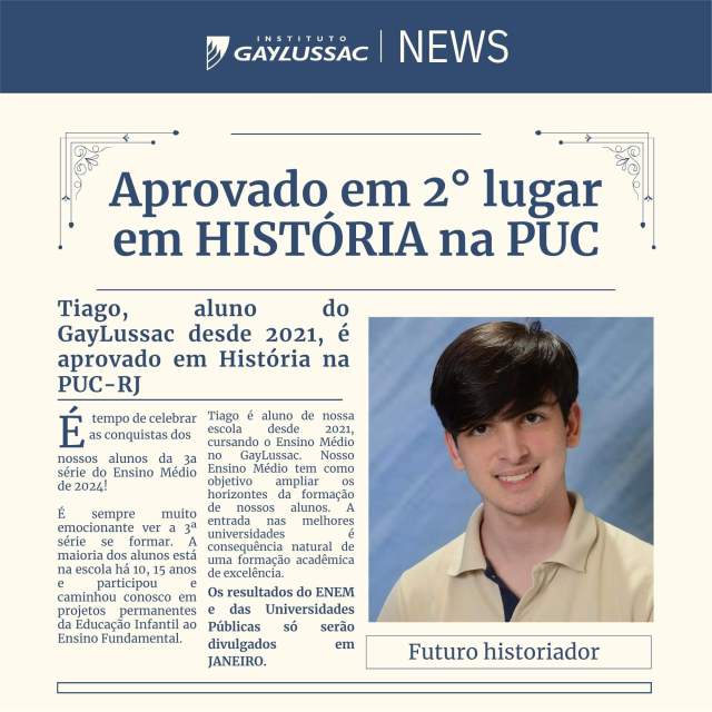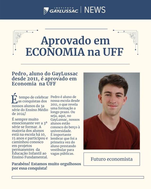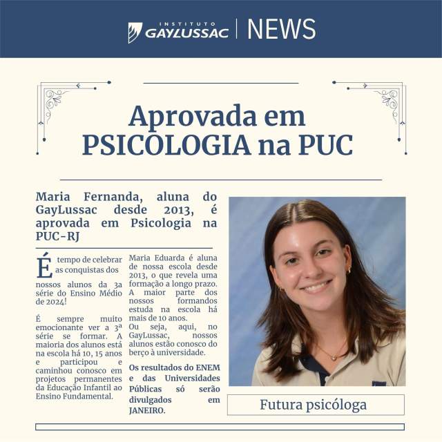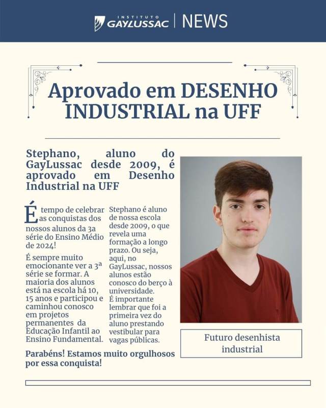 O Instituto GayLussac tem o orgulho de anunciar os resultados das aprovações de seus alunos da 3ª série do Ensino Médio em 2024. Foram 151 vagas conquistadas em universidades públicas, privadas e internacionais, por 77 alunos com apenas 17 anos. Um marco que comprova a força do nosso projeto pedagógico, pautado na excelência acadêmica, na formação crítica e na valorização do protagonismo juvenil.