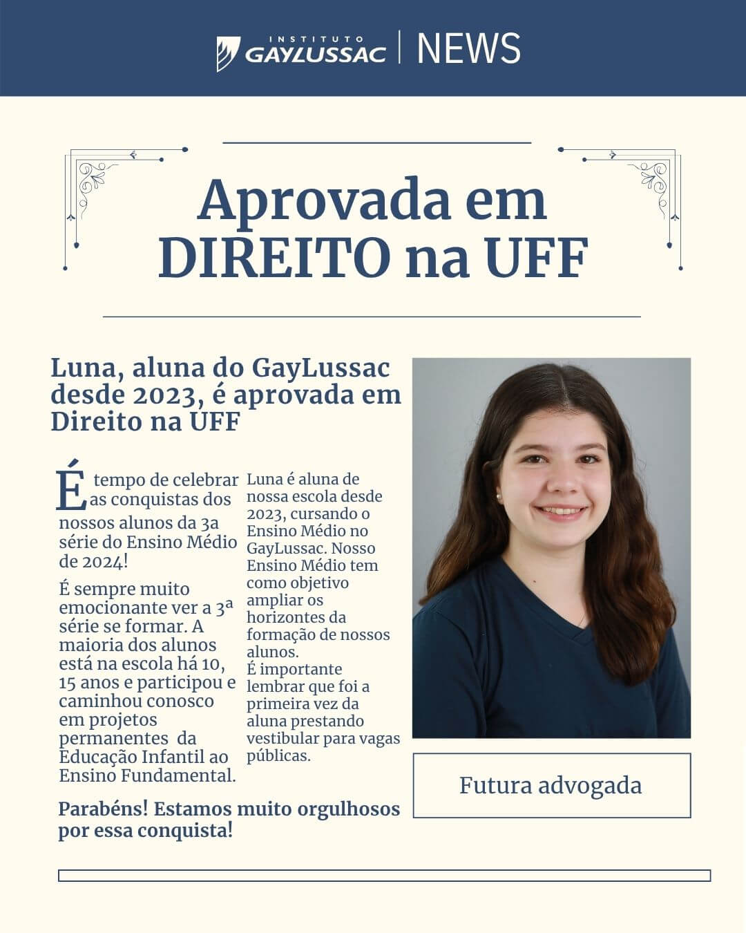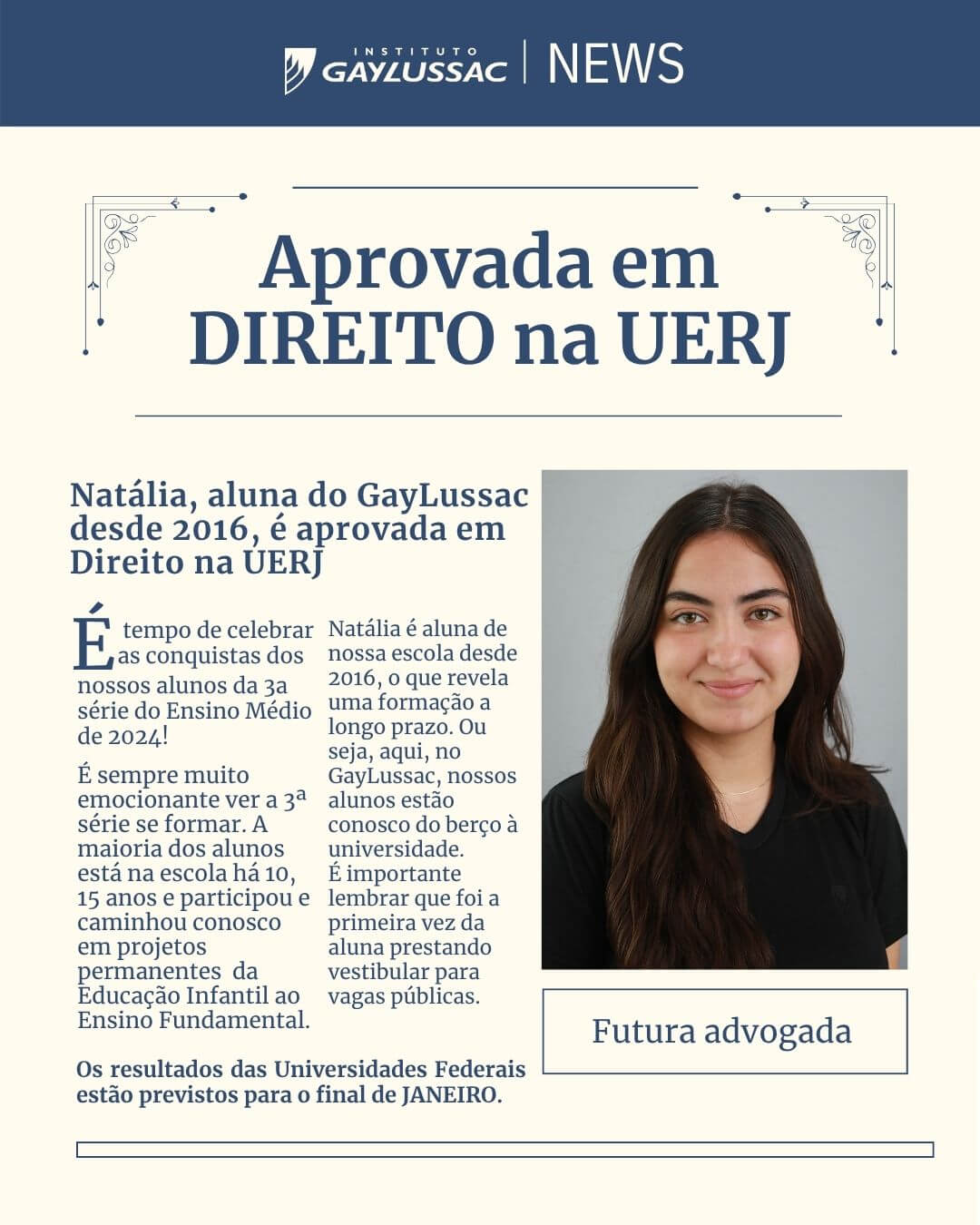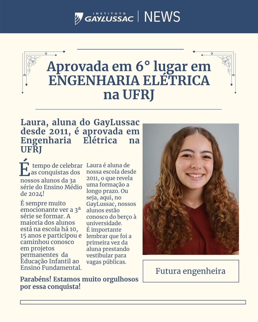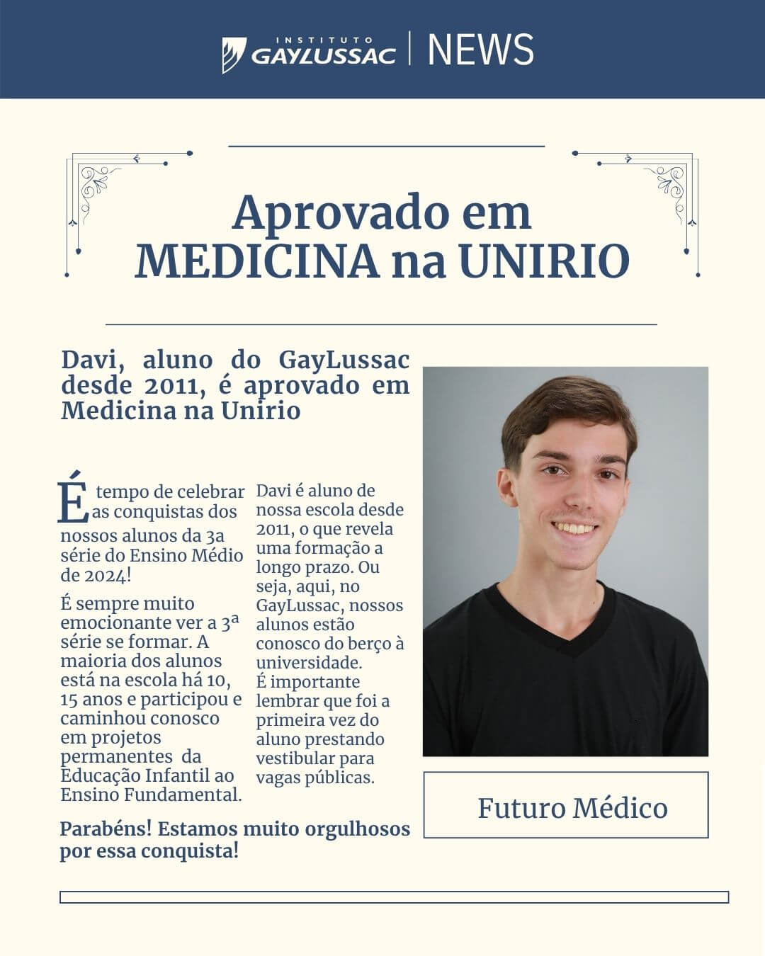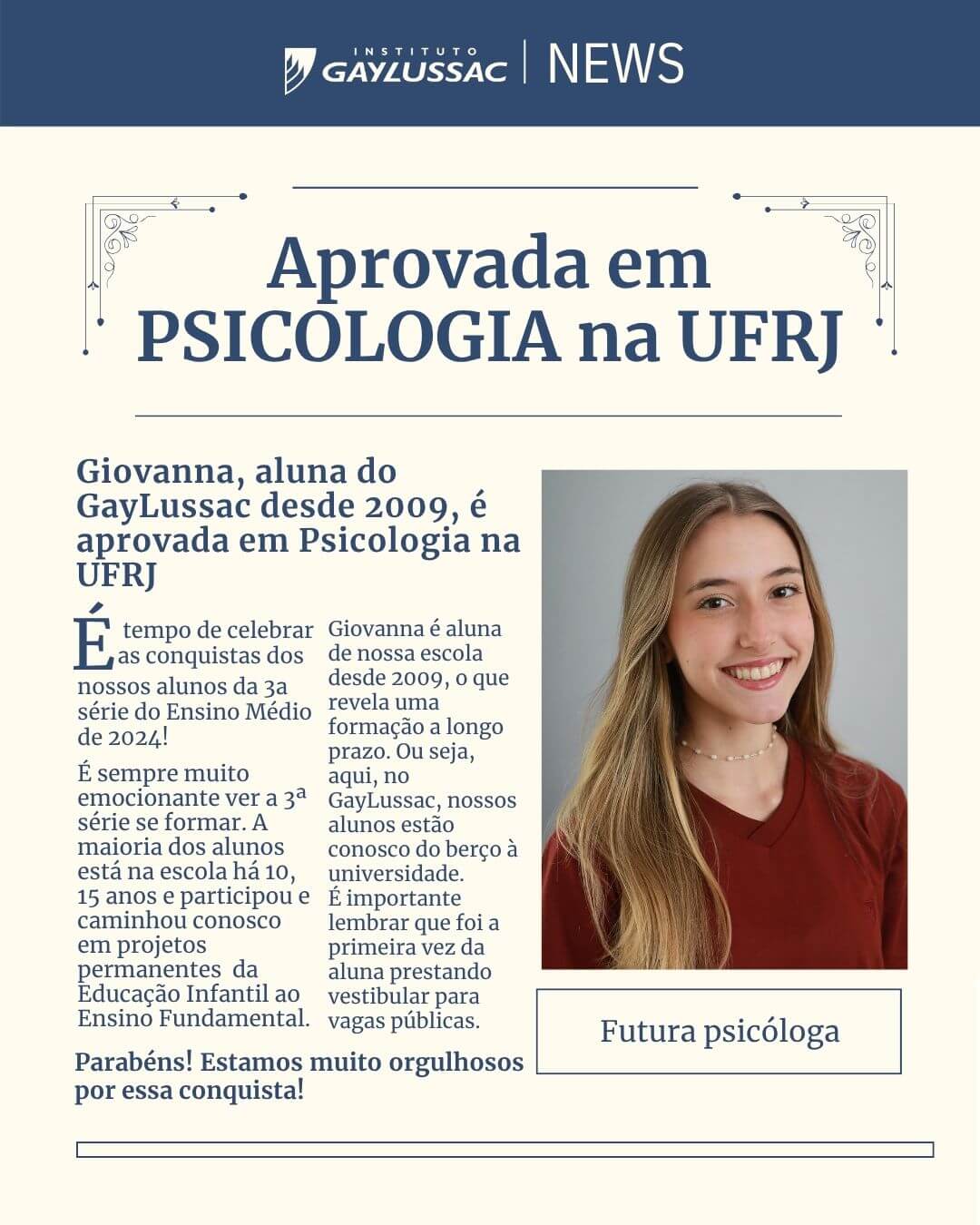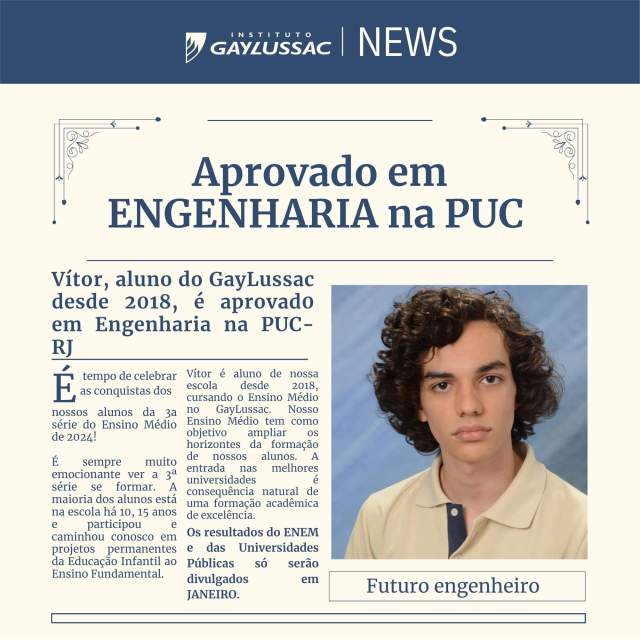 O Instituto GayLussac tem o orgulho de anunciar os resultados das aprovações de seus alunos da 3ª série do Ensino Médio em 2024. Foram 151 vagas conquistadas em universidades públicas, privadas e internacionais, por 77 alunos com apenas 17 anos. Um marco que comprova a força do nosso projeto pedagógico, pautado na excelência acadêmica, na formação crítica e na valorização do protagonismo juvenil.