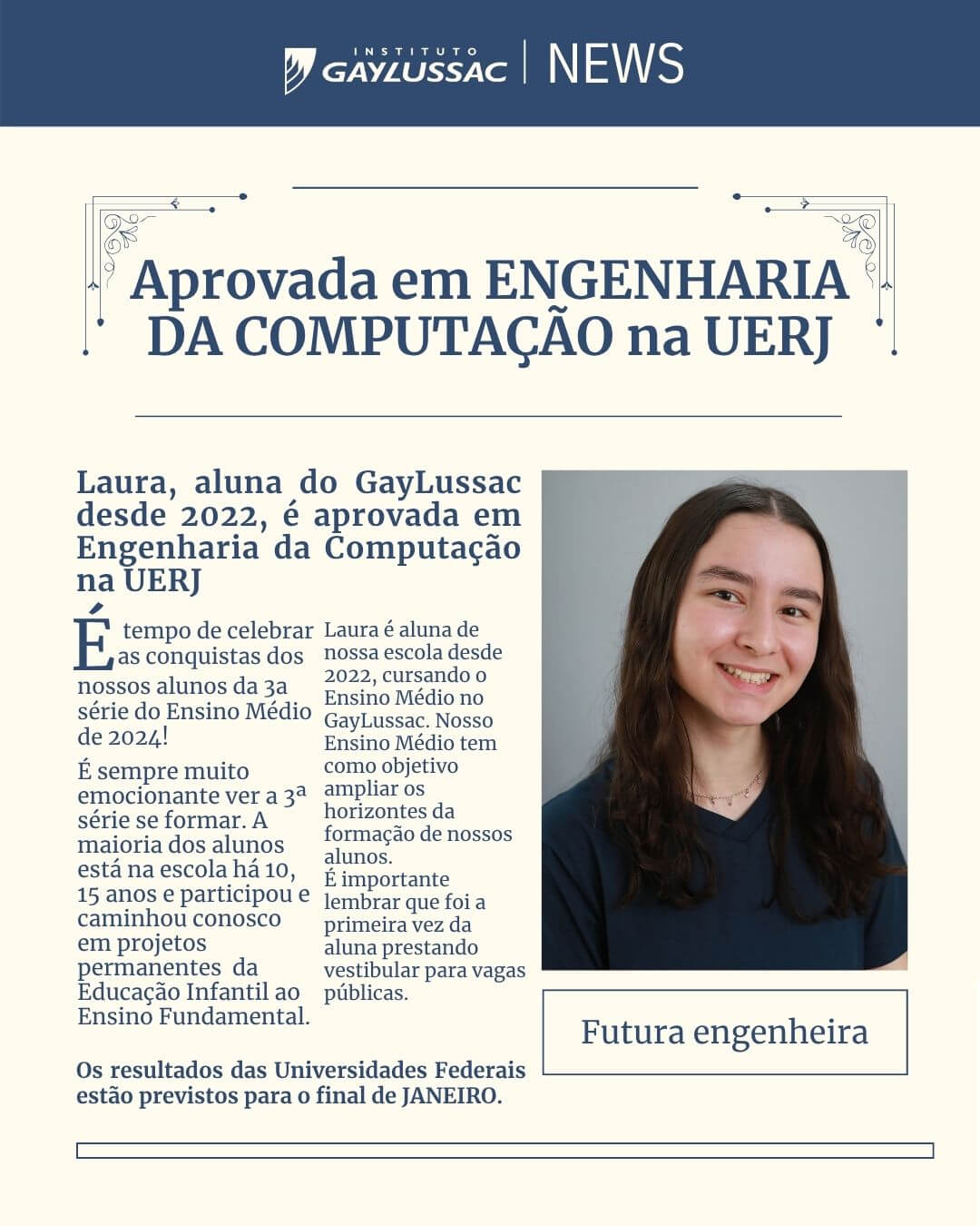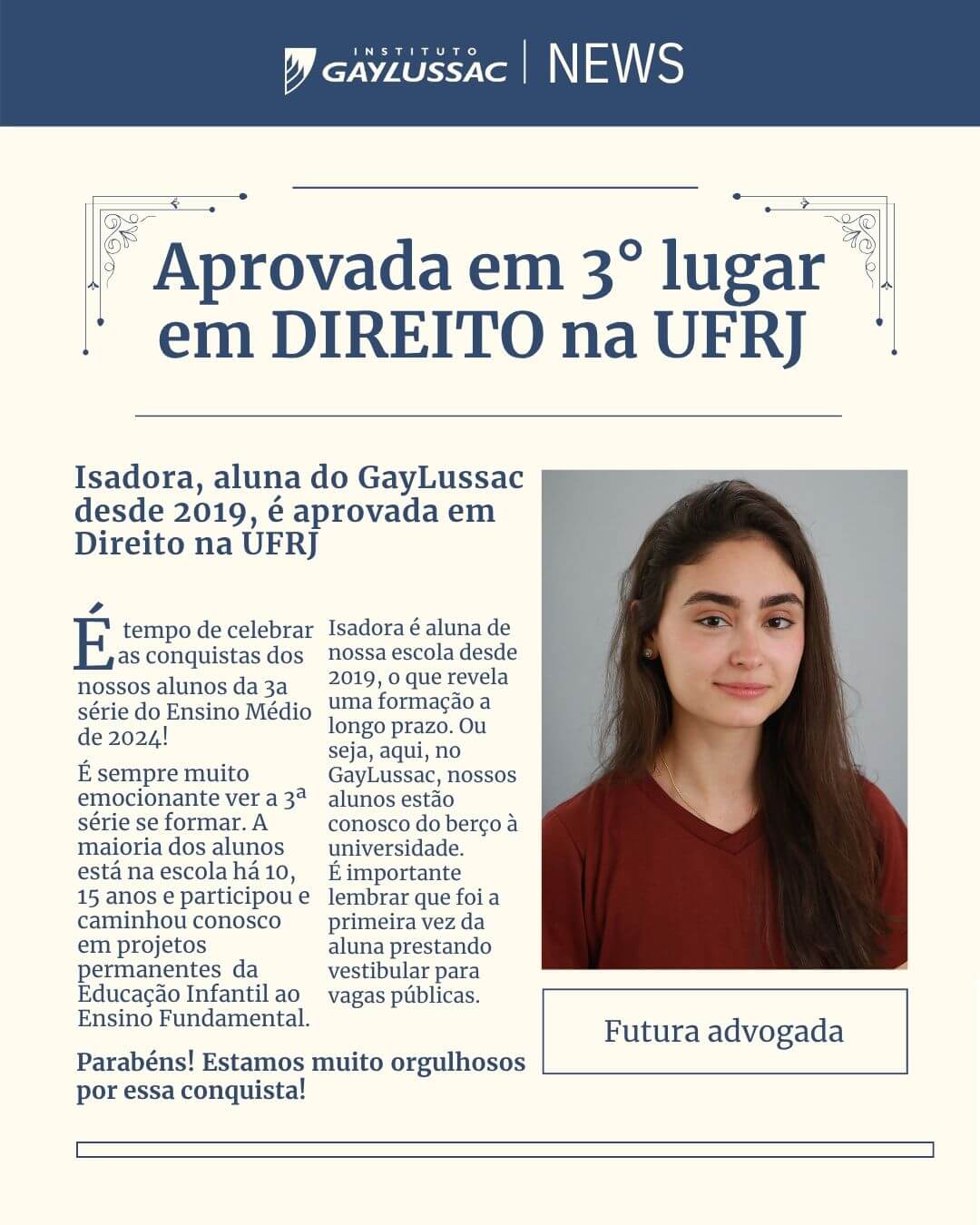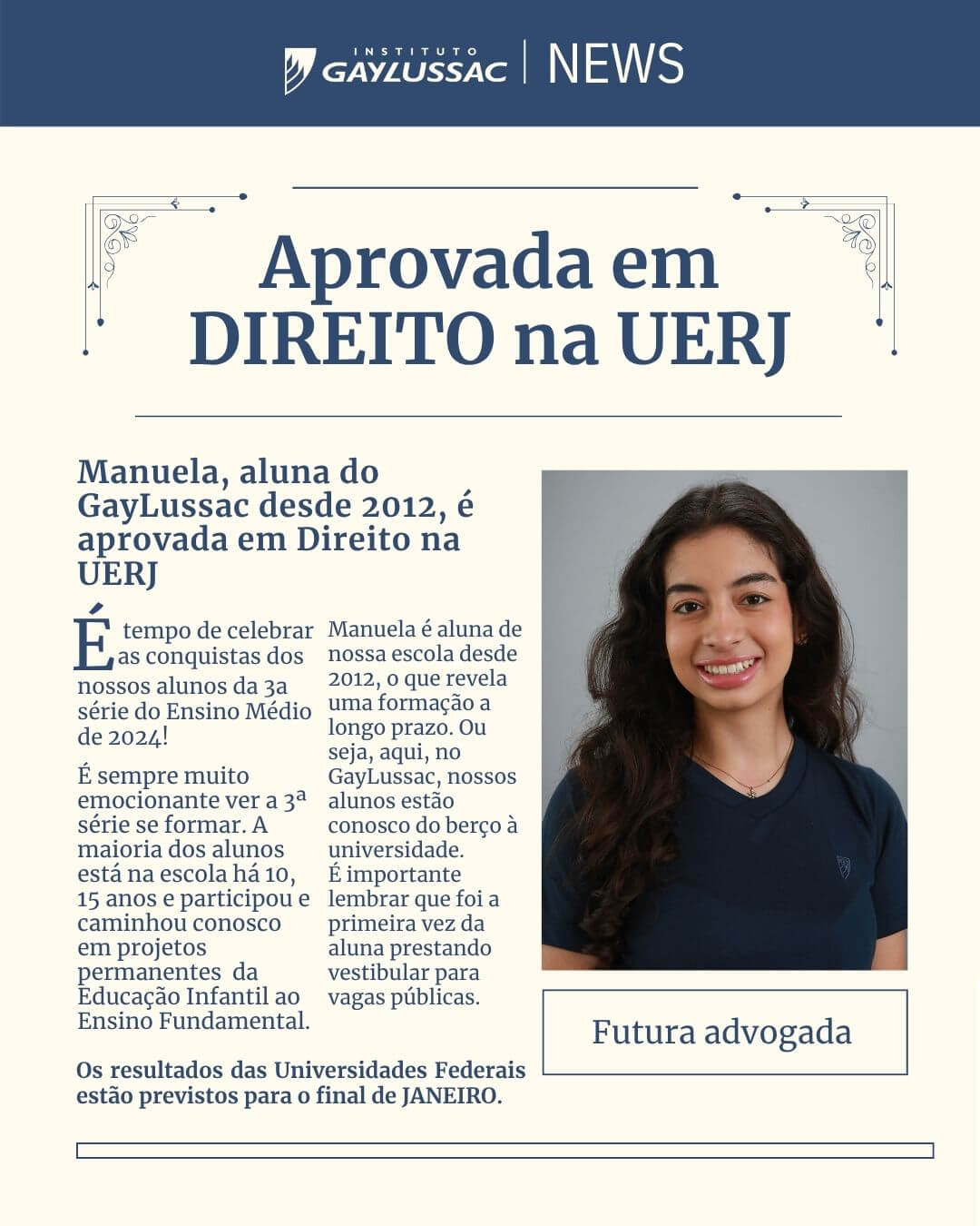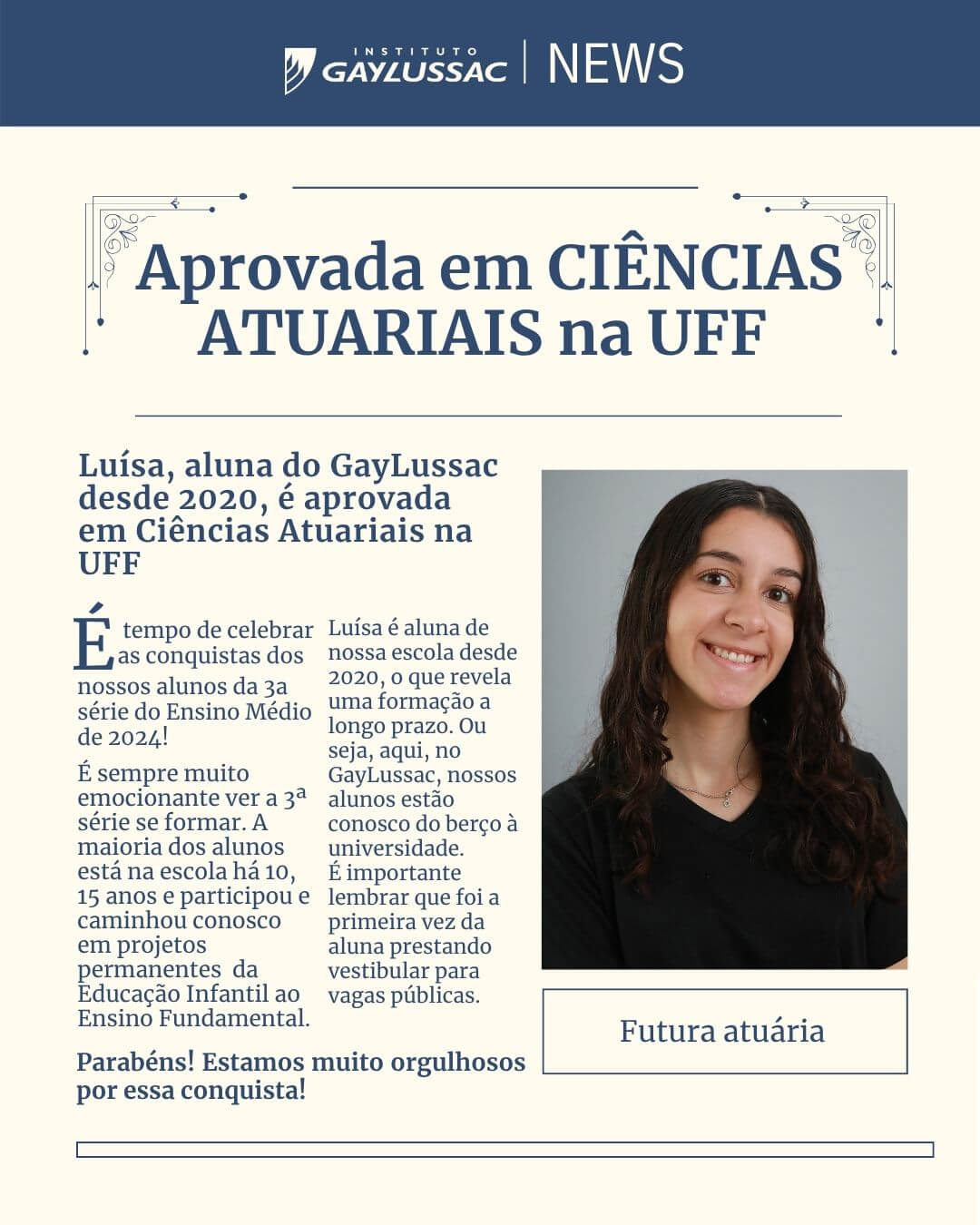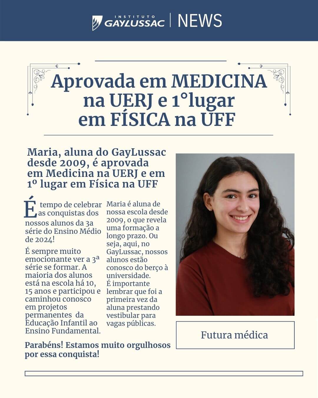 O Instituto GayLussac tem o orgulho de anunciar os resultados das aprovações de seus alunos da 3ª série do Ensino Médio em 2024. Foram 151 vagas conquistadas em universidades públicas, privadas e internacionais, por 77 alunos com apenas 17 anos. Um marco que comprova a força do nosso projeto pedagógico, pautado na excelência acadêmica, na formação crítica e na valorização do protagonismo juvenil.