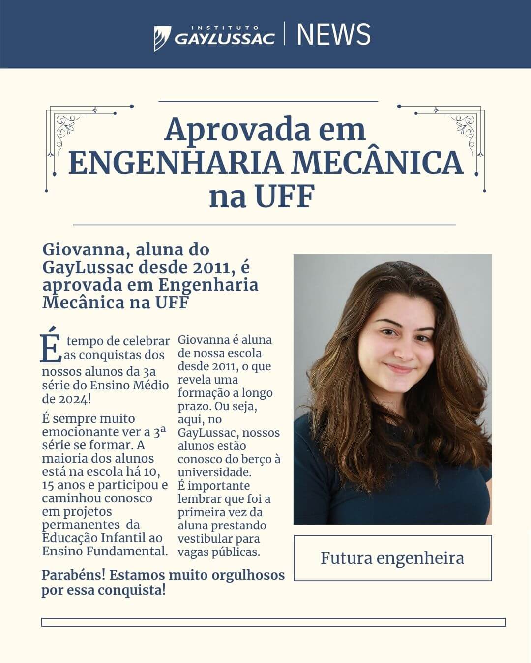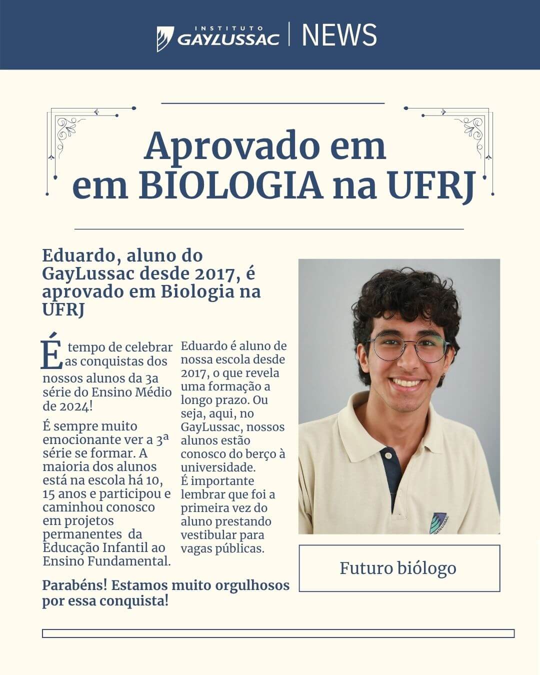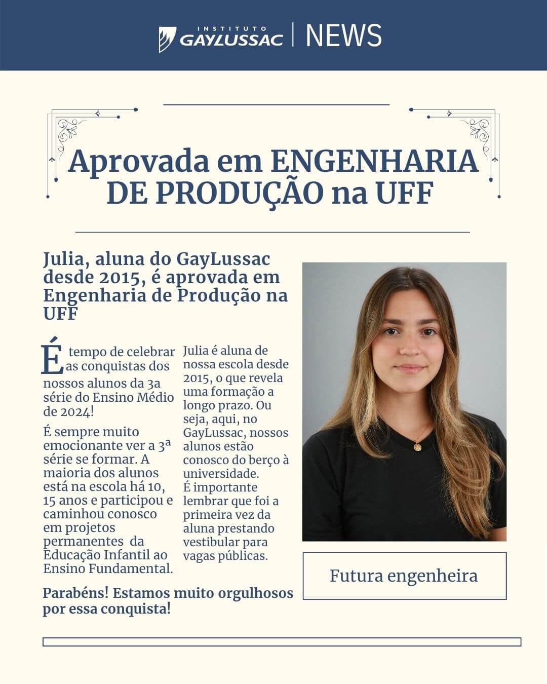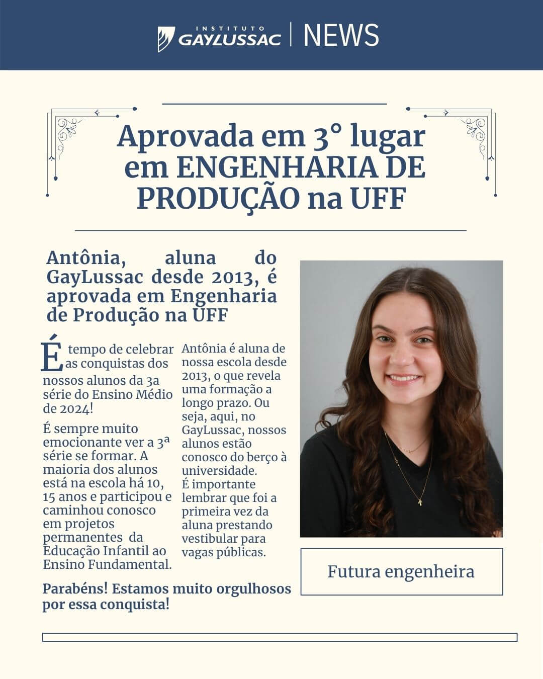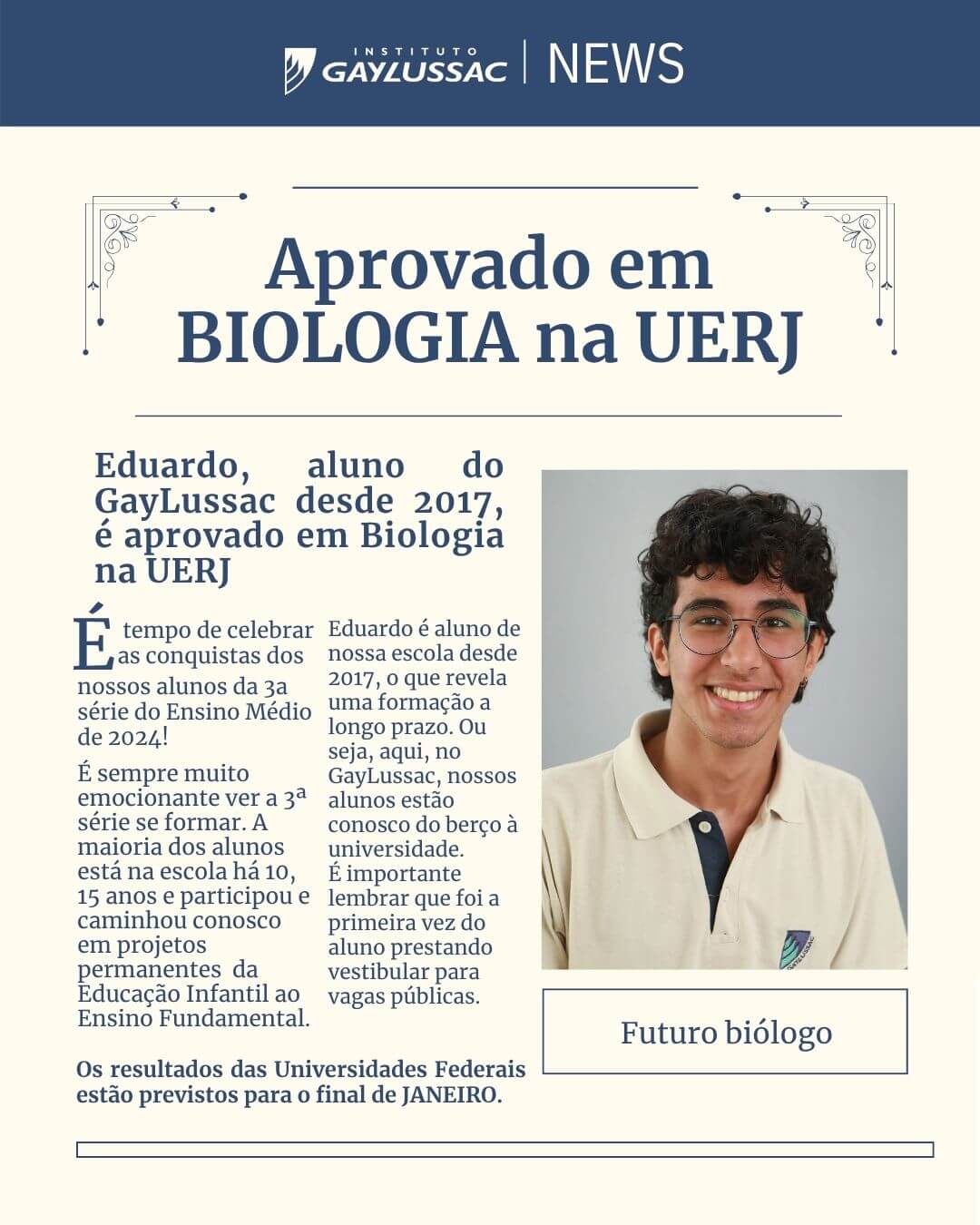 O Instituto GayLussac tem o orgulho de anunciar os resultados das aprovações de seus alunos da 3ª série do Ensino Médio em 2024. Foram 151 vagas conquistadas em universidades públicas, privadas e internacionais, por 77 alunos com apenas 17 anos. Um marco que comprova a força do nosso projeto pedagógico, pautado na excelência acadêmica, na formação crítica e na valorização do protagonismo juvenil.