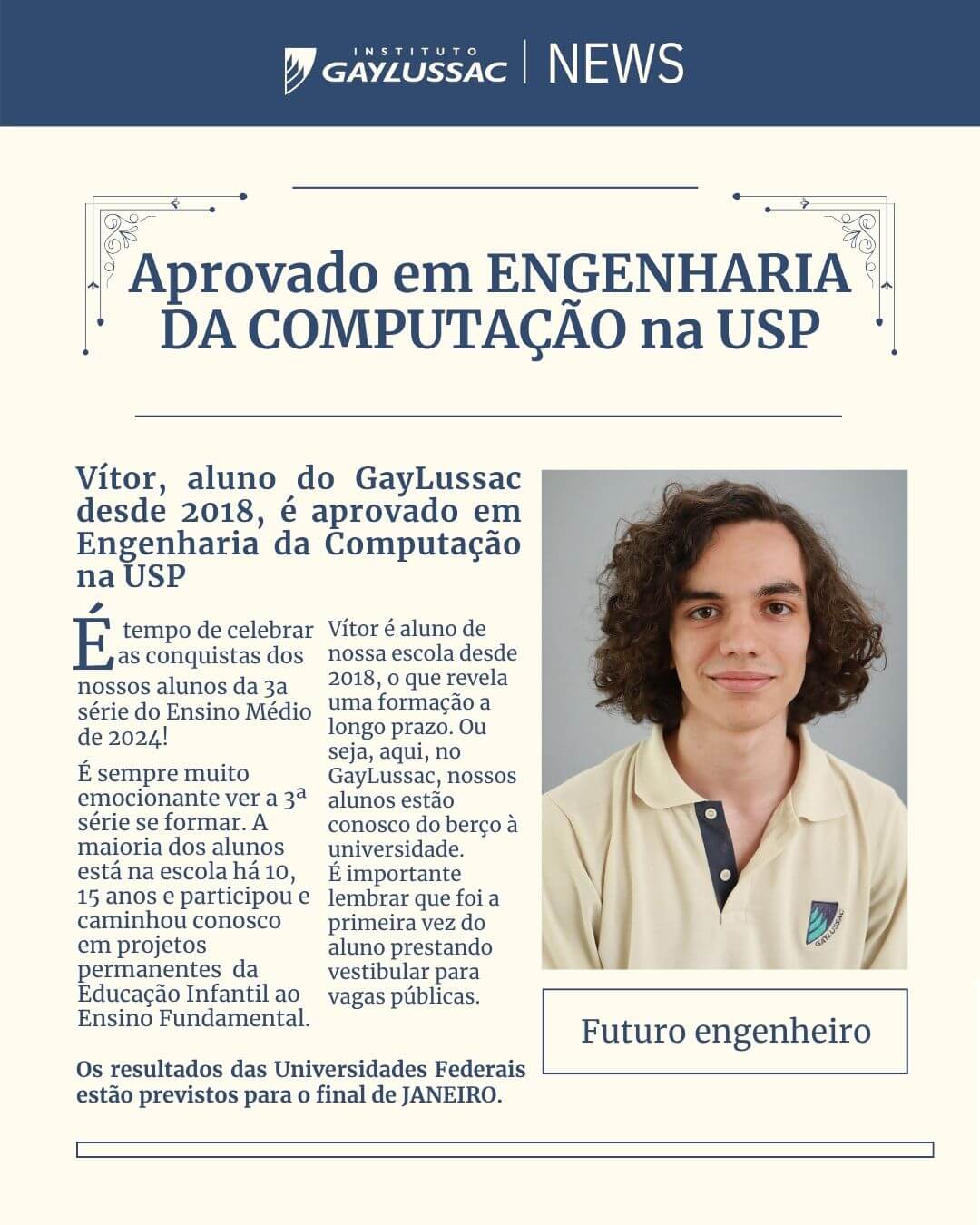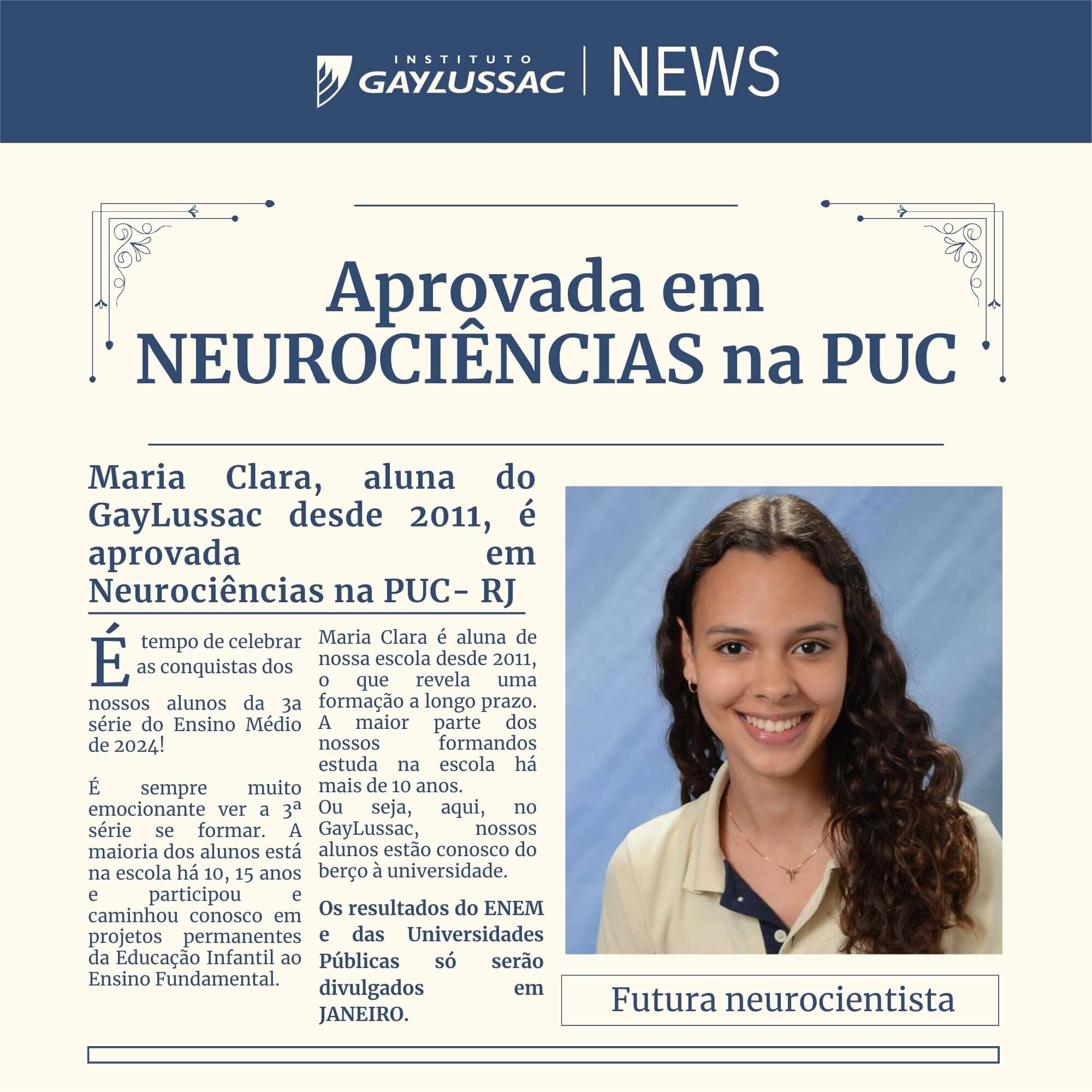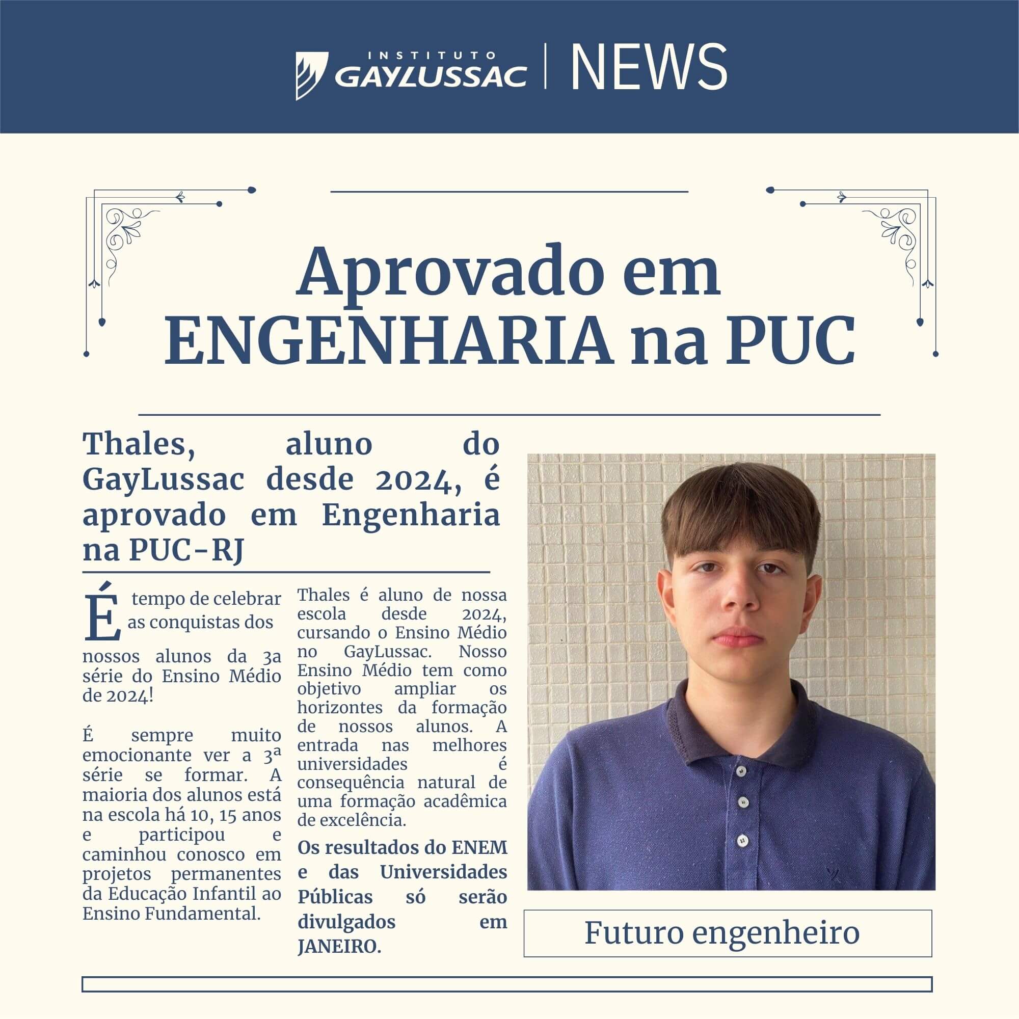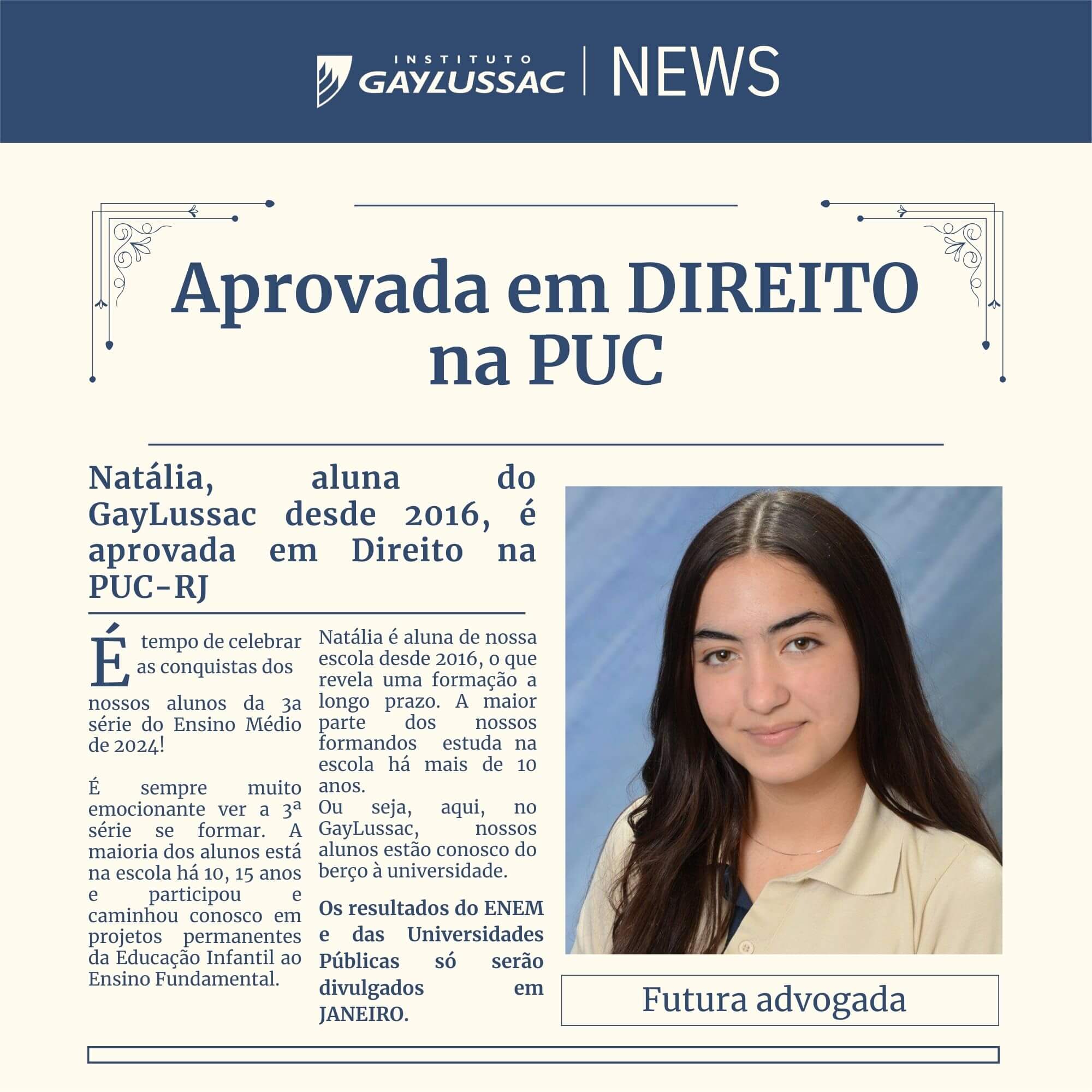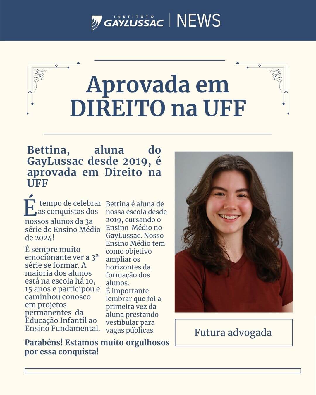 O Instituto GayLussac tem o orgulho de anunciar os resultados das aprovações de seus alunos da 3ª série do Ensino Médio em 2024. Foram 151 vagas conquistadas em universidades públicas, privadas e internacionais, por 77 alunos com apenas 17 anos. Um marco que comprova a força do nosso projeto pedagógico, pautado na excelência acadêmica, na formação crítica e na valorização do protagonismo juvenil.