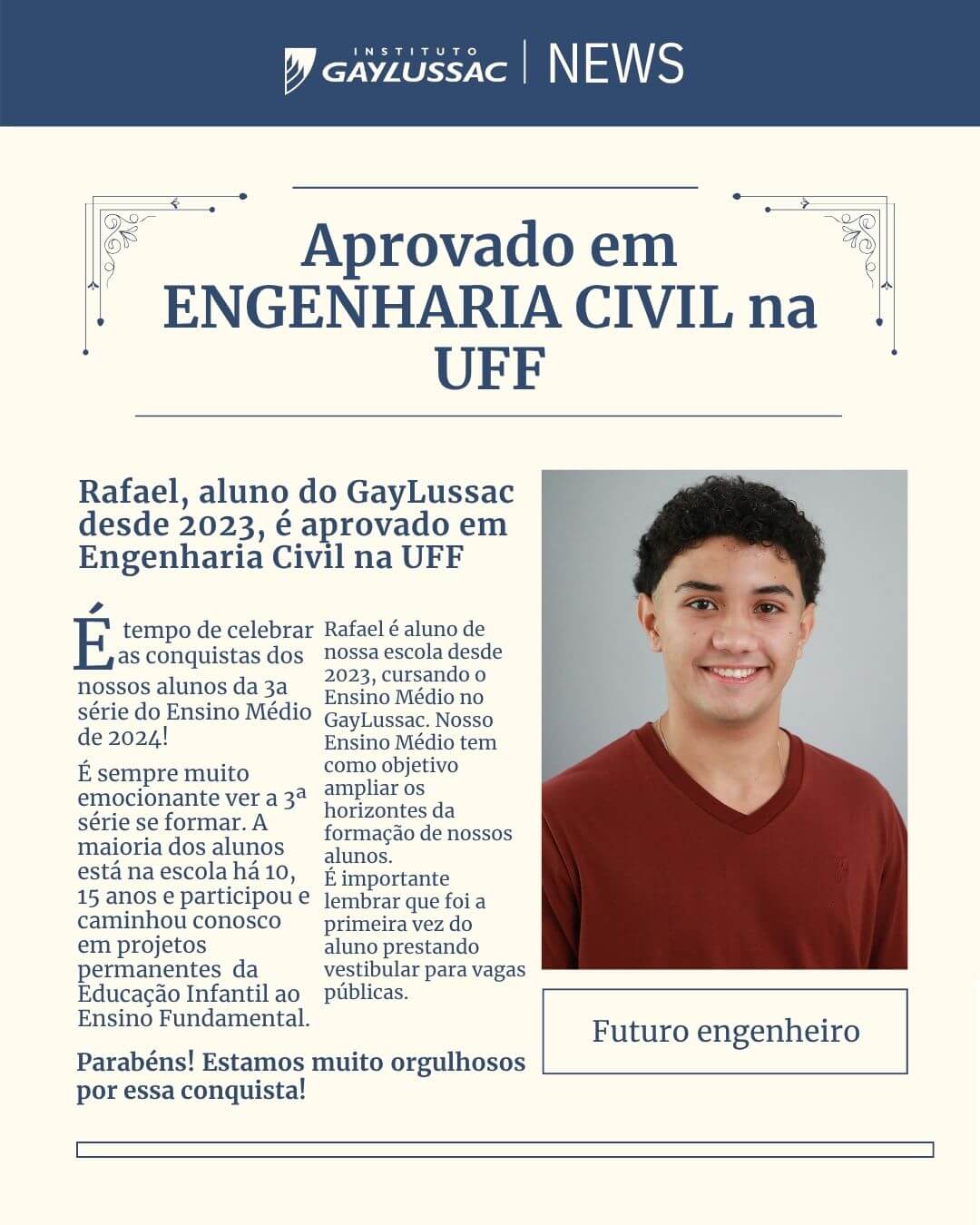 Nossos alunos também foram aprovados em diversas carreiras como Direito, Engenharia, Jornalismo e Relações Internacionais na UFF e na UFRJ.