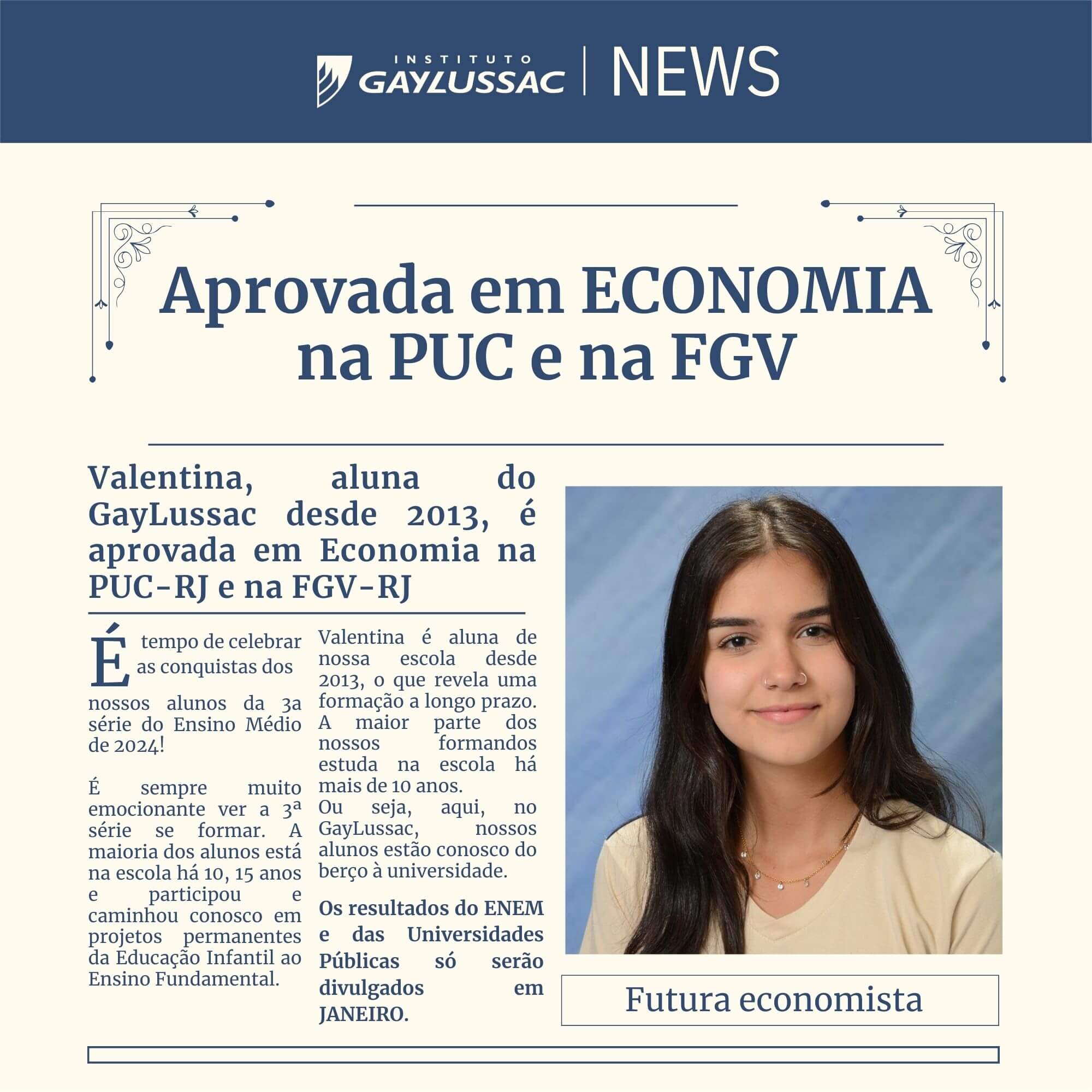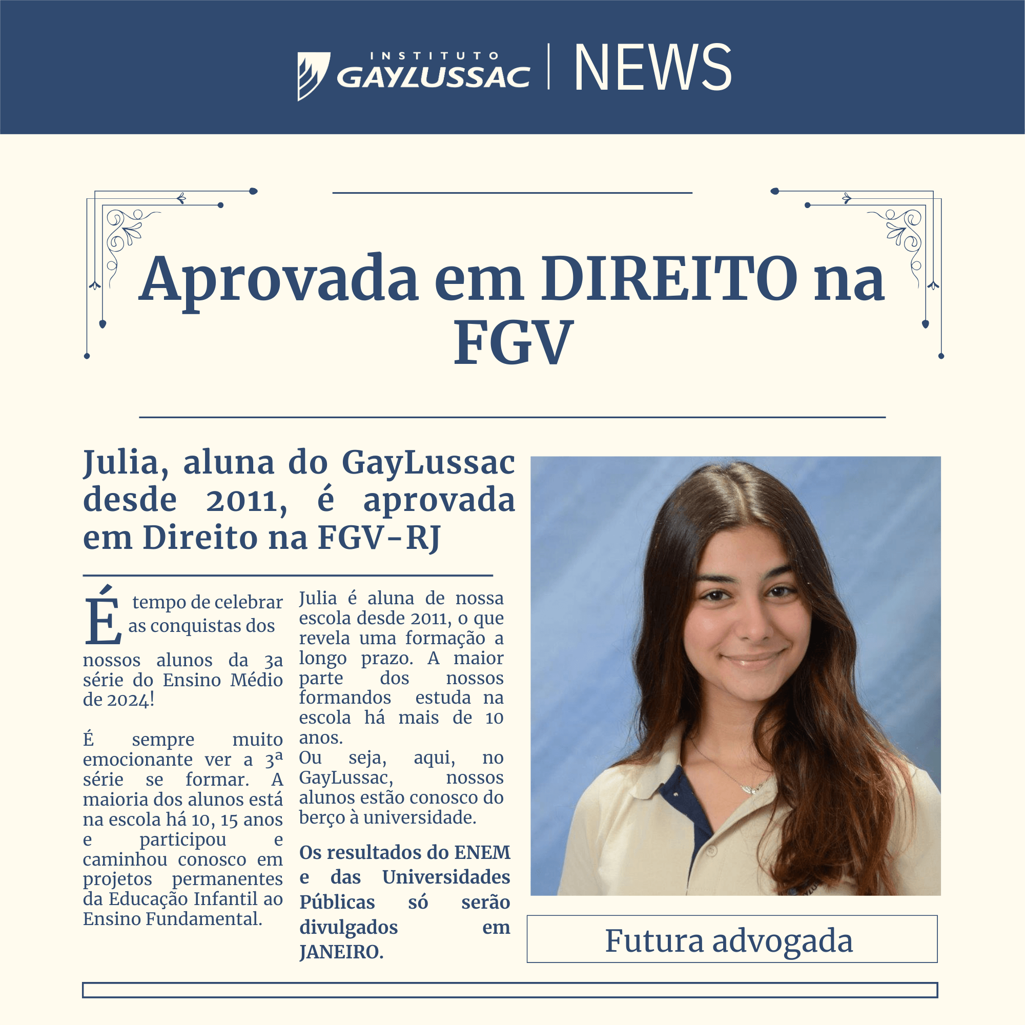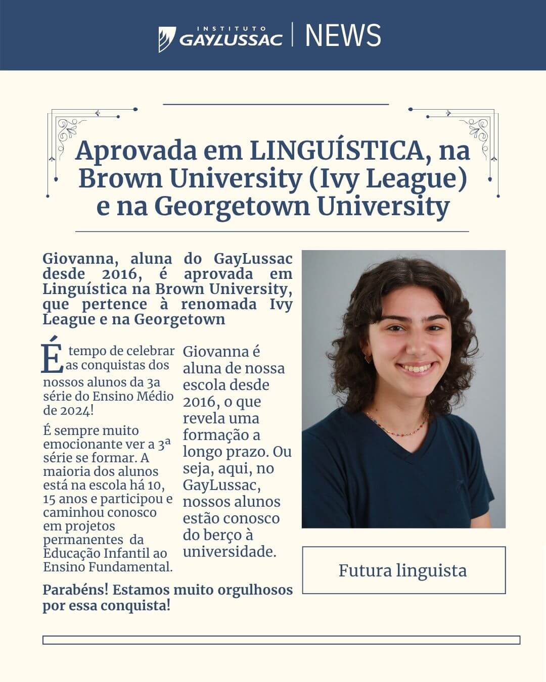 Nesse sentido, Giovanna Longo, aluna do colégio desde 2016, aprovada em 10 universidades internacionais e na Brown University, uma das instituições que compõem a Ivy League, nos Estados Unidos. Sua trajetória no GayLussac é exemplo de engajamento e excelência: fundadora do MOG (Modelo Diplomático do GayLussac), premiada em olimpíadas científicas nacionais e internacionais, com publicações em três idiomas e aprovações nos exames de proficiência CAE (Inglês) e DELE (Espanhol), ambos no nível C1. A conquista de Giovanna traduz o que há de mais inspirador em nossa missão: formar jovens prontos para os desafios globais, sem abrir mão de suas raízes e valores.
