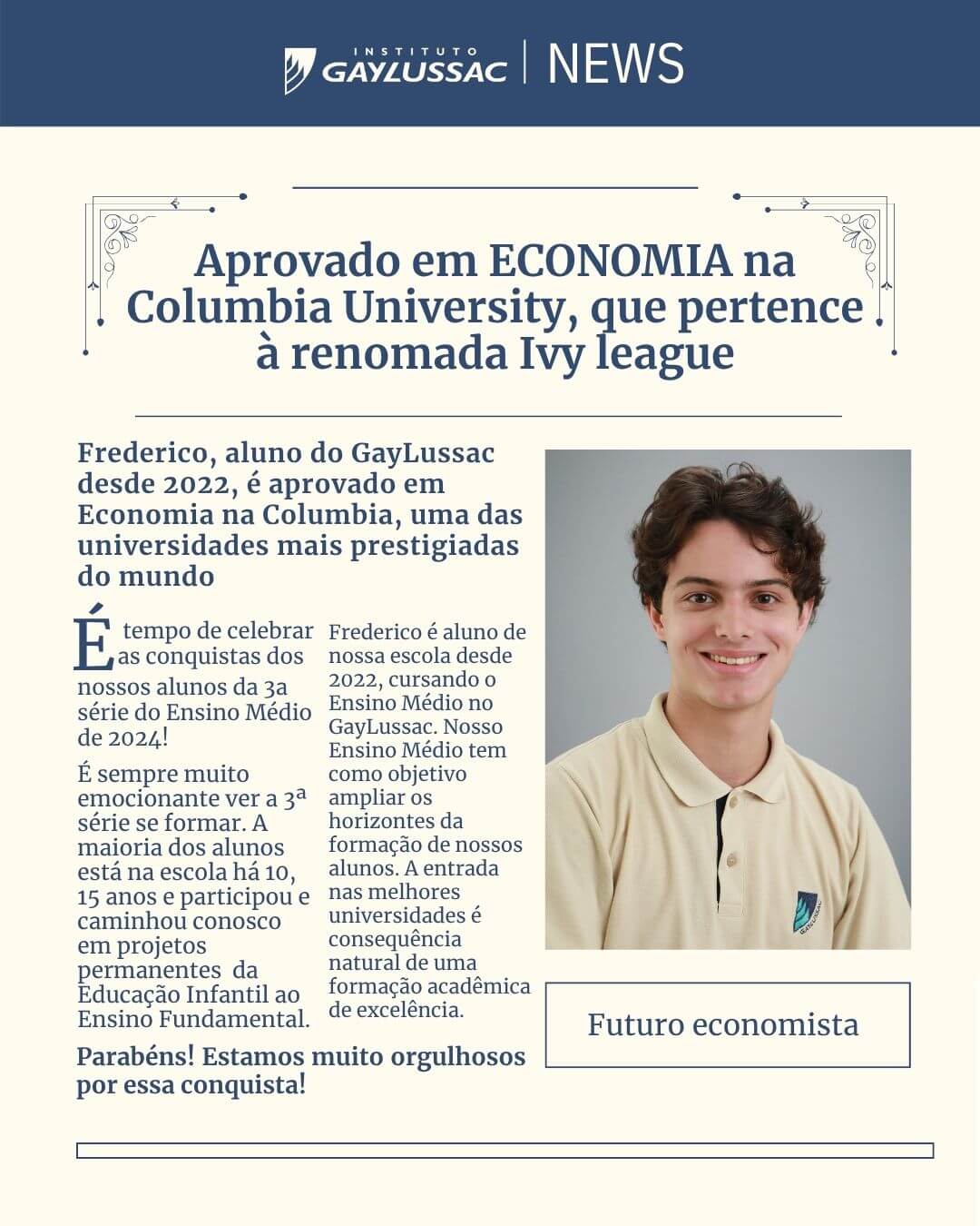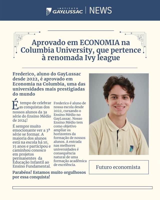 Ademais, outro grande destaque é Frederico Aversa, aprovado na Economia na Columbia University, também parte integrante da renomada Ivy League. Frederico também trilhou um percurso marcado por protagonismo acadêmico, envolvimento em projetos interdisciplinares e domínio de línguas estrangeiras, elementos centrais no processo de admissão em instituições internacionais de excelência.