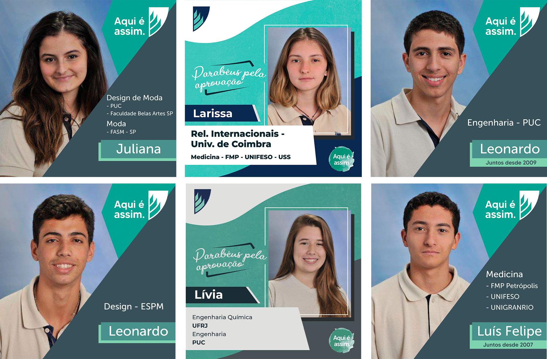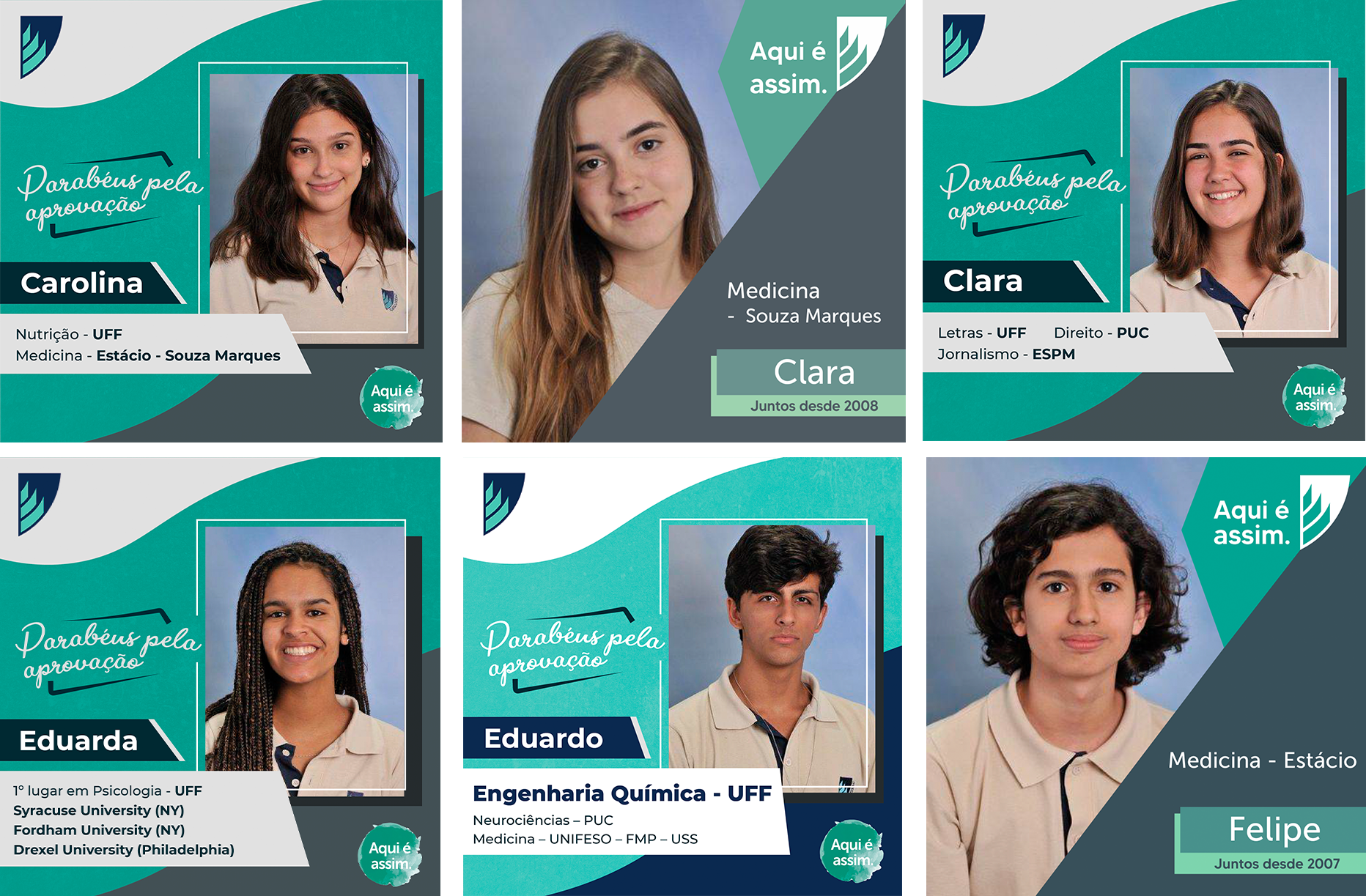 Os alunos optaram por instituições públicas e particulares e conquistaram vagas não apenas nas tradicionais UFF, UFRJ, UERJ, UFRRJ, CEFET, mas também em faculdades fora do Estado, como USP, UNICAMP e UNESP. Nas particulares, tivemos aprovações em universidades de prestígio como FGV, PUC, ESPM, IBMEC e Souza Marques (Medicina).